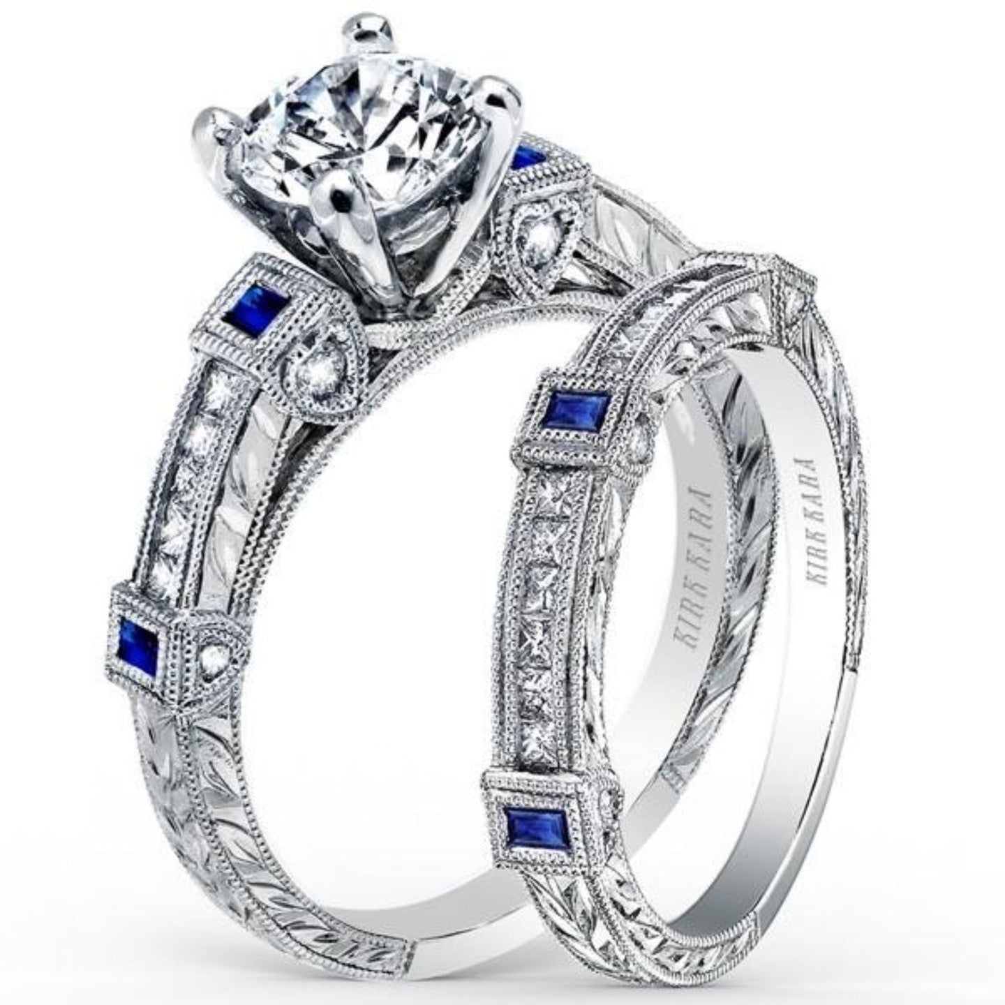 Kirk Kara "Carmella" Blue Sapphire Bezel Set Diamond Engagement Ring Featuring 0.25 Carats White Diamonds and 0.36 Carats Baguette Cut Blue Sapphires with Milgrain Detailing