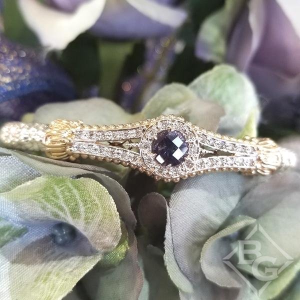 Vahan 4MM Two-Tone 14K Yellow Gold & Sterling Silver "Art Deco" Style Bangle Bracelet Featuring One Round Cut Purple Colored Iolite Gemstone and 0.28 Carats Total Diamond Weight Round Cut Diamonds