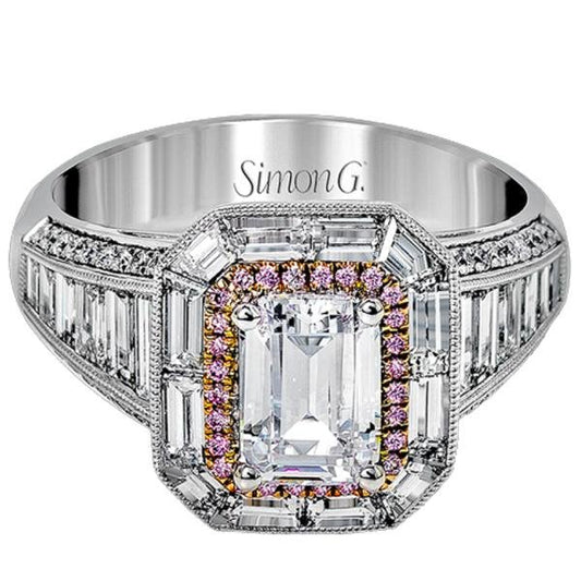 Simon G. Emerald Cut Two-Tone Halo Baguette Diamond Engagement Ring