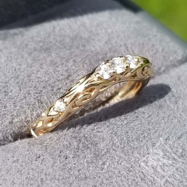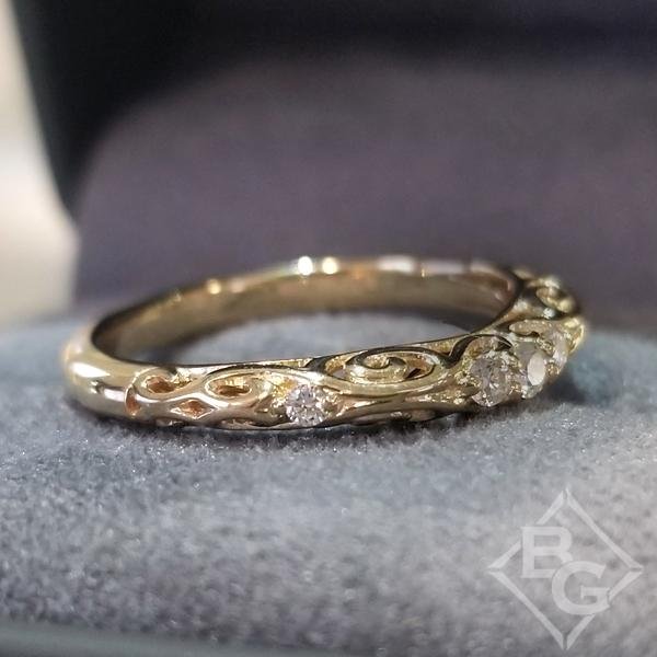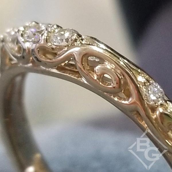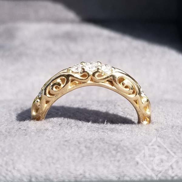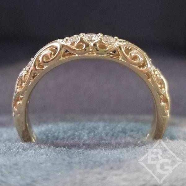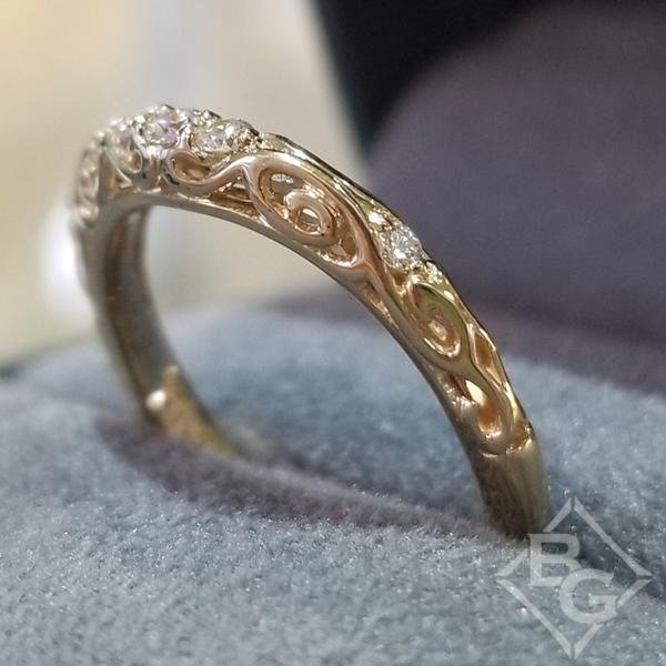 Artcarved Yellow Gold "Peyton" Curved Prong Set Diamond Filigree Wedding Band Featuring 0.11 Carats Total Weight Round Cut Diamonds