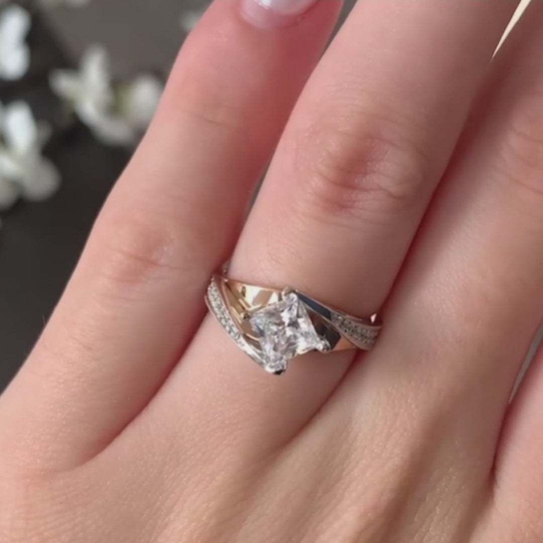 Dramatic, sure to catch the eye of many admirers this rose and white gold diamond engagement ring is artfully designed with a split shank with cathedral shoulders rising to the prong-set princess cut center stone, set on point. Pave set diamonds weighing 0.14 carats total weight adorn the shoulders and a bright polished gallery adds a dramatic contemporary feel.