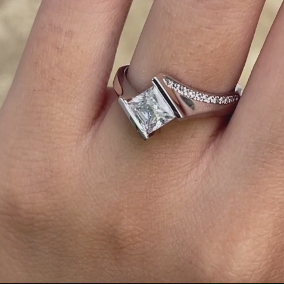 Barkev’s has hit the mark with this bold contemporary twist on a vintage bypass ring. This unique, diamond engagement ring is simply stunning. The channel-set, princess-cut center stone is captured in the split, tension-set like half bezel, while prongs-set round cut white diamonds accent the shank's edge. A bright, polished shank creates a stunningly elegant look. Shown here with a 1.00 carat princess cut center stone (sold separately - measures approx. 5.5mm), and priced with a center cubic zirconia, you can customize this beautiful ring with a diamond, moissanite or gemstone in a size and cut of your choice. Also choose from a setting in palladium, platinum, 14K or 18K white, yellow or rose gold.