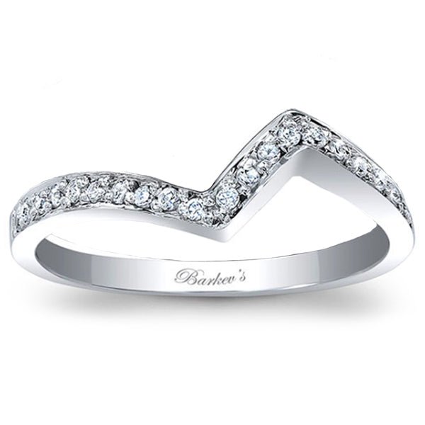Barkev’s has hit the mark with the matching band to their bold contemporary twist on a vintage bypass ring. This unique, diamond wedding band fits the engagement ring perfectly with prong set round cut diamonds following the curve and zig-zag of the engagement ring.