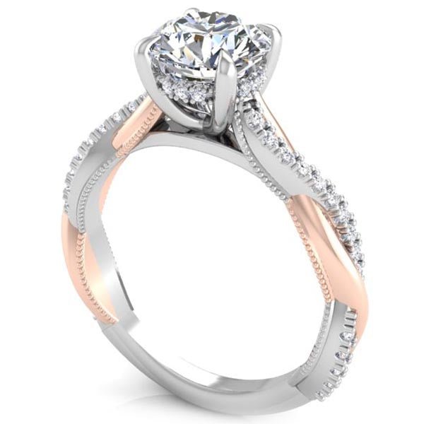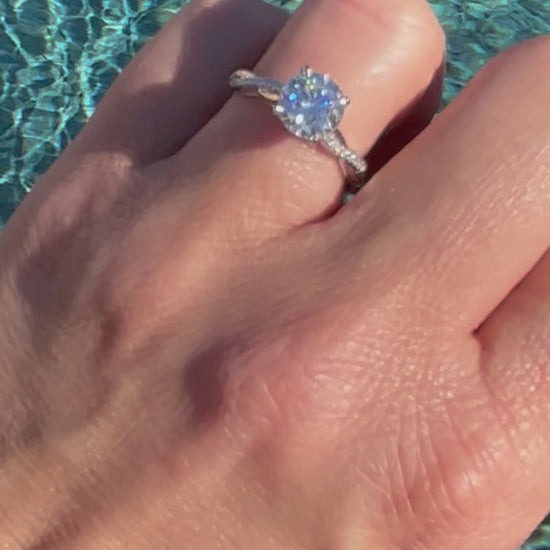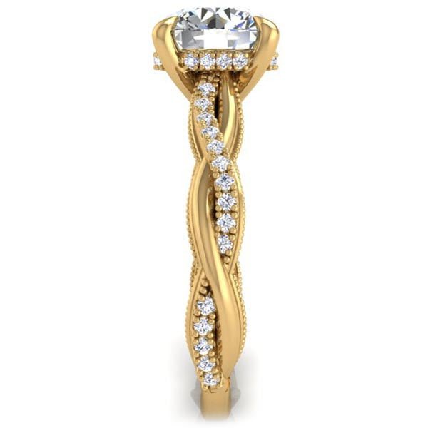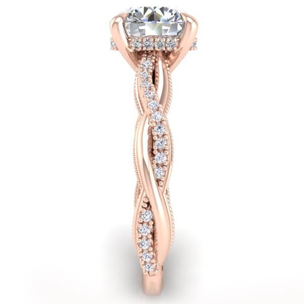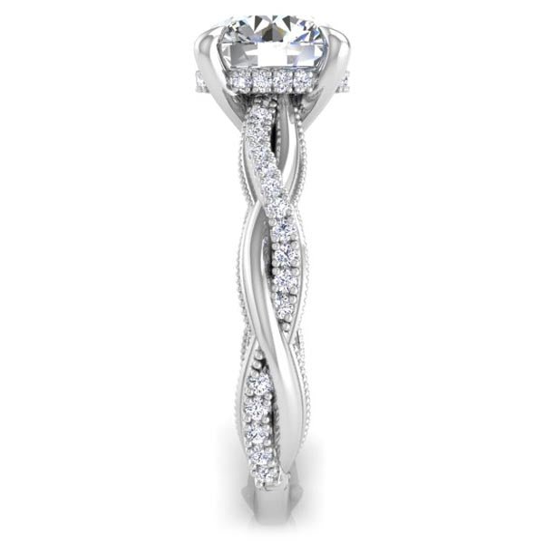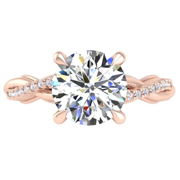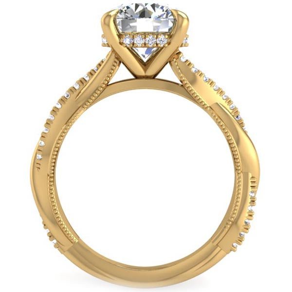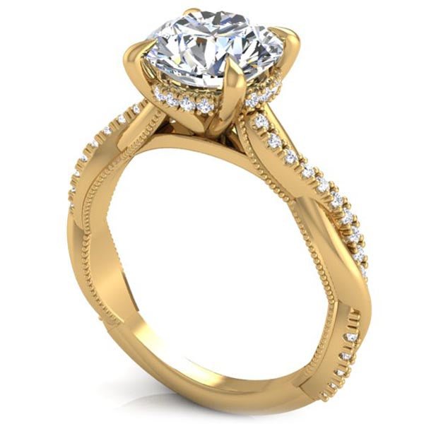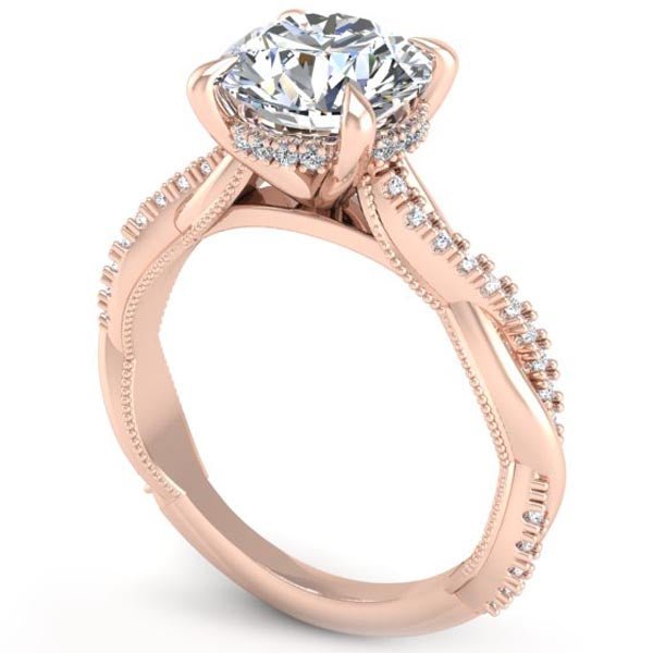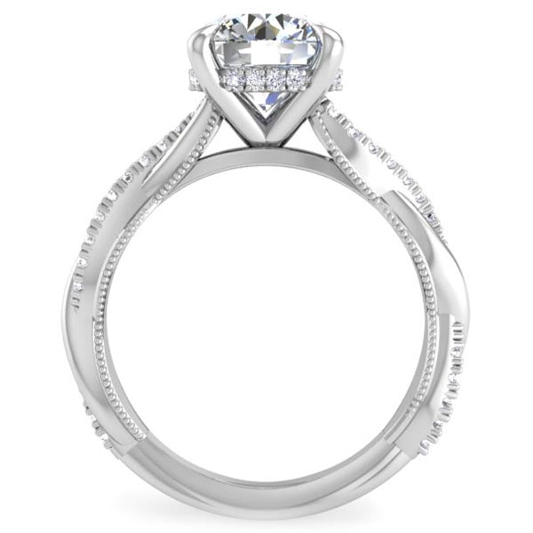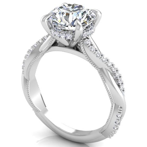 Exquisite craftsmanship graces the Ben Garelick twist diamond Luna engagement ring, which dazzles with 0.20 carats of round cut diamonds (lab or mined available) nestled in a twisted band and hidden halo and further accented with milgrain detailing. An impressive 2 carat round adorns the center held in with claw prongs, but this regal ring is crafted to your personal preference – any size or shape gemstone can sit atop!