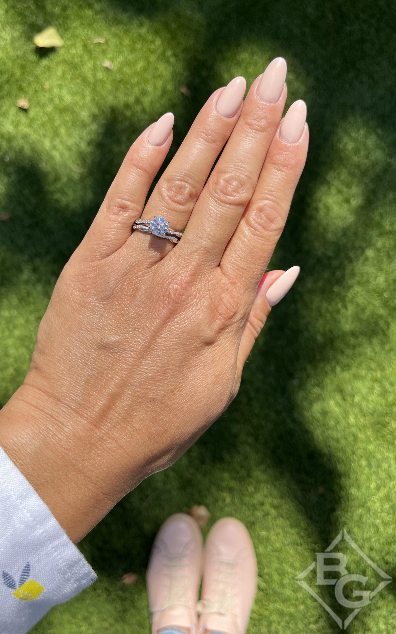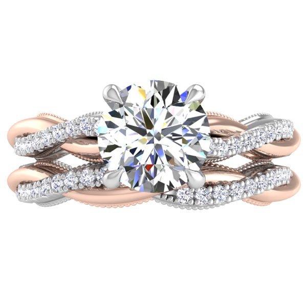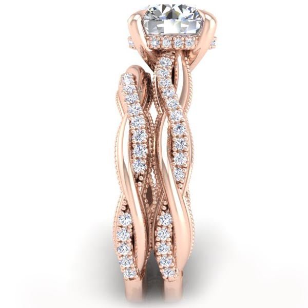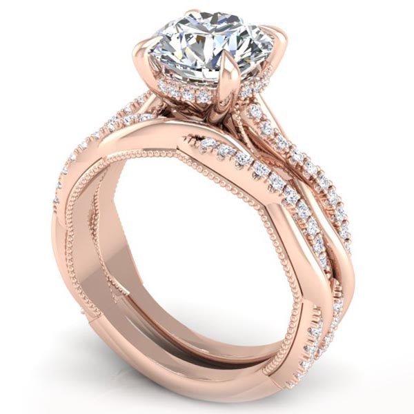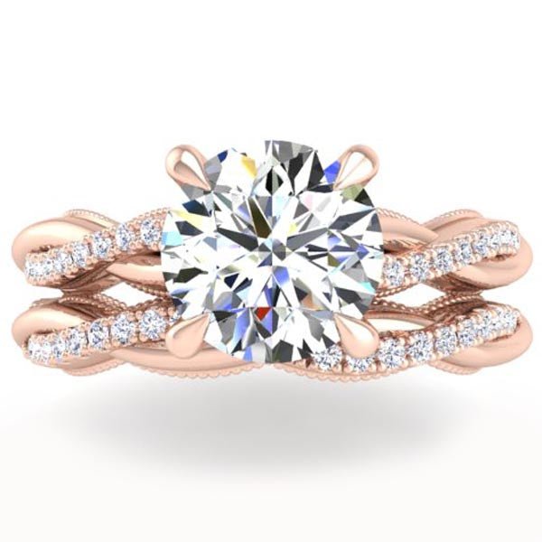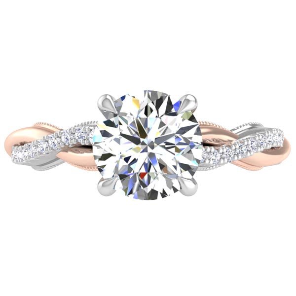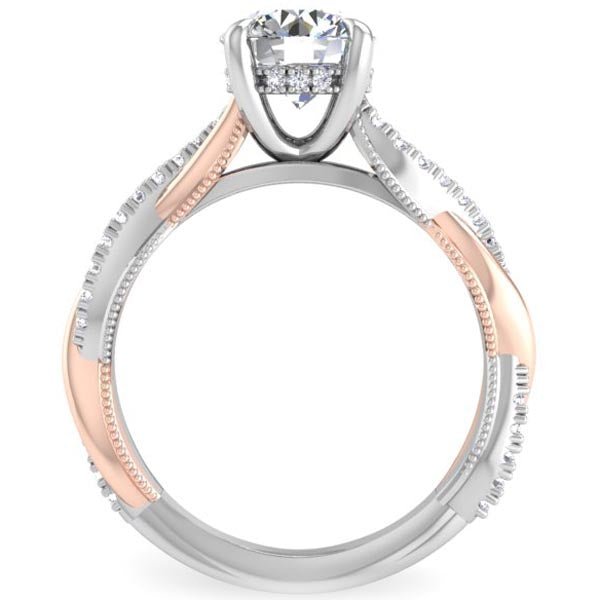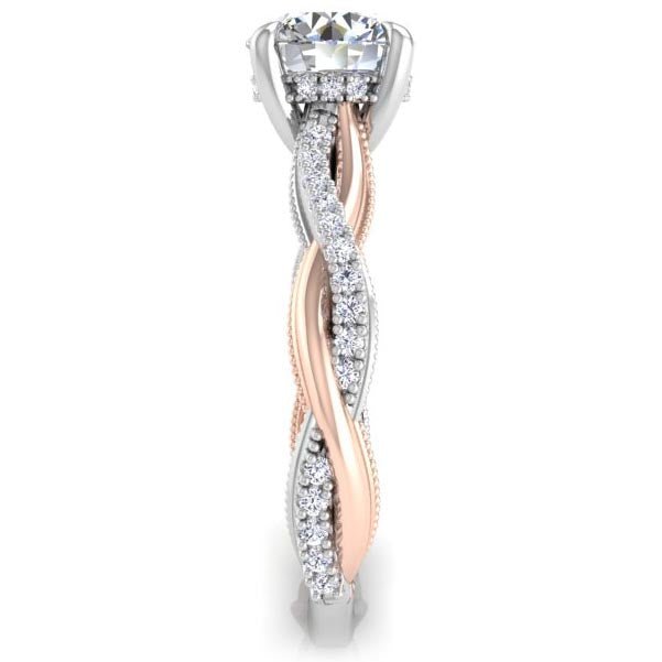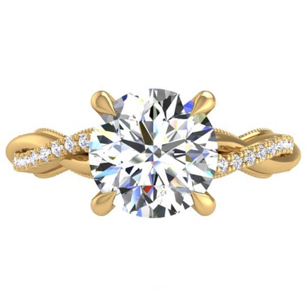 Exquisite craftsmanship graces the Ben Garelick twist diamond Luna engagement ring, which dazzles with 0.20 carats of round cut diamonds (lab or mined available) nestled in a twisted band and hidden halo and further accented with milgrain detailing. An impressive 2 carat round adorns the center held in with claw prongs, but this regal ring is crafted to your personal preference – any size or shape gemstone can sit atop!