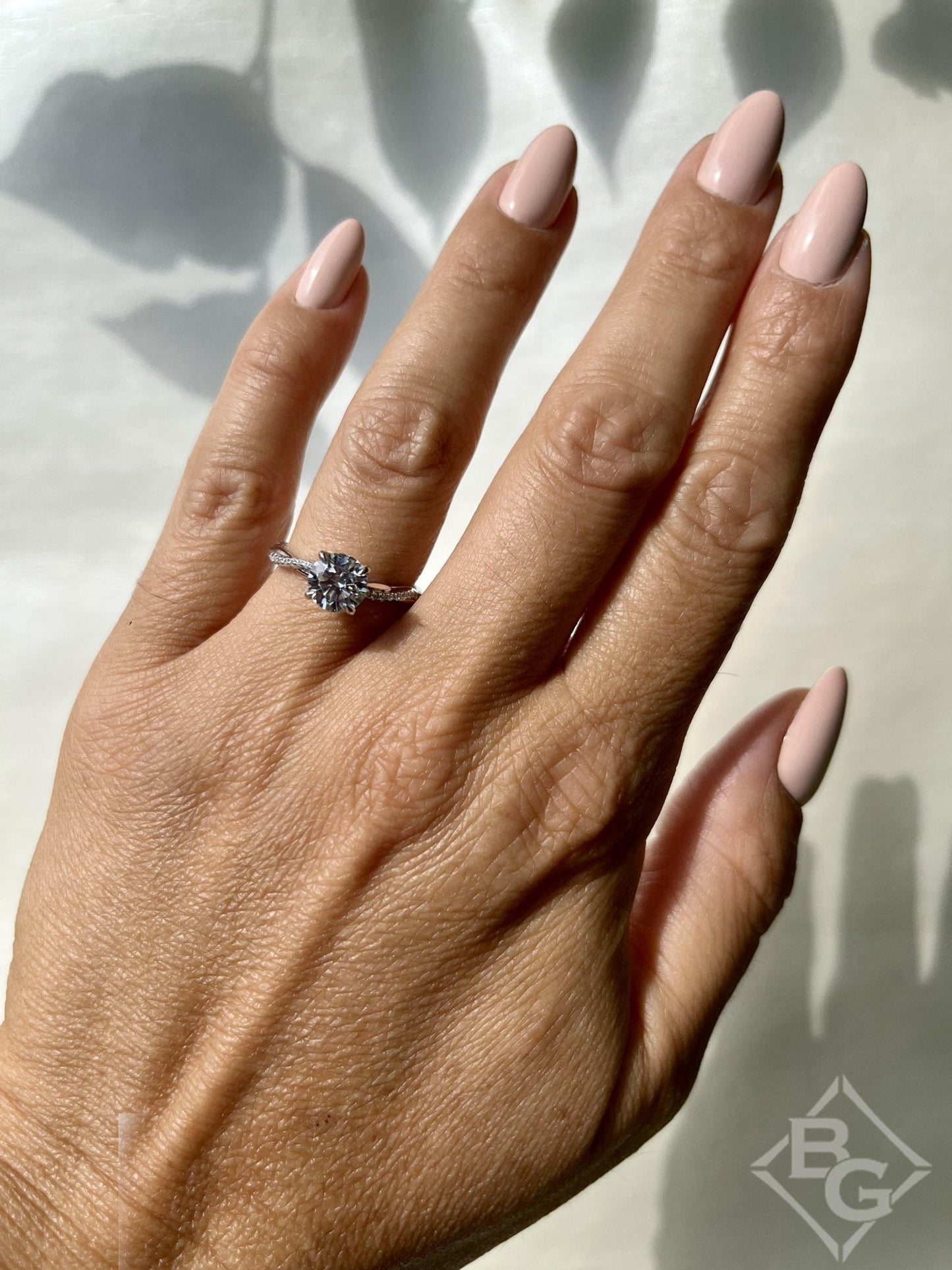 - Ring can be made to accommodate any size or shape diamond, Moissanite or gemstone. Shown with a 2.00 carat round cut center stone (approximately 8 x 8mm)