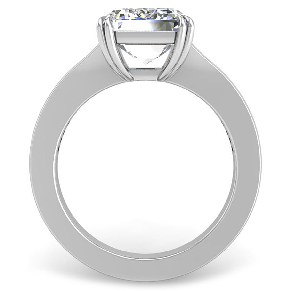 - Ring can be made to accommodate any size or shape diamond, Moissanite or gemstone. Shown with a 4.00 carat emerald cut center stone (10 x 7.5 MM) sold separately.