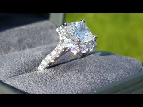 Video with ring is ring box shows ring with a large 3 carat cushion cut diamond center. Video of 360 degree rings has a 1 carat round center.