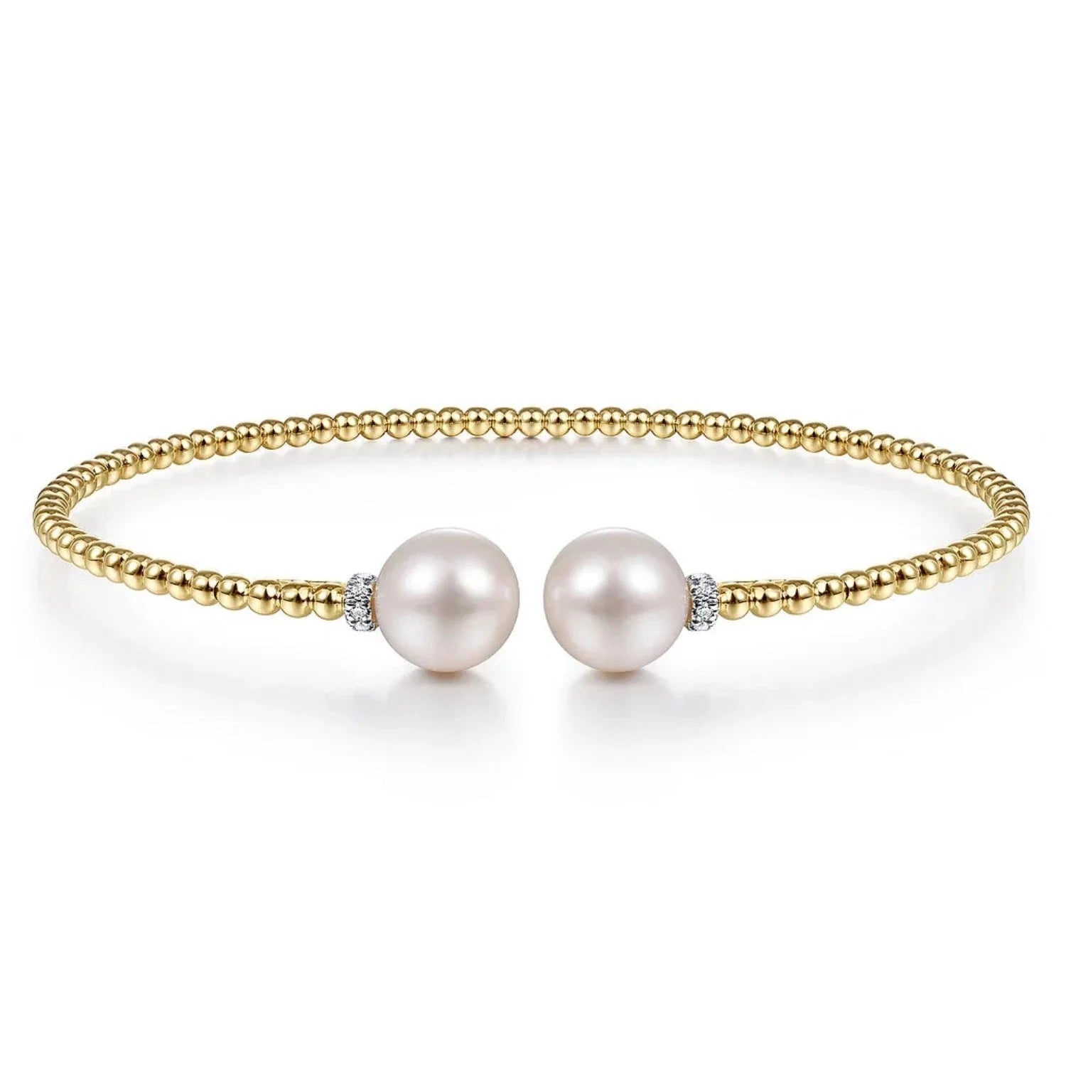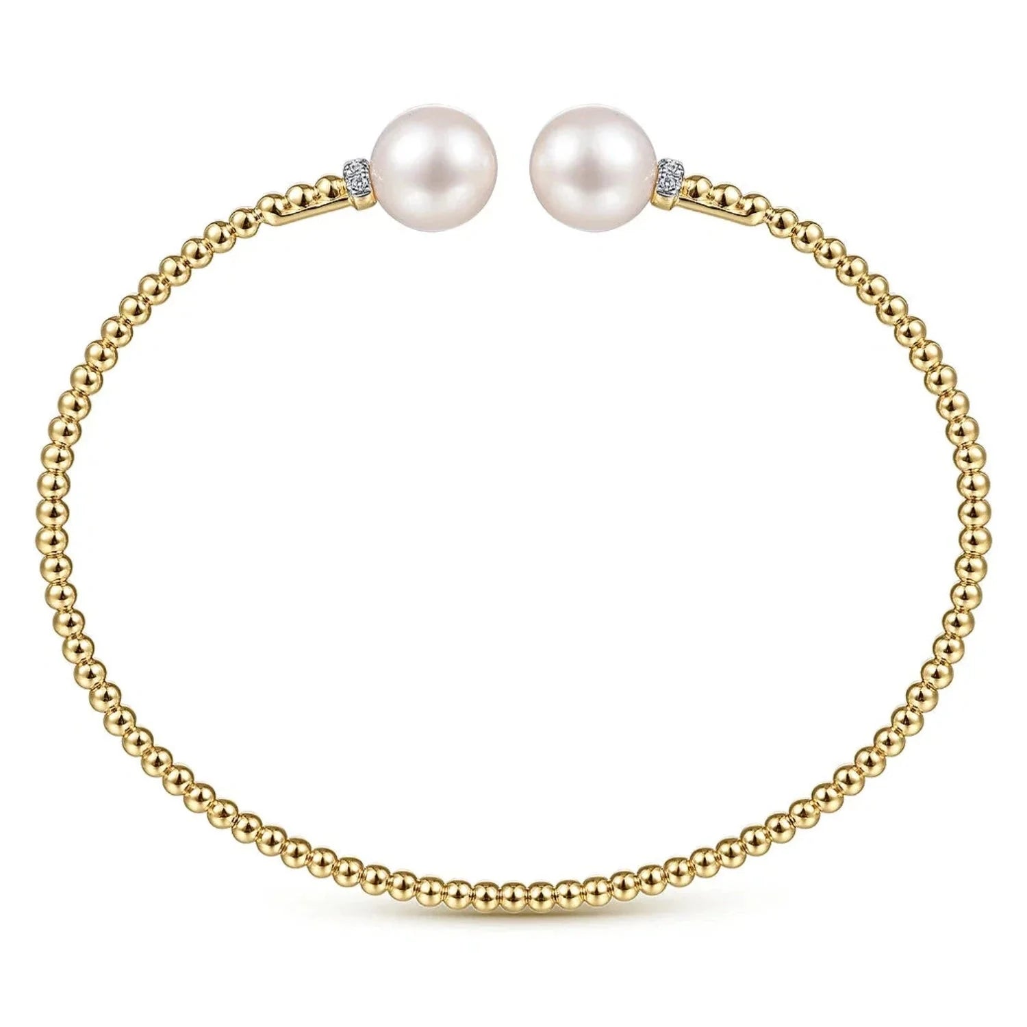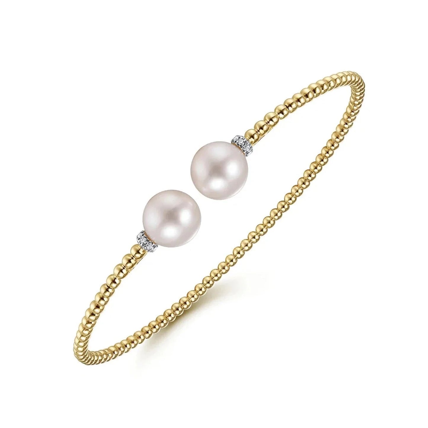 Dainty beading forms the base of this beautiful bangle, featuring small beads leading to elegant pearl caps. Adding an extra touch of sparkle, 0.04 carat diamonds are thoughtfully placed at the base of each cap, elevating this traditional Bujukan design. Perfect for accessorizing any timeless outfit, effortlessly complement your style with classic pearls and diamonds.