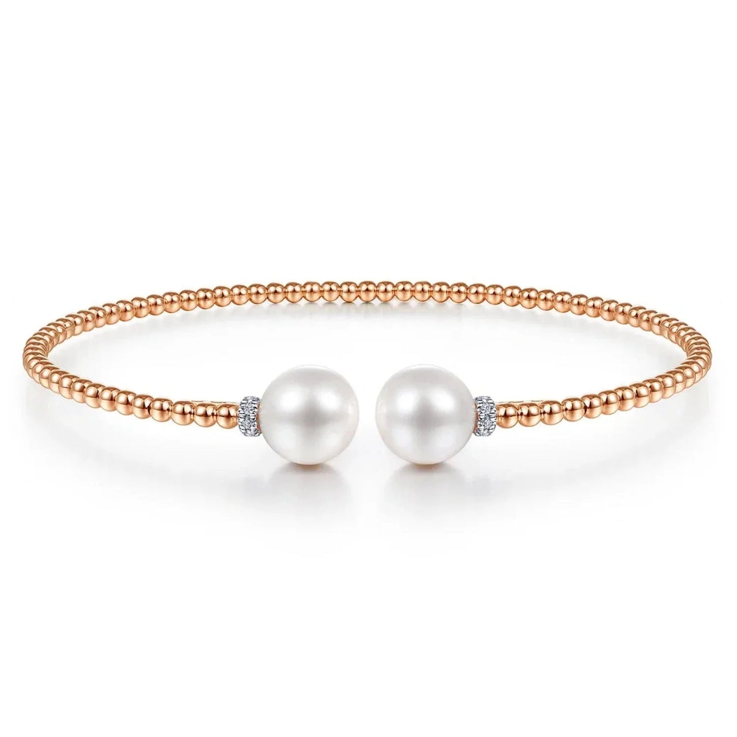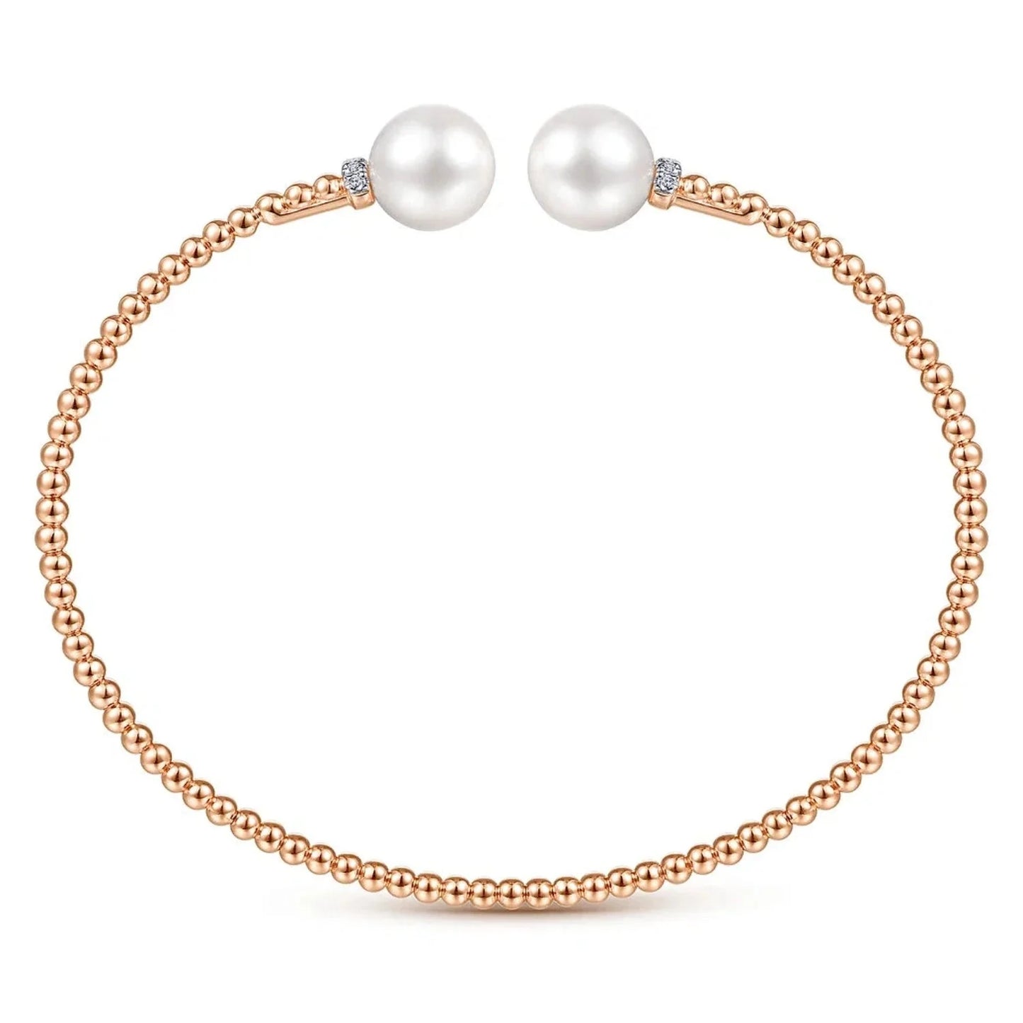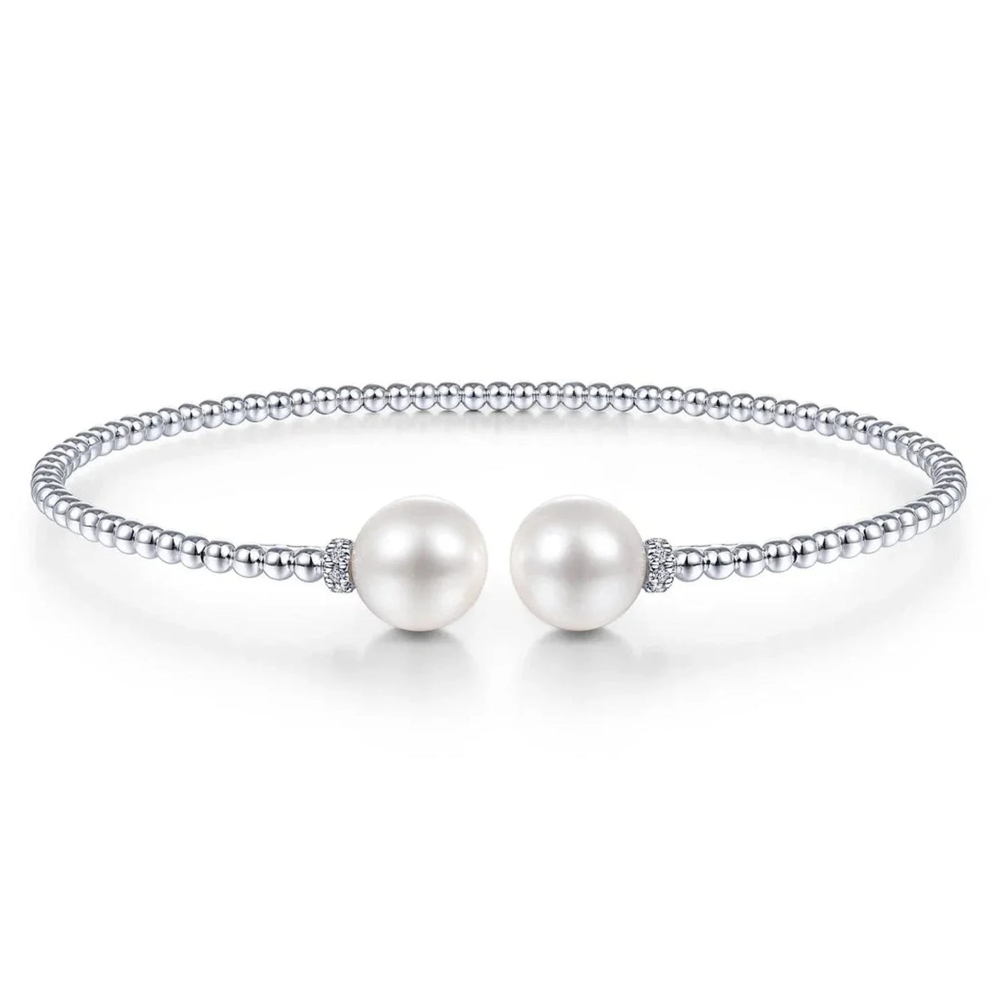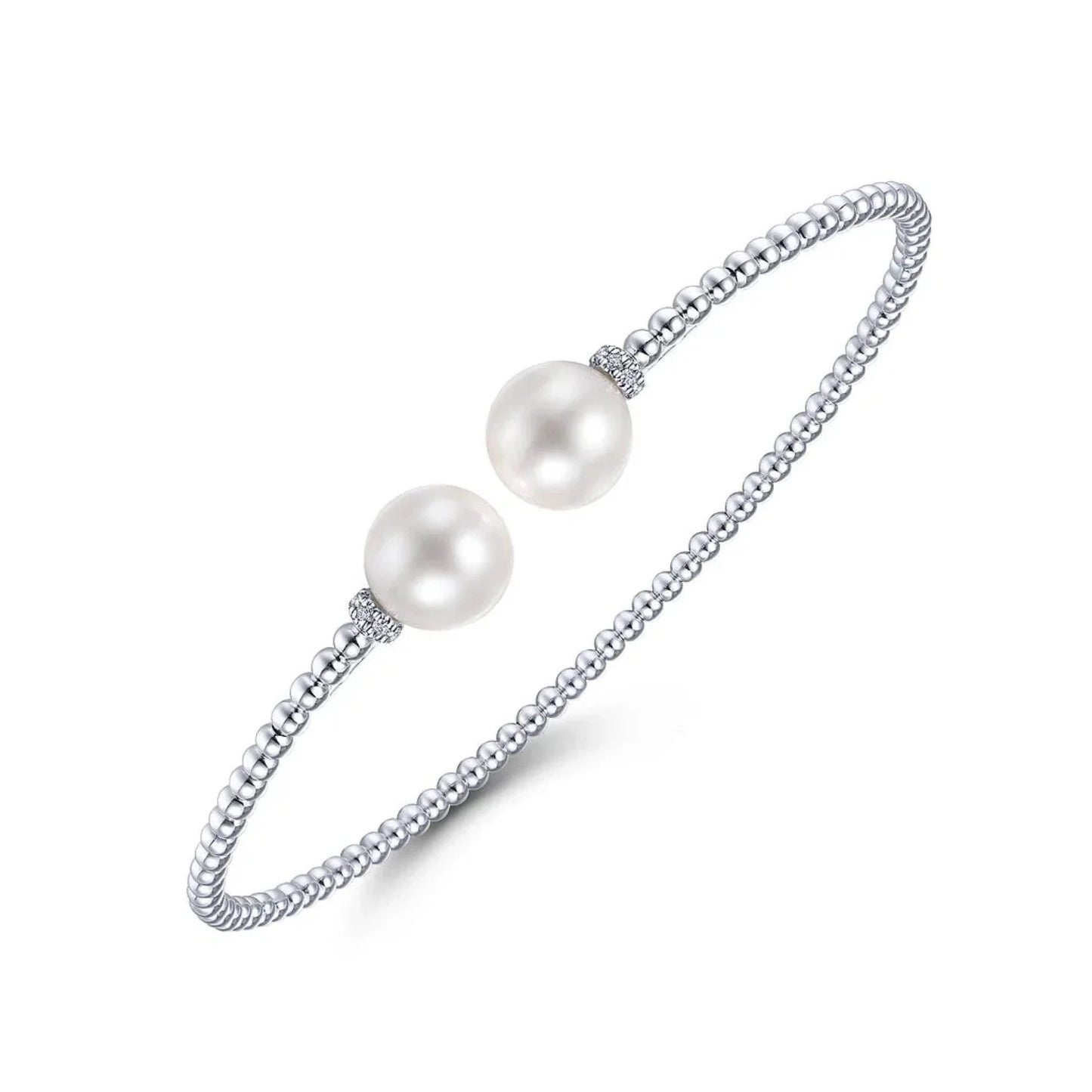 Dainty beading forms the base of this beautiful bangle, featuring small beads leading to elegant pearl caps. Adding an extra touch of sparkle, 0.04 carat diamonds are thoughtfully placed at the base of each cap, elevating this traditional Bujukan design. Perfect for accessorizing any timeless outfit, effortlessly complement your style with classic pearls and diamonds.