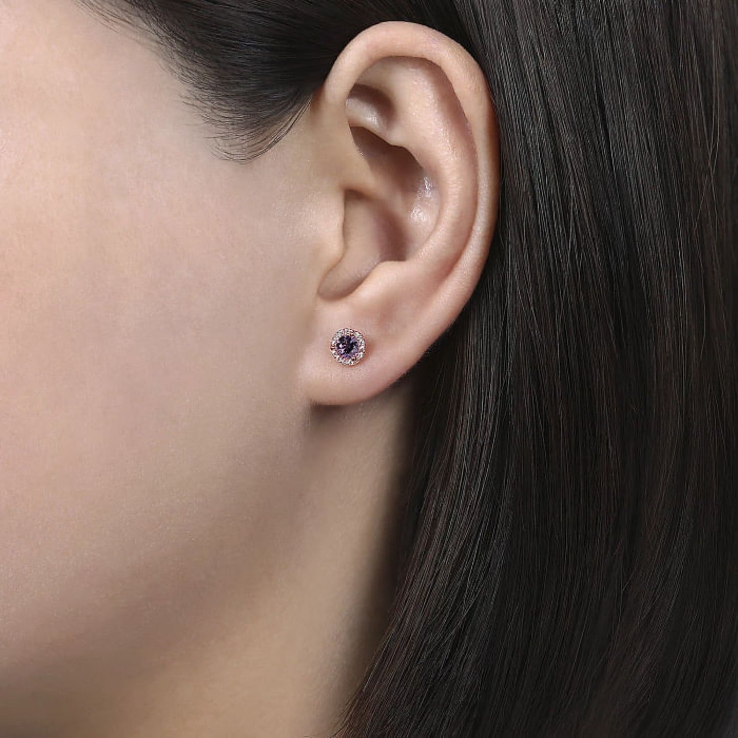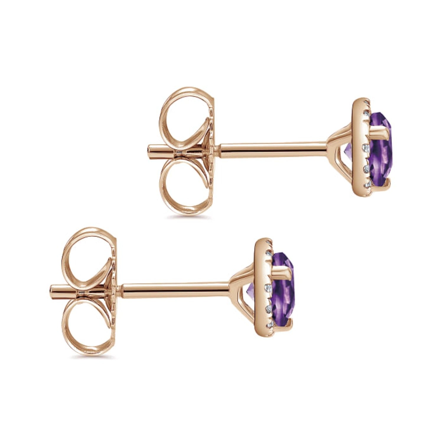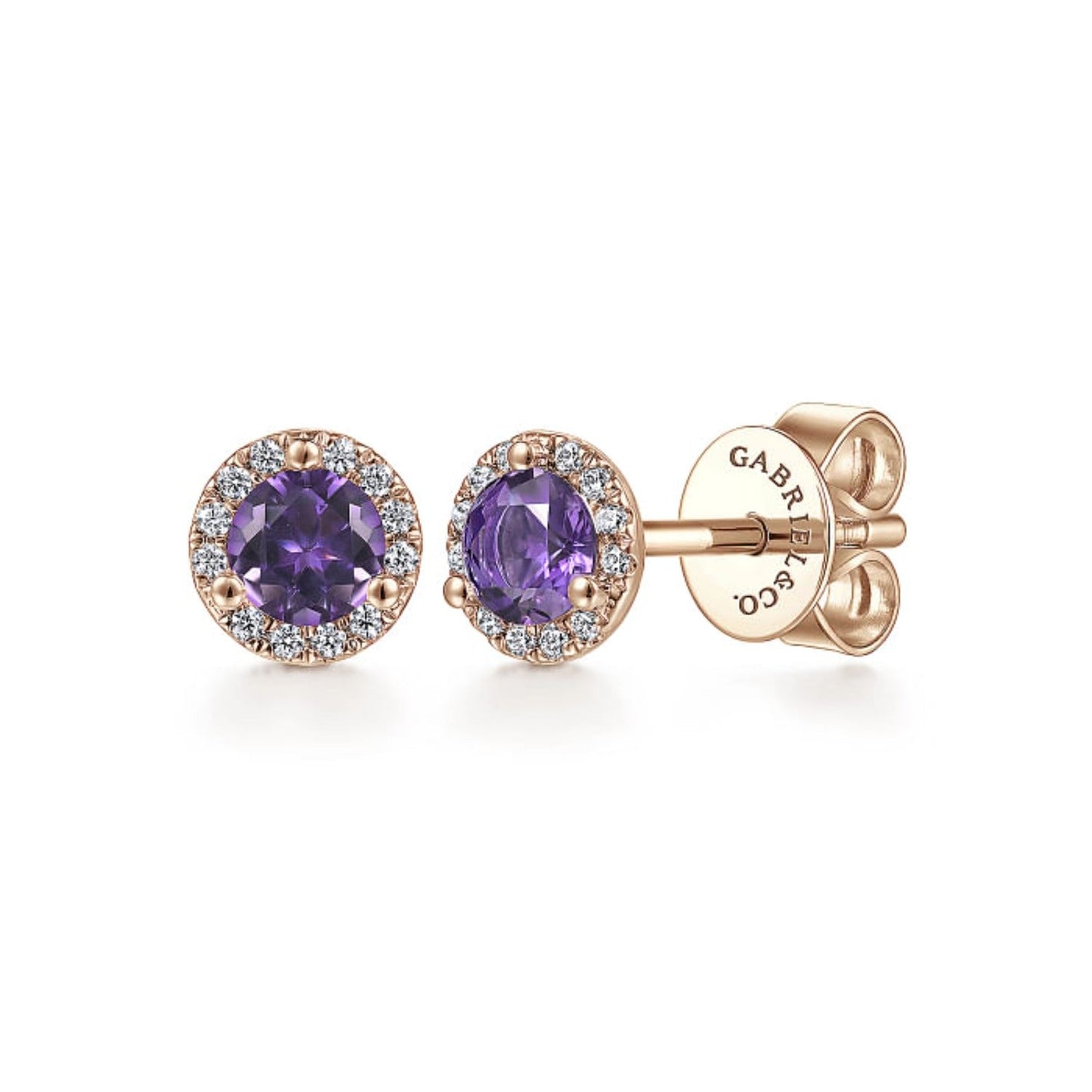 Gabriel & Co.'s gold stud earrings feature two stunning 0.41-carat (total weight) Amethyst center stones surrounded by a 0.09-carats total weight of pavé set diamonds in the halo. These earrings effortlessly combine classic elegance with modern flair, making them the perfect accessory for any occasion.