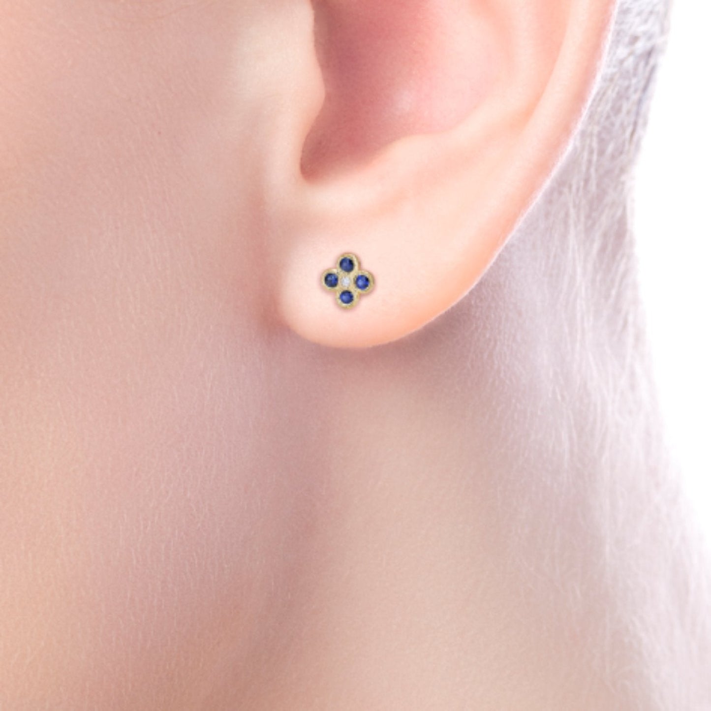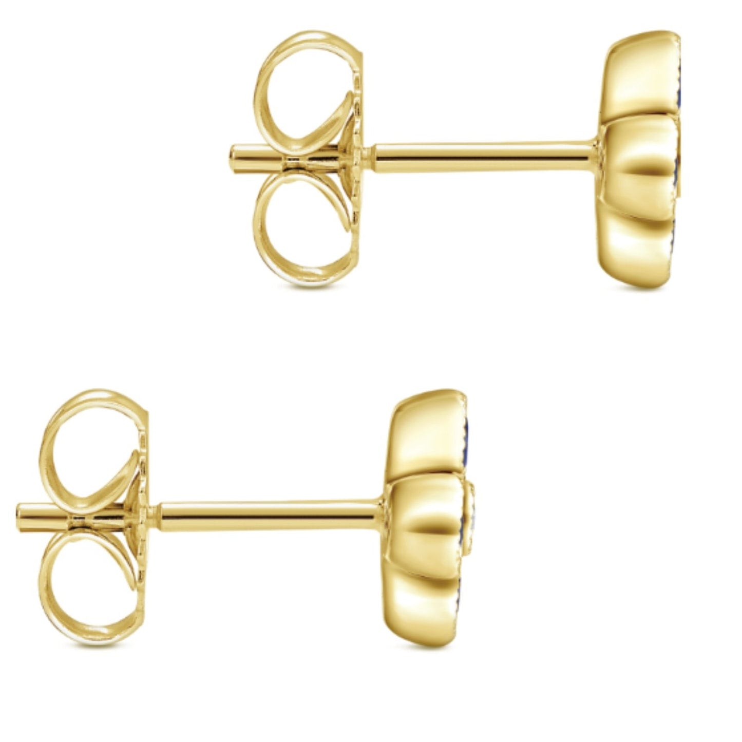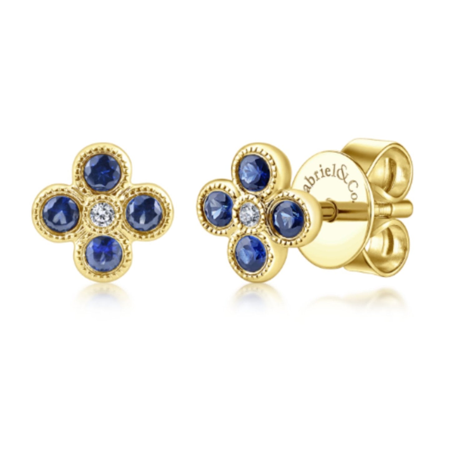 Gabriel & Co. Blue Sapphire and Diamond Flower Cluster Earrings Featuring 0.32 Carats Bezel Set Round Cut Blue Sapphires and 0.02 Carats Round Cut Diamonds These stunning earrings are designed to bring out your inner radiance. Each pair features 0.32 carats of bezel set round cut blue sapphires and 0.02 carats of round cut diamonds, adding a touch of elegance to your day.
