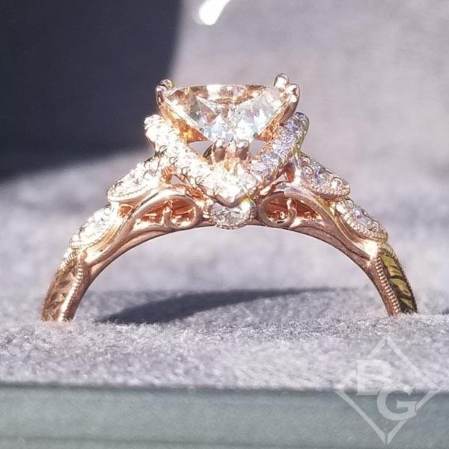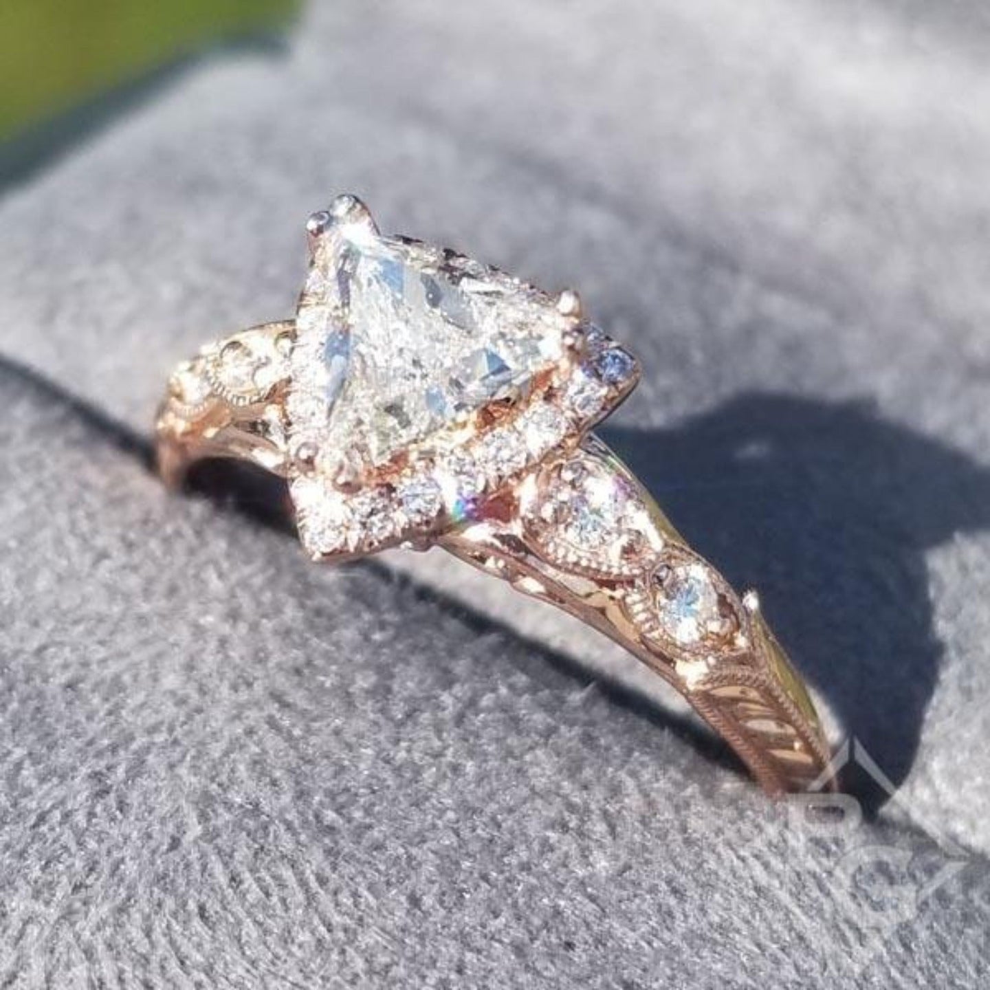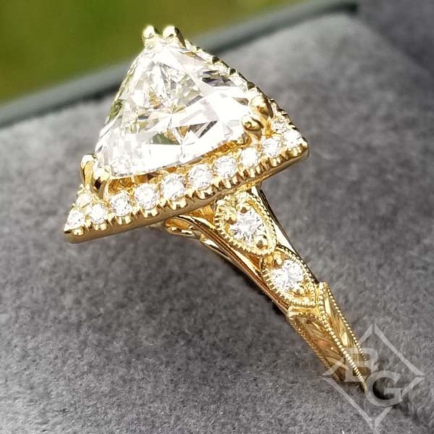- Ring can accommodate any size or shape diamond. Shown with an approximately a 1.80 carat trillion cut diamond (approx 8.7 x 8.7 x 4.5mm)
