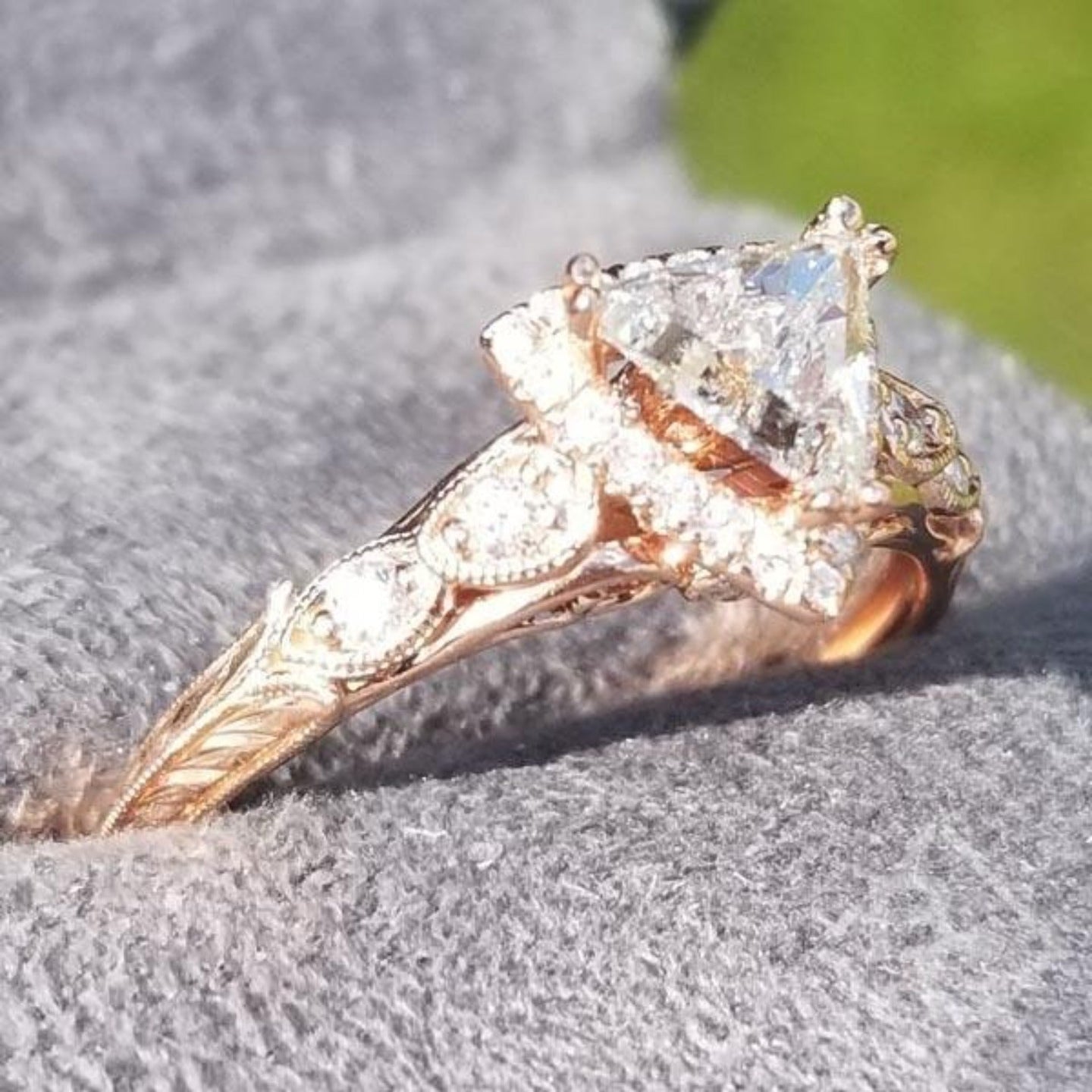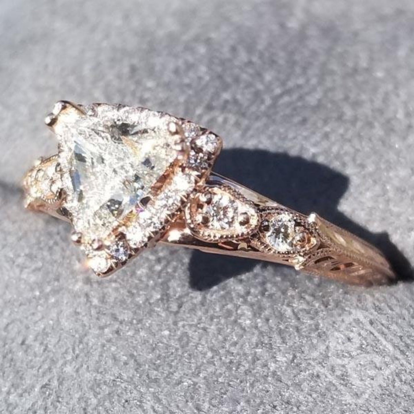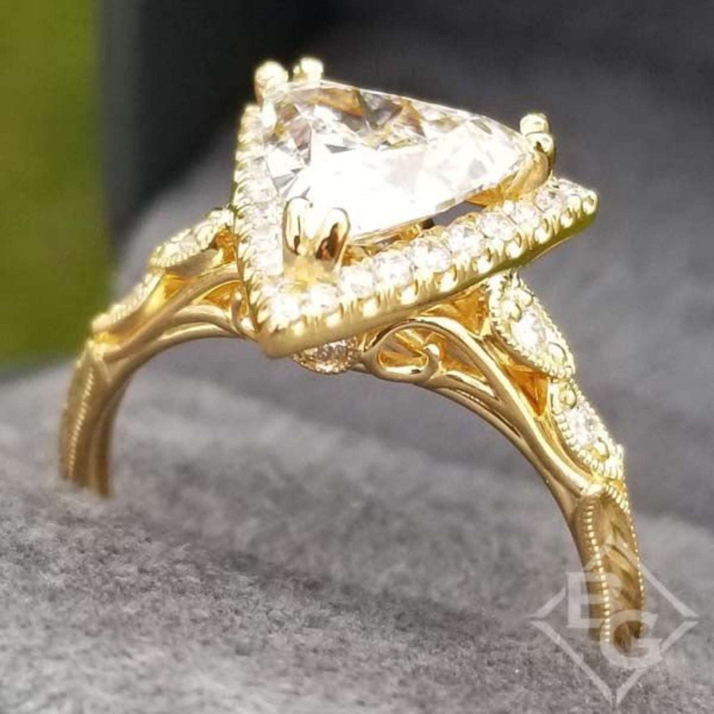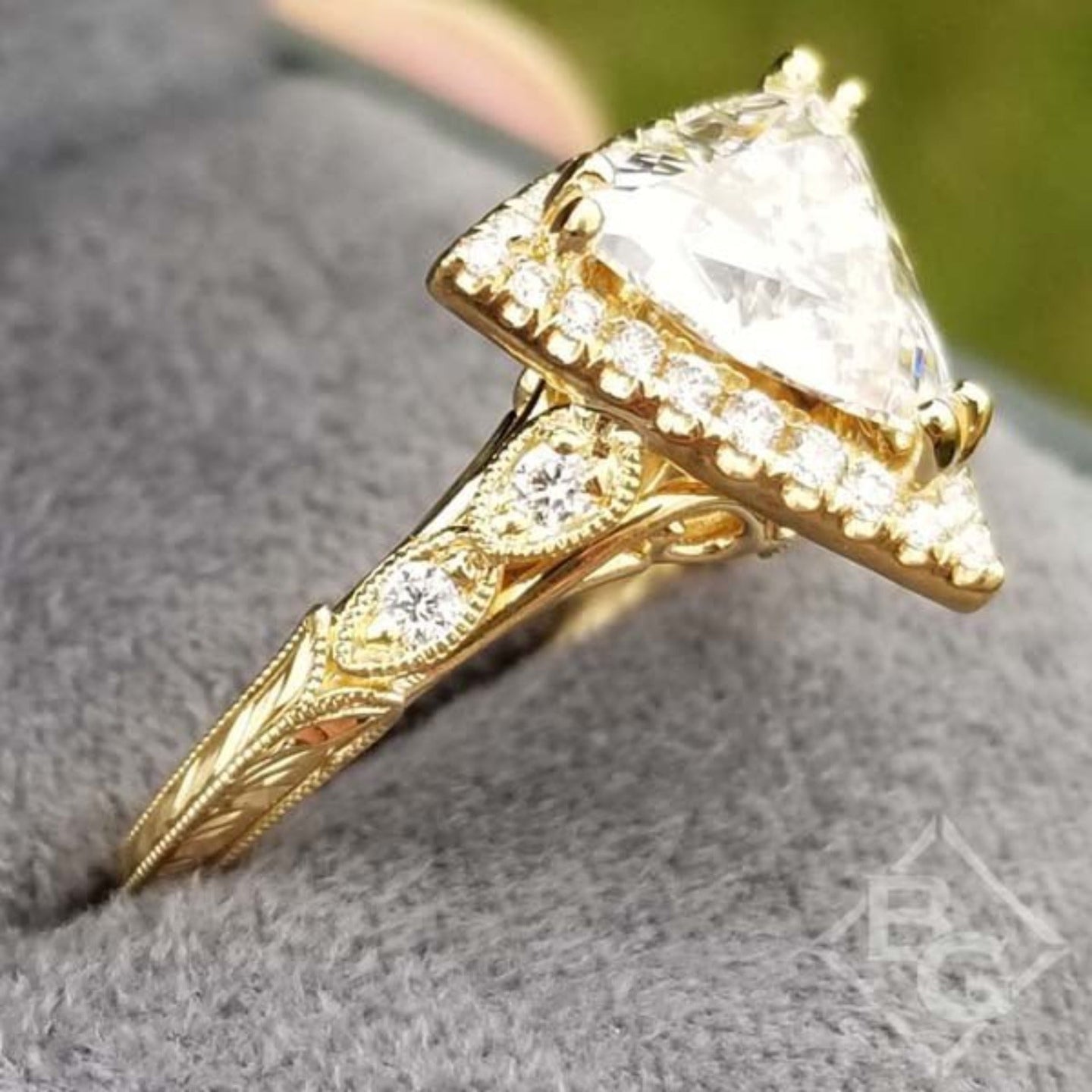 - Ring can accommodate any size or shape diamond. Shown with an approximately a 1.80 carat trillion cut diamond (approx 8.7 x 8.7 x 4.5mm)