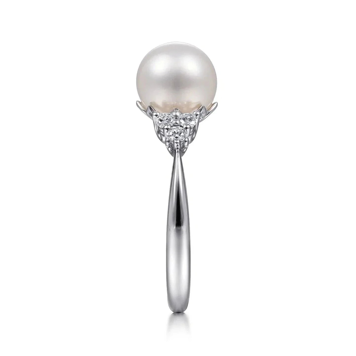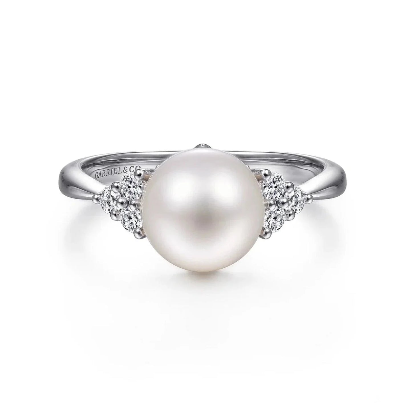 This exquisite pearl ring showcases the everlasting charm of a glowing 8mm cultured pearl. Three clusters of prong set round cut diamonds, totaling 0.18 carats, decorate the tapered band with a touch of sparkle and radiance. With its romantic appeal, this ring is sure to become a staple in your collection.