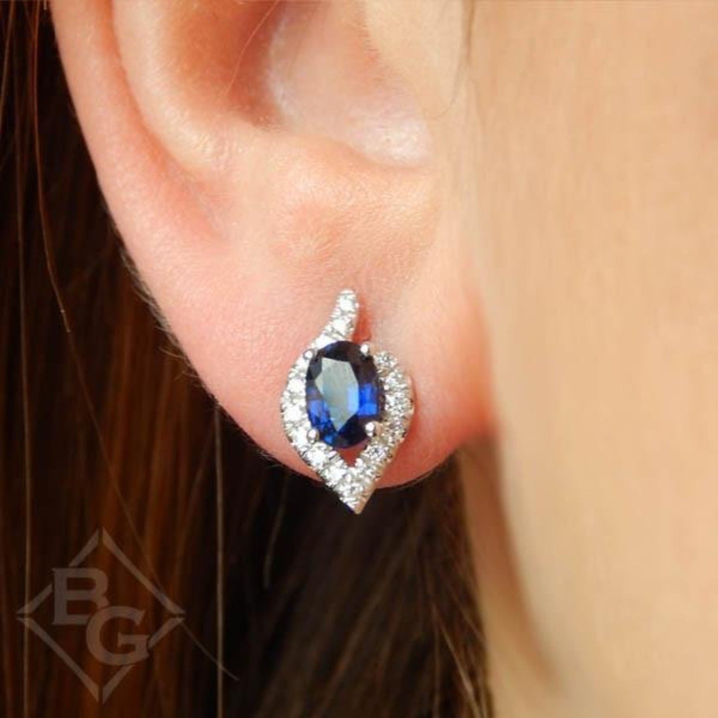 Indulge in some color and shine with these 1.29 carats of stunning sapphire and diamond earrings. Gleaming 0.22 carats of pavé diamonds encircle elegant oval-cut sapphires in a modified pear-shaped halo design. Sparkle and shine, these earrings add a pop of color and dazzle to any outfit. With 1.29 carats of captivating sapphires and a halo of 0.22 carats of pavé diamonds, you're sure to turn heads. Don't be surprised when others can't help but admire the beauty of your modified pear-shaped earrings.