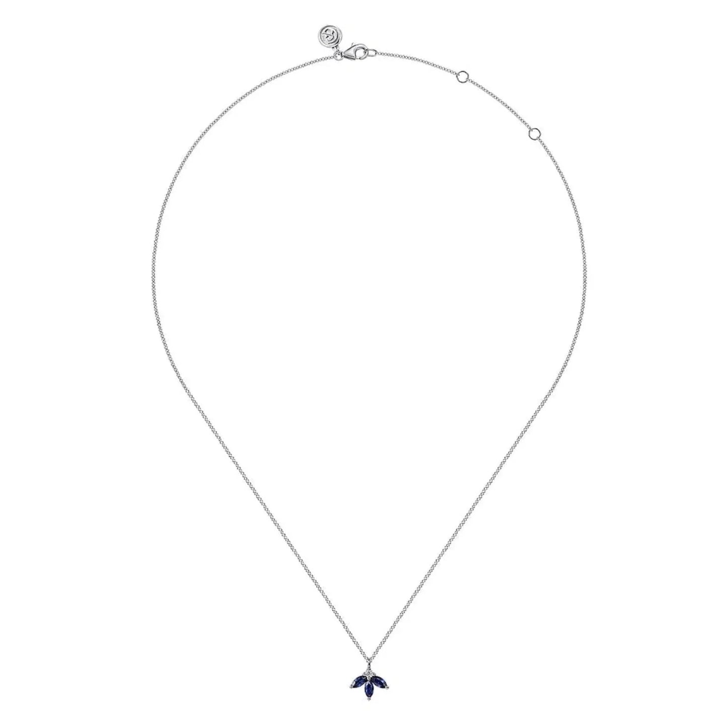Expertly crafted by Gabriel & Co., this pendant showcases 0.51 carats of marquise cut blue sapphires and a 0.04 carats round cut diamond. With a length of 17.5", this necklace is the perfect addition to any jewelry collection.