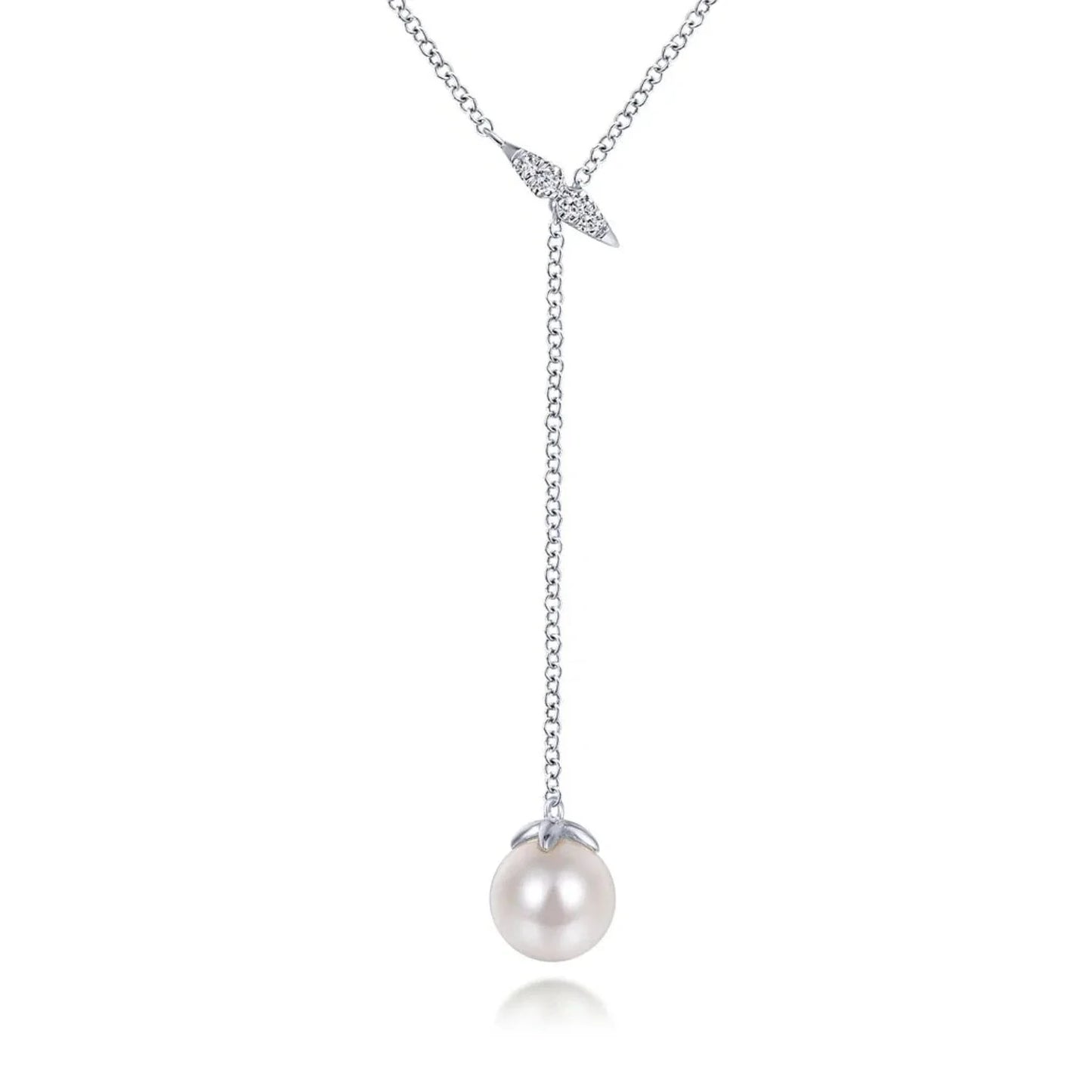 Push your fashion boundaries with this daring lariat necklace from Gabriel. A tapered 0.04 carat pavé set diamond detail adds a touch of boldness to the sleek Y knot design. Completed with a luminous white pearl drop, this necklace will elevate any outfit to new levels of adventure!