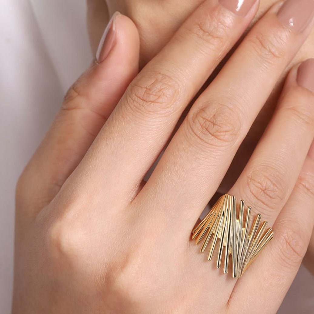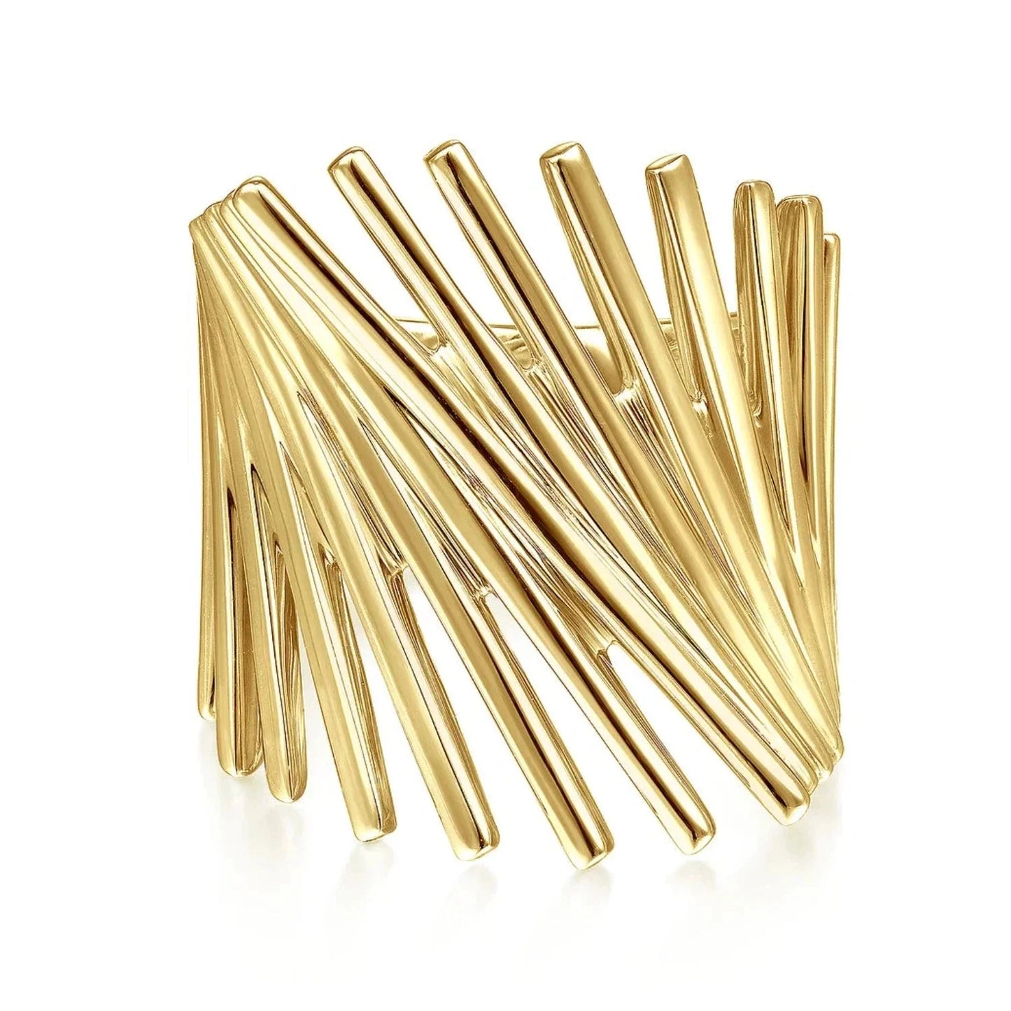 Gabriel & Co. Contemporary Gold Stacked Bar Cage Ring Featuring Angel-ed Bars of High Polish Gold With the High Polish Stacked Bar Cage Ring, you'll effortlessly elevate your style with the contemporary gold design. The ring features sleek, angel-ed bars of high polish gold, making it the perfect addition to your jewelry collection for any occasion. Don't miss out on the timeless elegance and modern flair this ring has to offer.