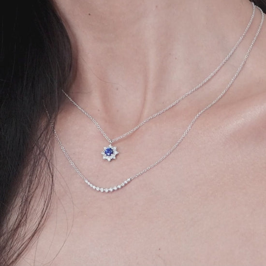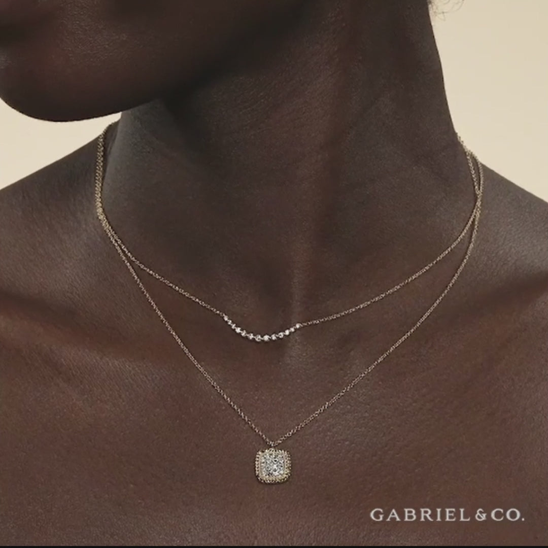 This Gabriel & Co. necklace features a delicate curved bar design and 0.26 carats total weight round cut graduating diamonds for a touch of elegance and sophistication. With its timeless design and dazzling diamonds, this necklace is sure to add a touch of indulgence to any outfit.