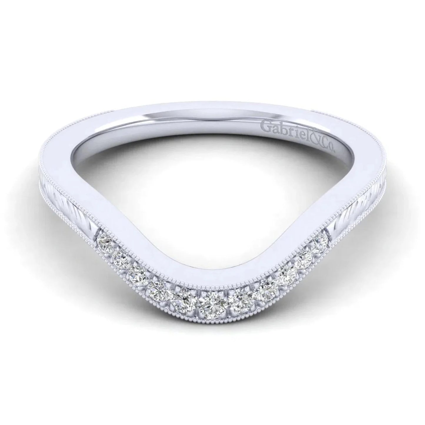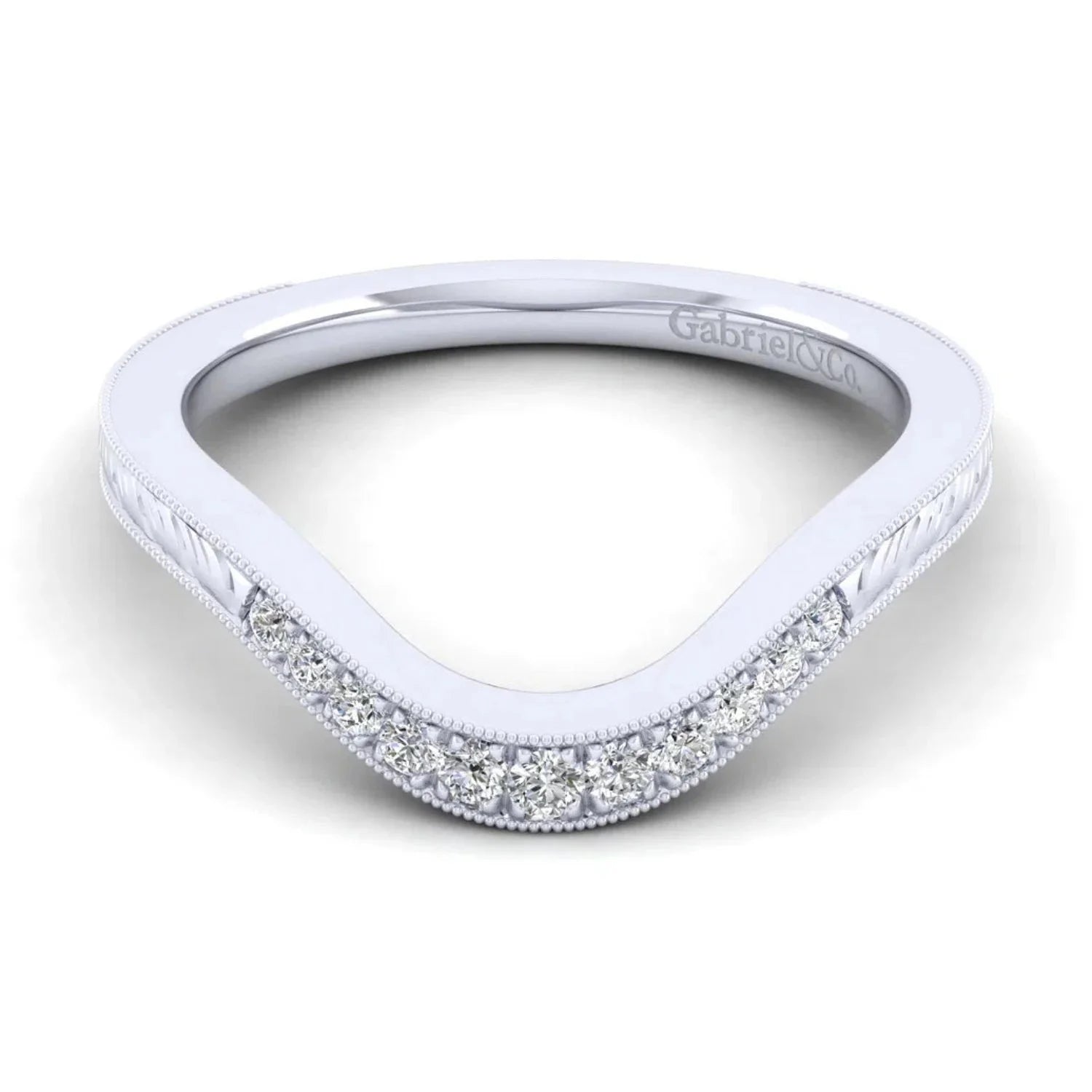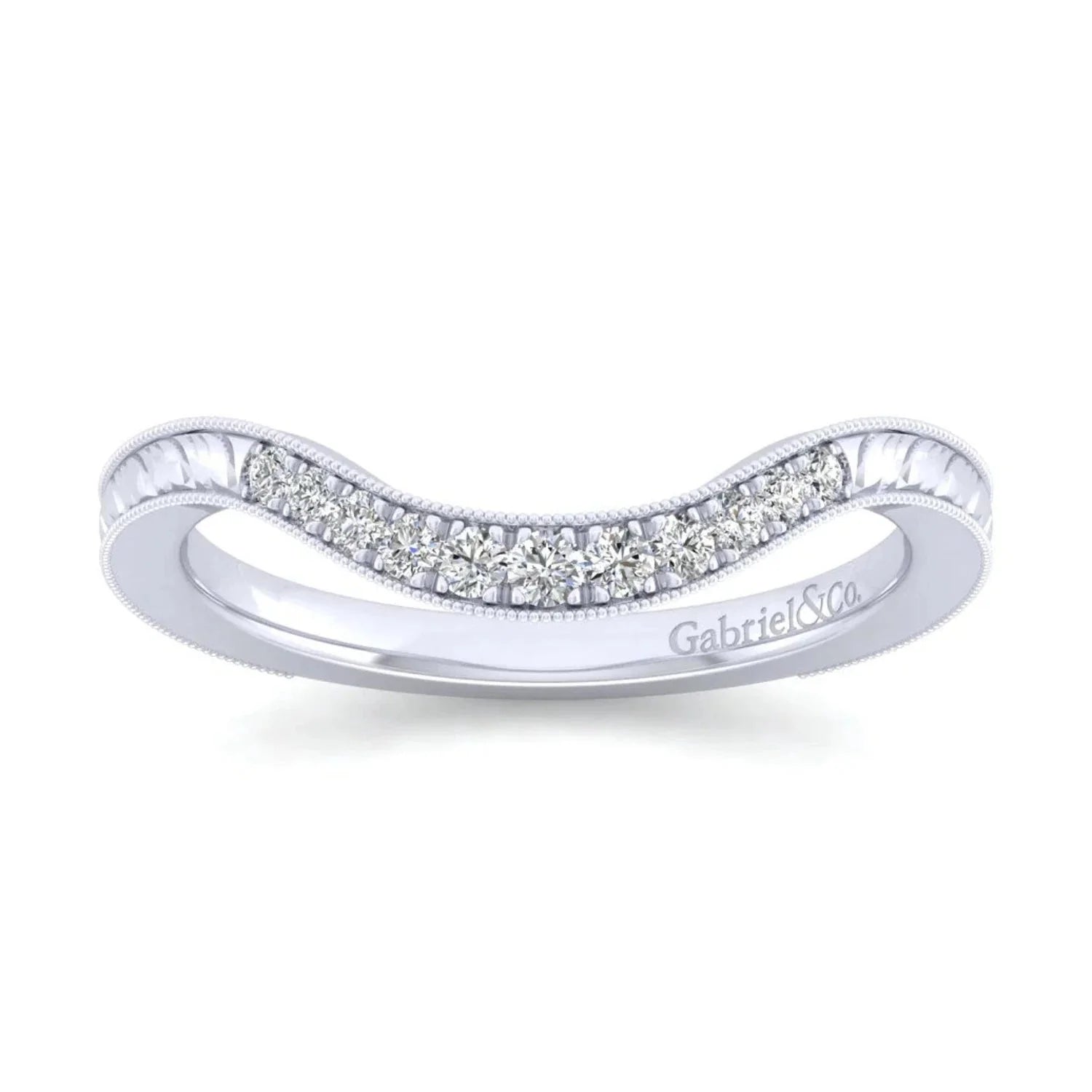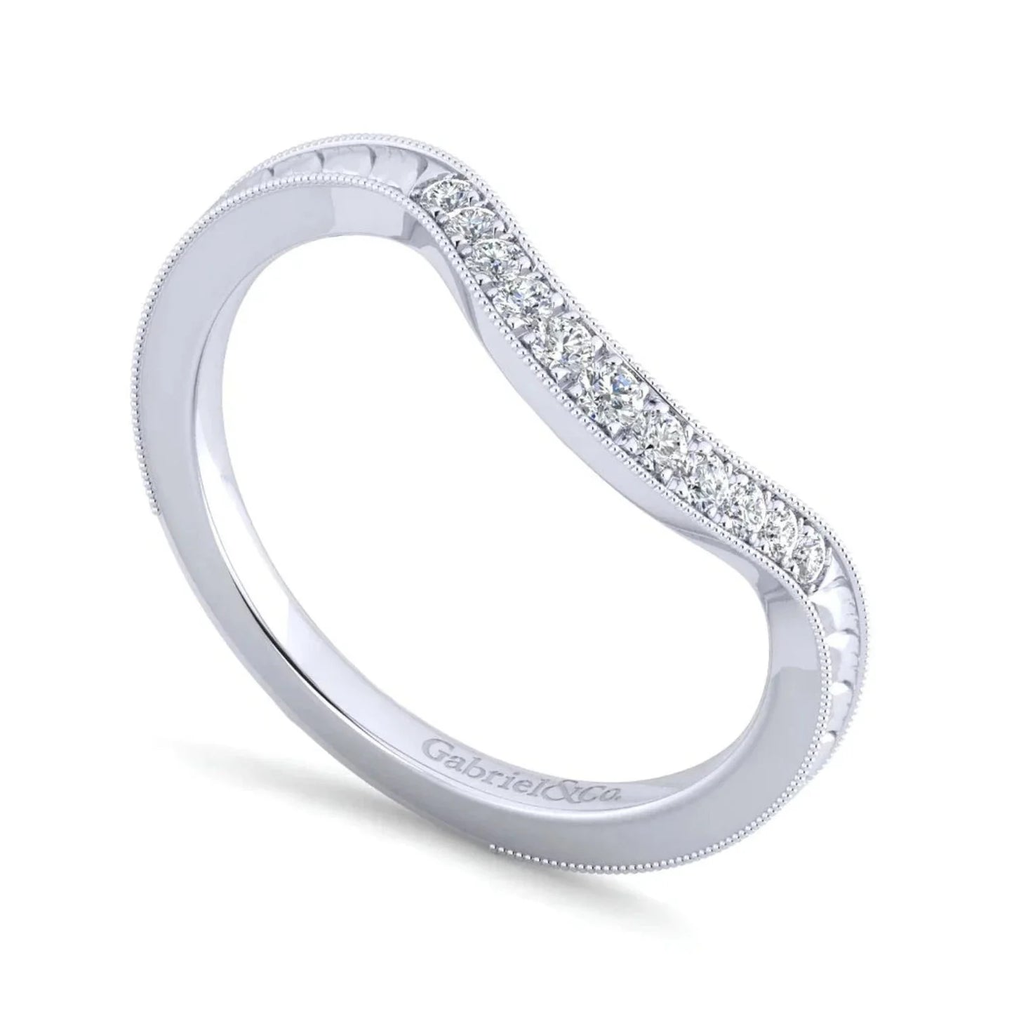 Introducing the "Lexington" Vintage Style Curved Diamond Wedding Band by Gabriel & Co., featuring 0.11 carats of round cut diamonds with intricate engraved and migrain details. Perfect for anyone looking for a unique and elegant piece to complement their special day.