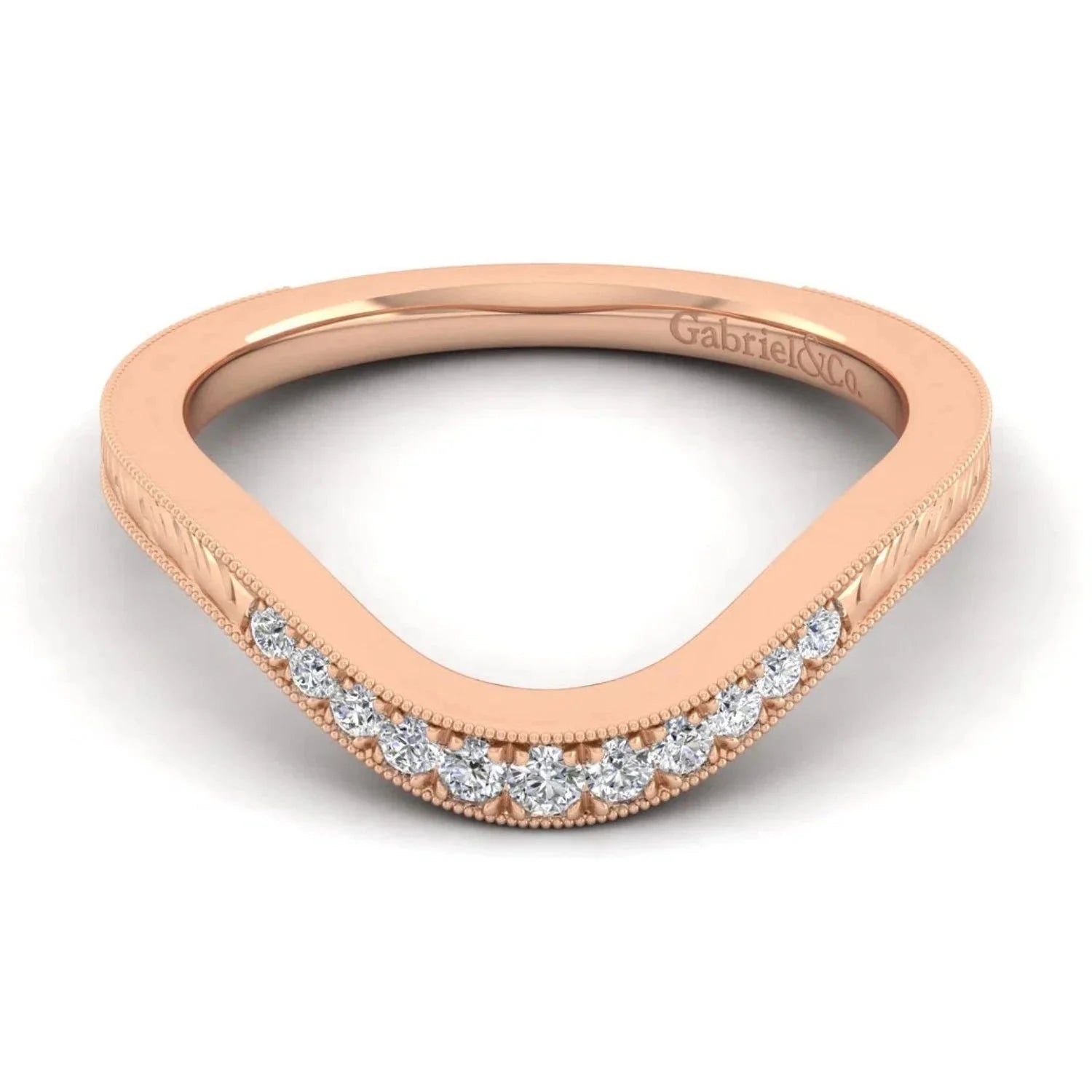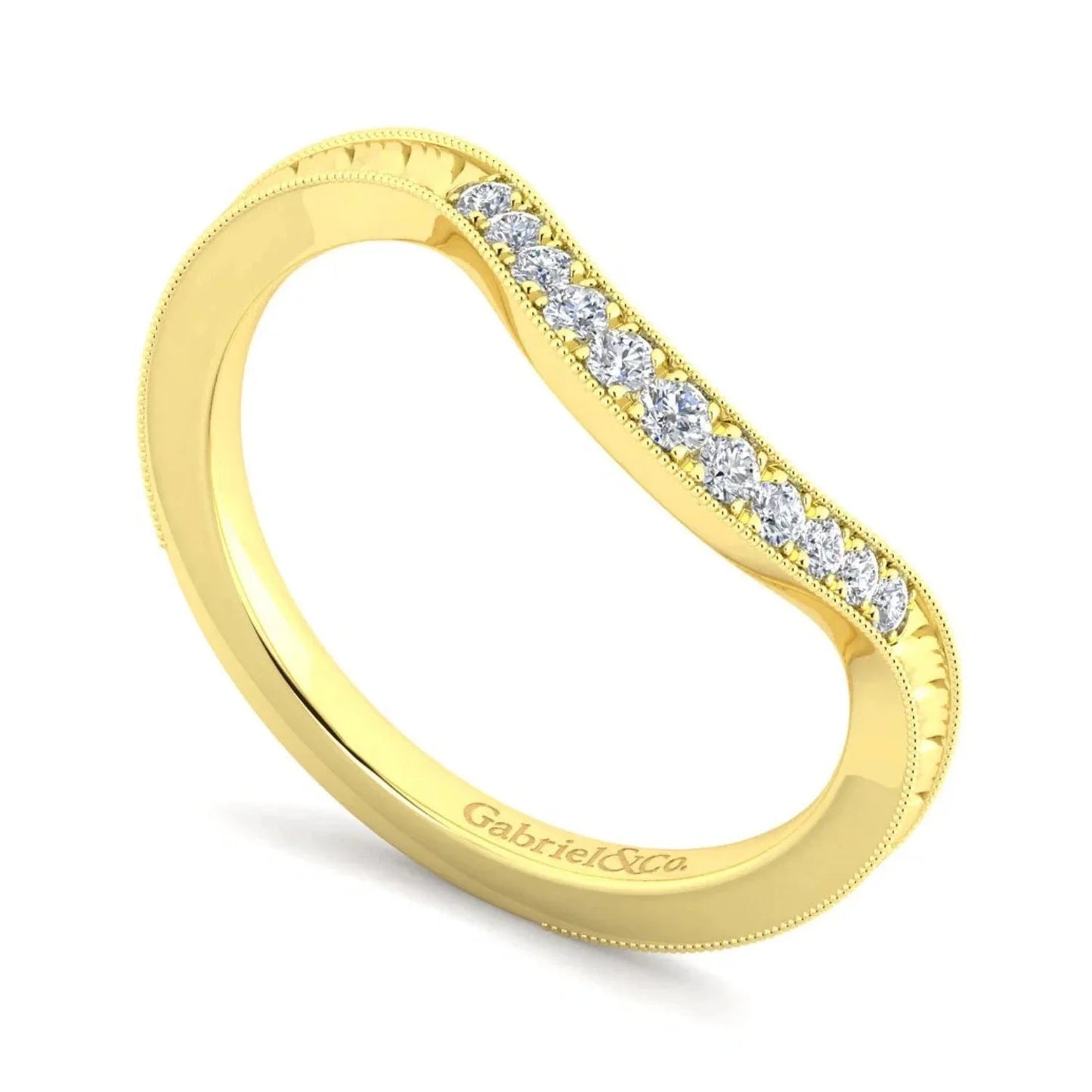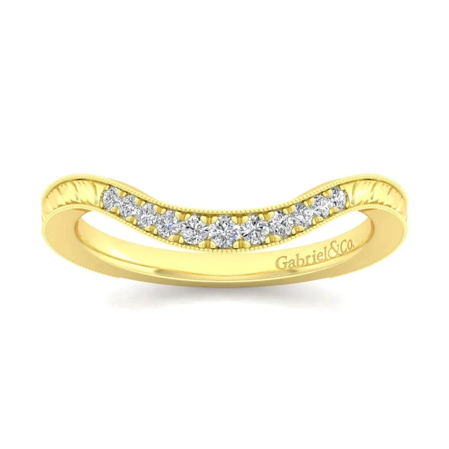 Introducing the "Lexington" Vintage Style Curved Diamond Wedding Band by Gabriel & Co., featuring 0.11 carats of round cut diamonds with intricate engraved and migrain details. Perfect for anyone looking for a unique and elegant piece to complement their special day.