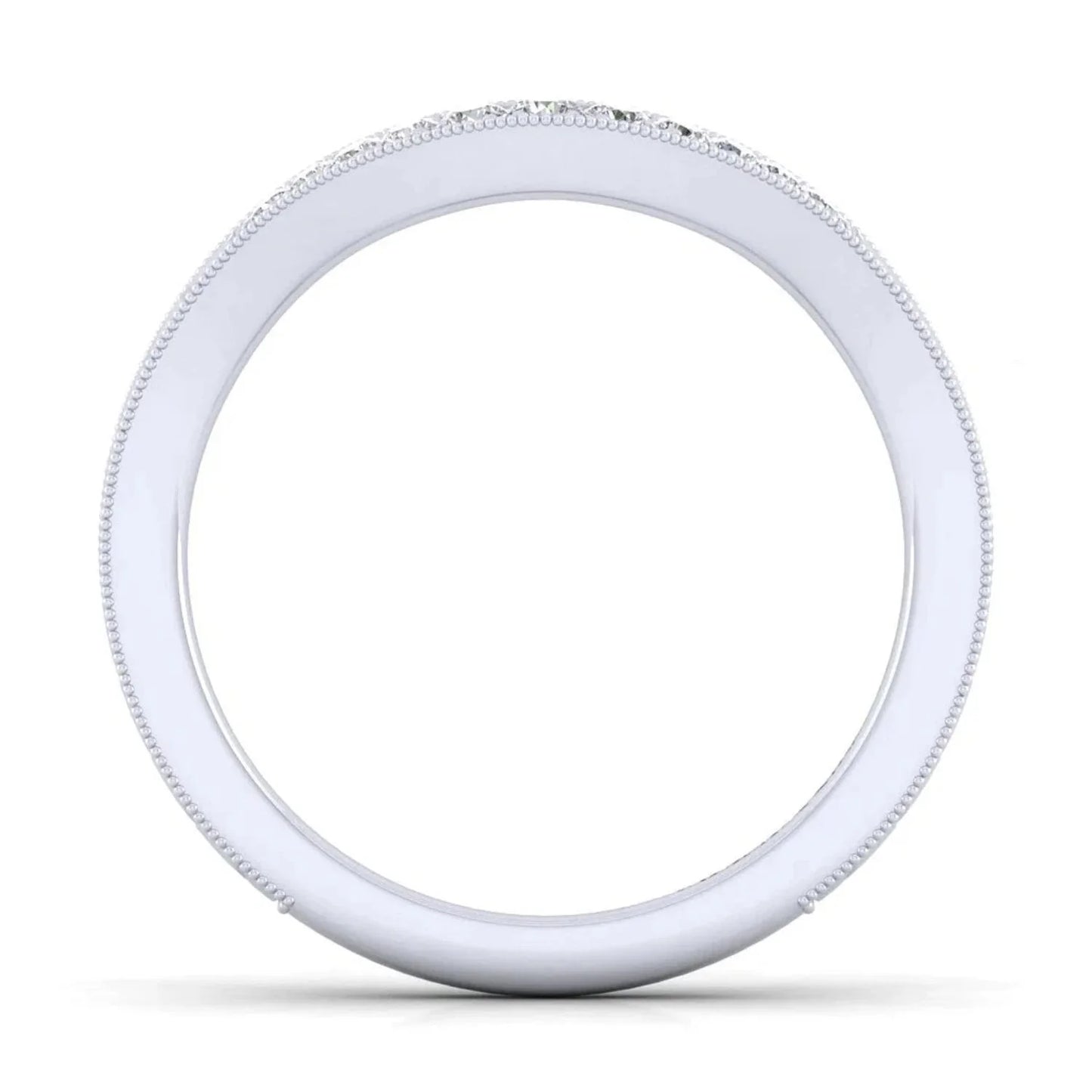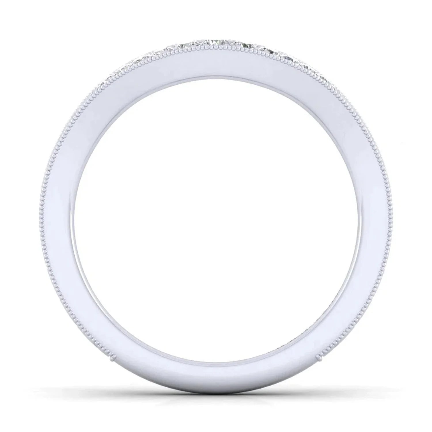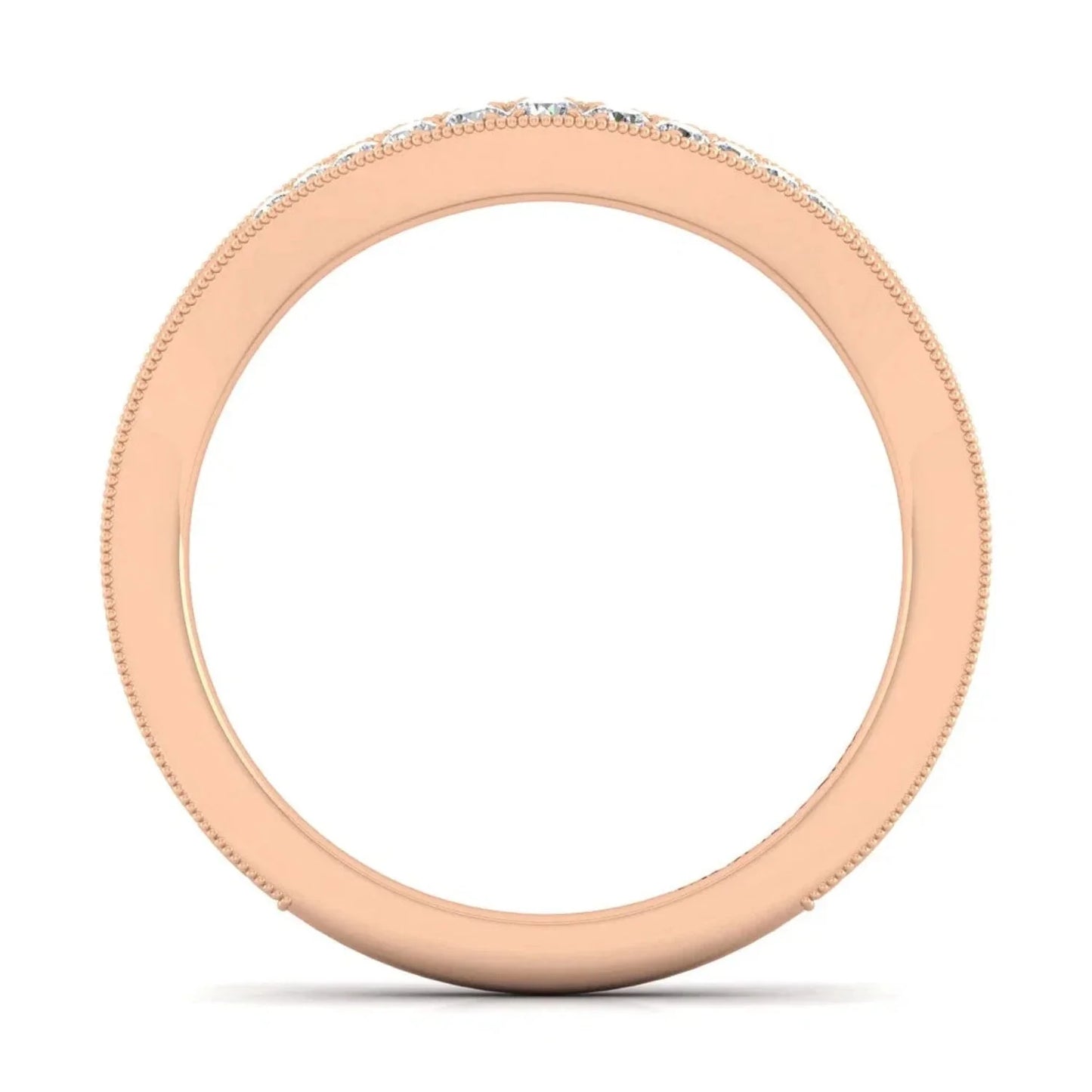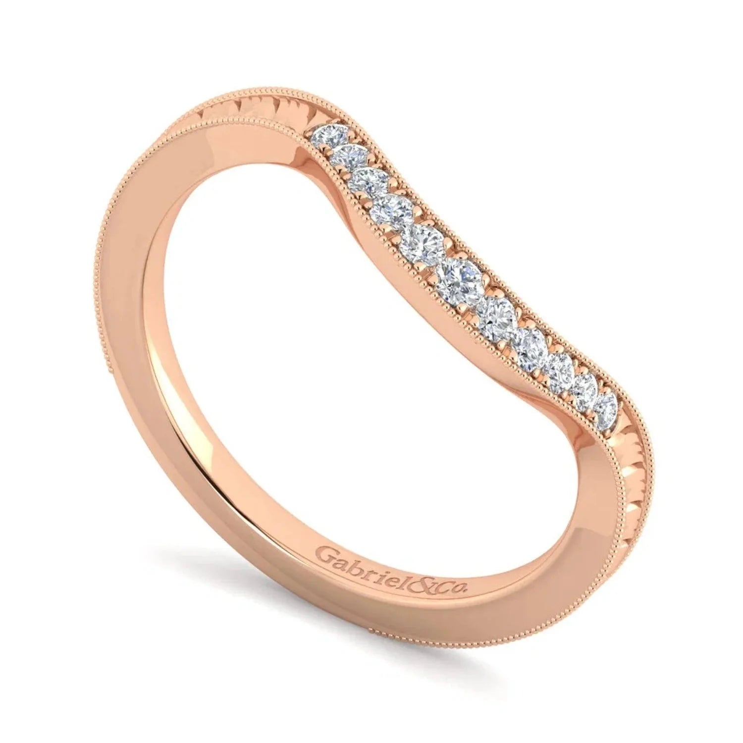 Introducing the "Lexington" Vintage Style Curved Diamond Wedding Band by Gabriel & Co., featuring 0.11 carats of round cut diamonds with intricate engraved and migrain details. Perfect for anyone looking for a unique and elegant piece to complement their special day.