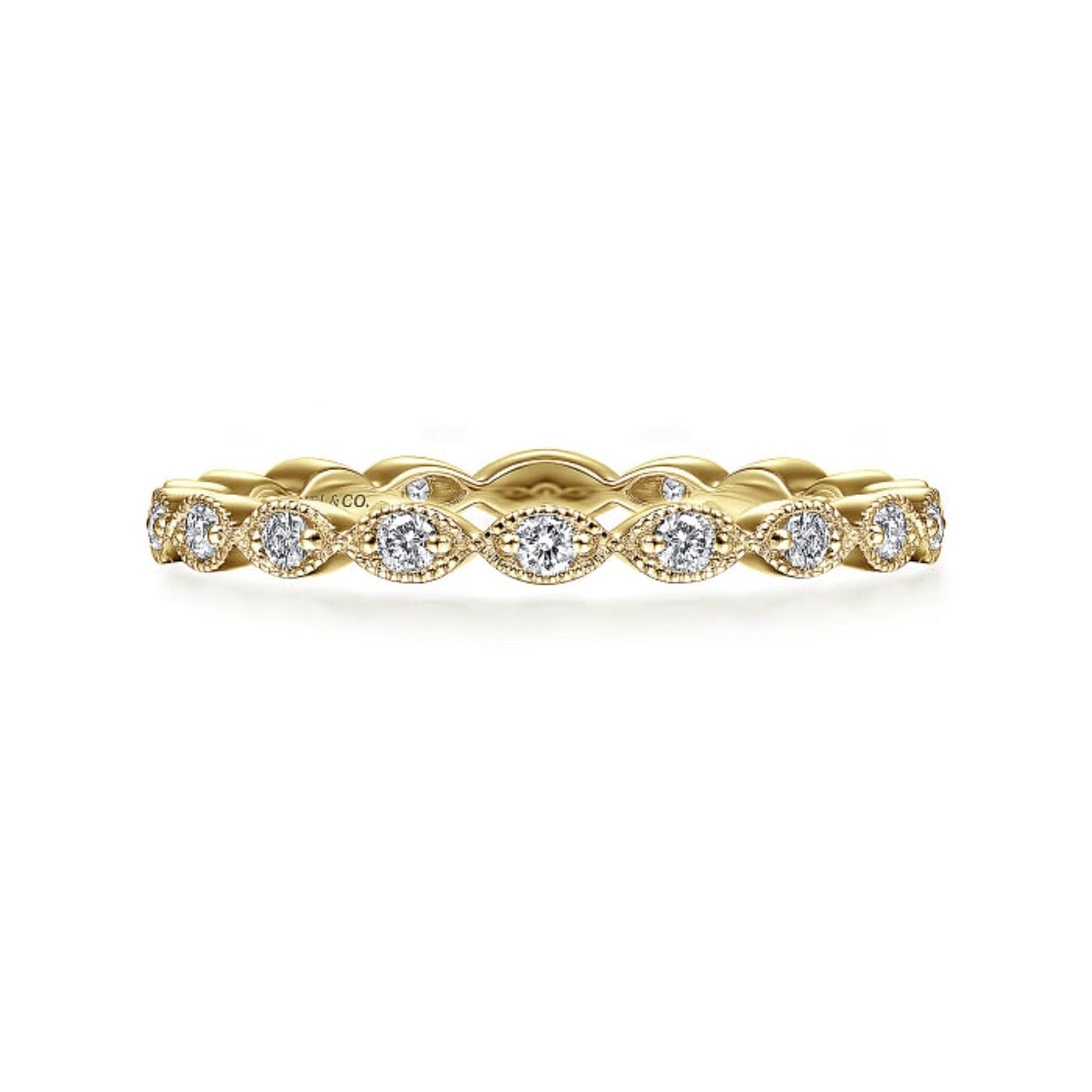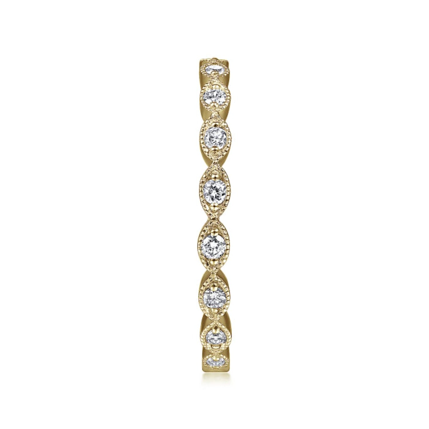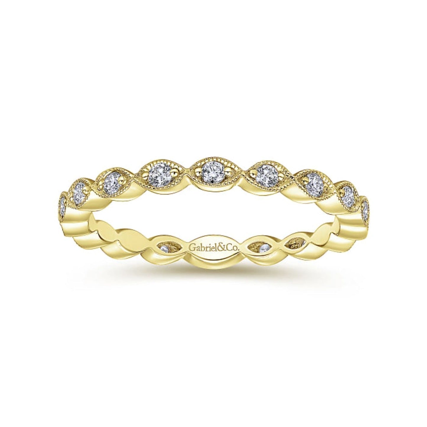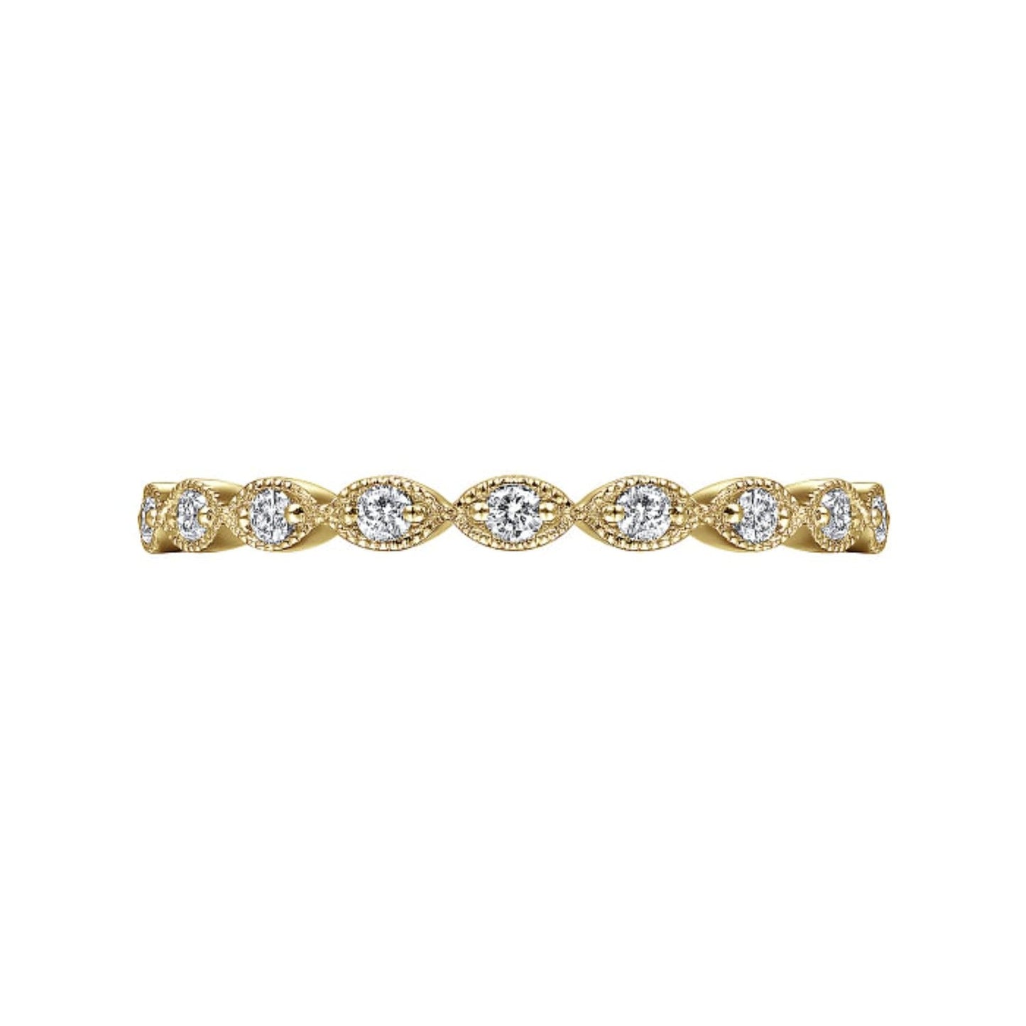 Discover the timeless beauty of the Gabriel & Co. Gold Marquise Shaped Stackable Ring, a masterfully crafted piece that captures the essence of elegance. This captivating ring boasts a marquise-shaped design adorned with 0.27 carats of round-cut diamonds, skillfully set and complemented by delicate milgrain edging. With a total diamond weight of 0.25 carats, this stackable ring exudes sophistication and charm. The diamonds exhibit an average clarity of SI2 or higher and a near-colorless hue, ensuring a radiant sparkle. Elevate your style with the enchanting allure of natural diamonds, embodied in this exquisite creation from Gabriel & Co.