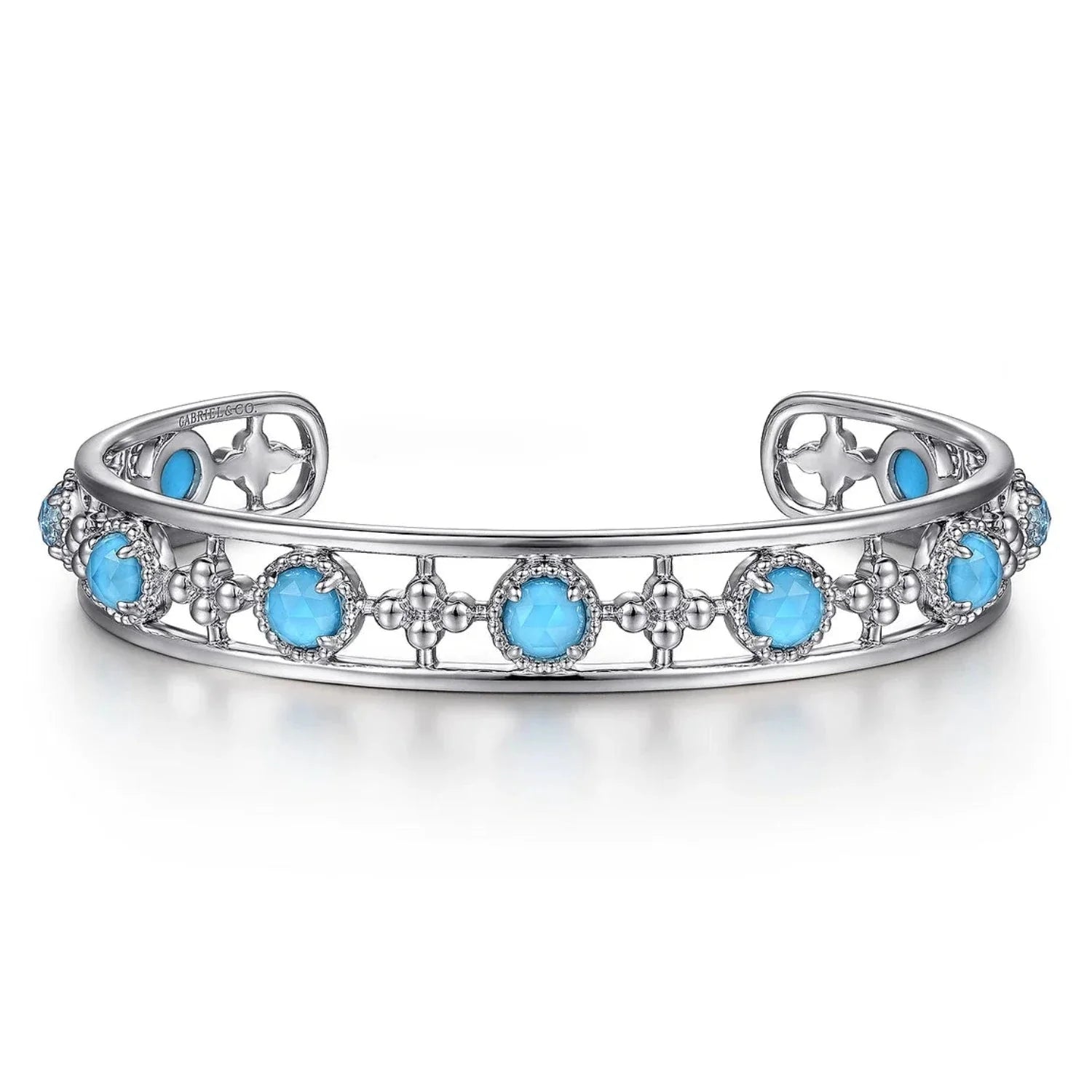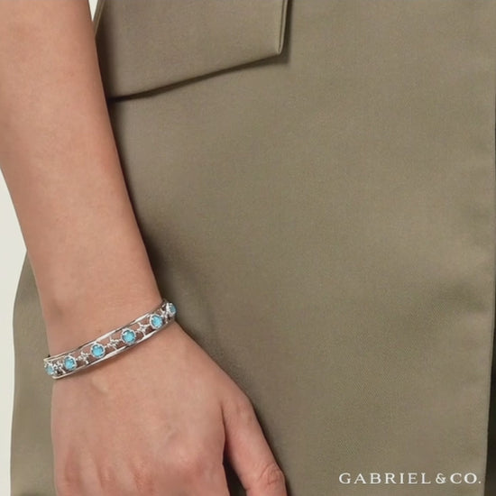 This stunning Gabriel & Co. bangle bracelet is the perfect accessory for any occasion. With beautifully crafted rock crystal and turquoise stations, it adds a touch of elegance and whimsy to any outfit. The playful design will surely make a statement and turn heads wherever you go (but in a good way, of course).
