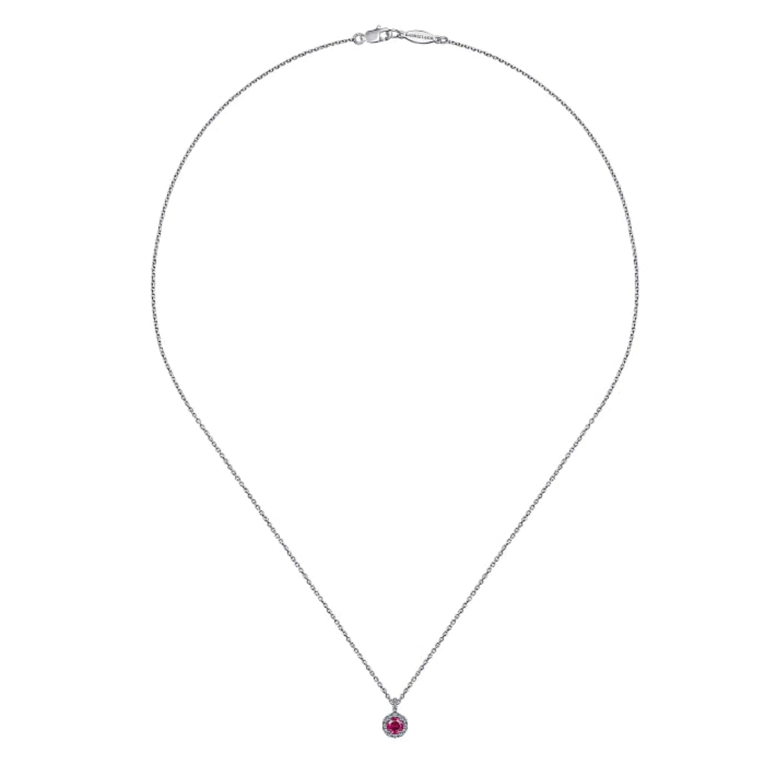 This stunning Gabriel & Co. pendant features a brilliant round cut gemstone surrounded by a halo of sparkling diamonds. Choose from a selection of vibrant ruby, emerald, or sapphire stones for a classic and chic look. Experience timeless elegance with this gorgeous pendant.