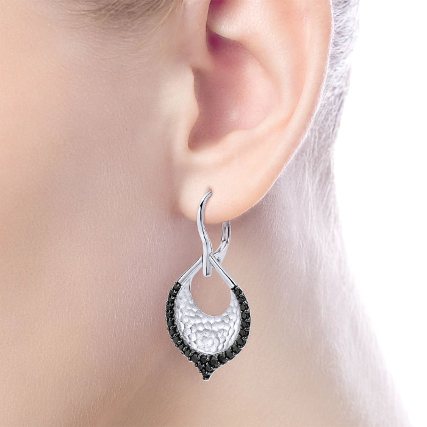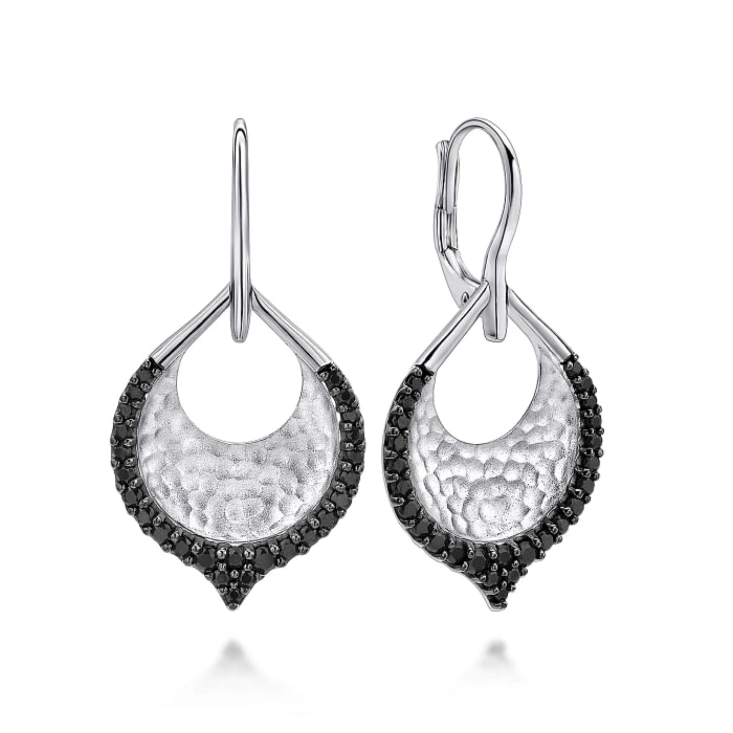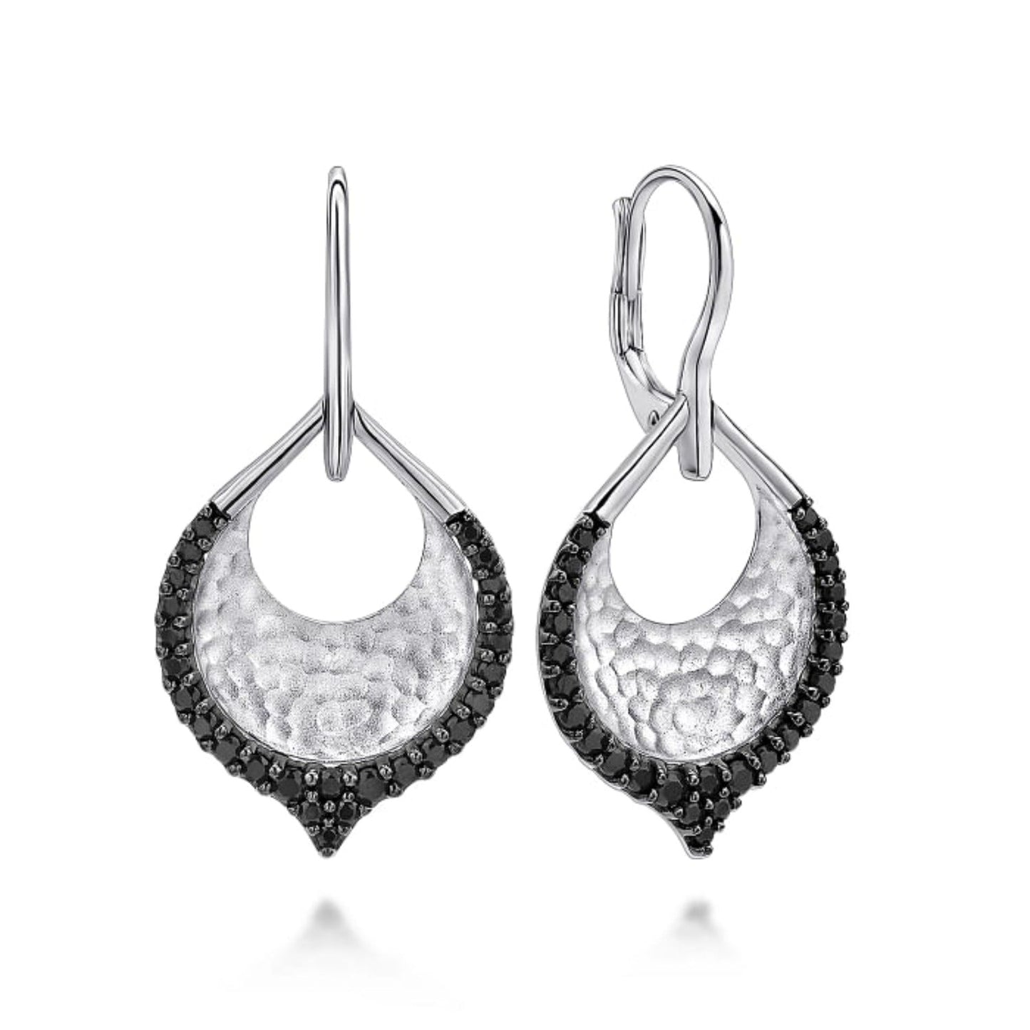 Dangle in style with Gabriel's Sterling Silver "Byblos" Earrings, adorned with 1.20 carats of round-cut black spinels. The earrings feature a hammered finish, adding a modern touch to the design. With Gabriel's commitment to craftsmanship, these earrings effortlessly blend sophistication with contemporary flair, making them a striking addition to your collection.