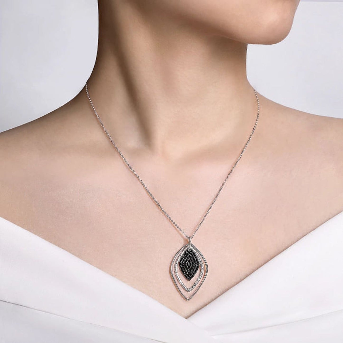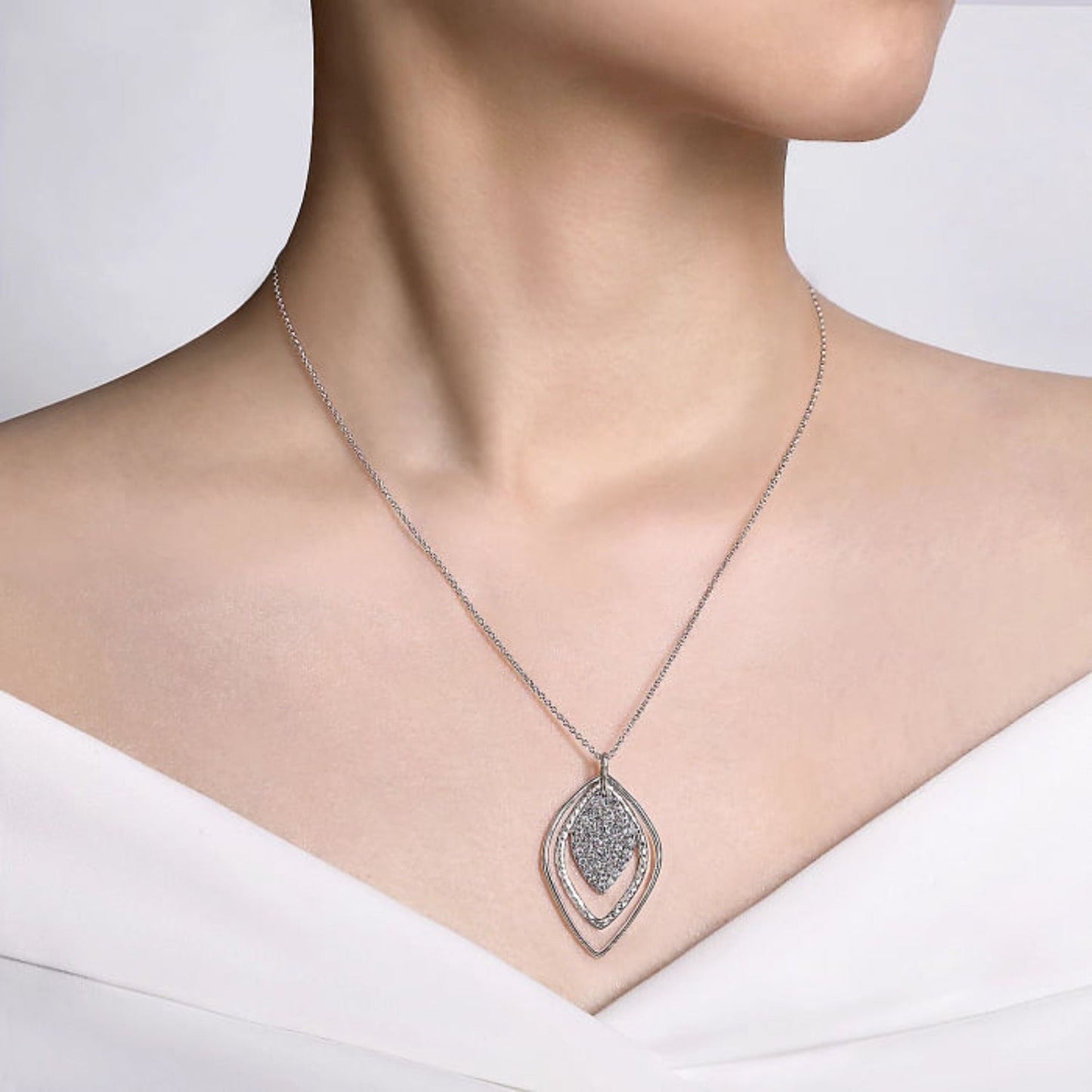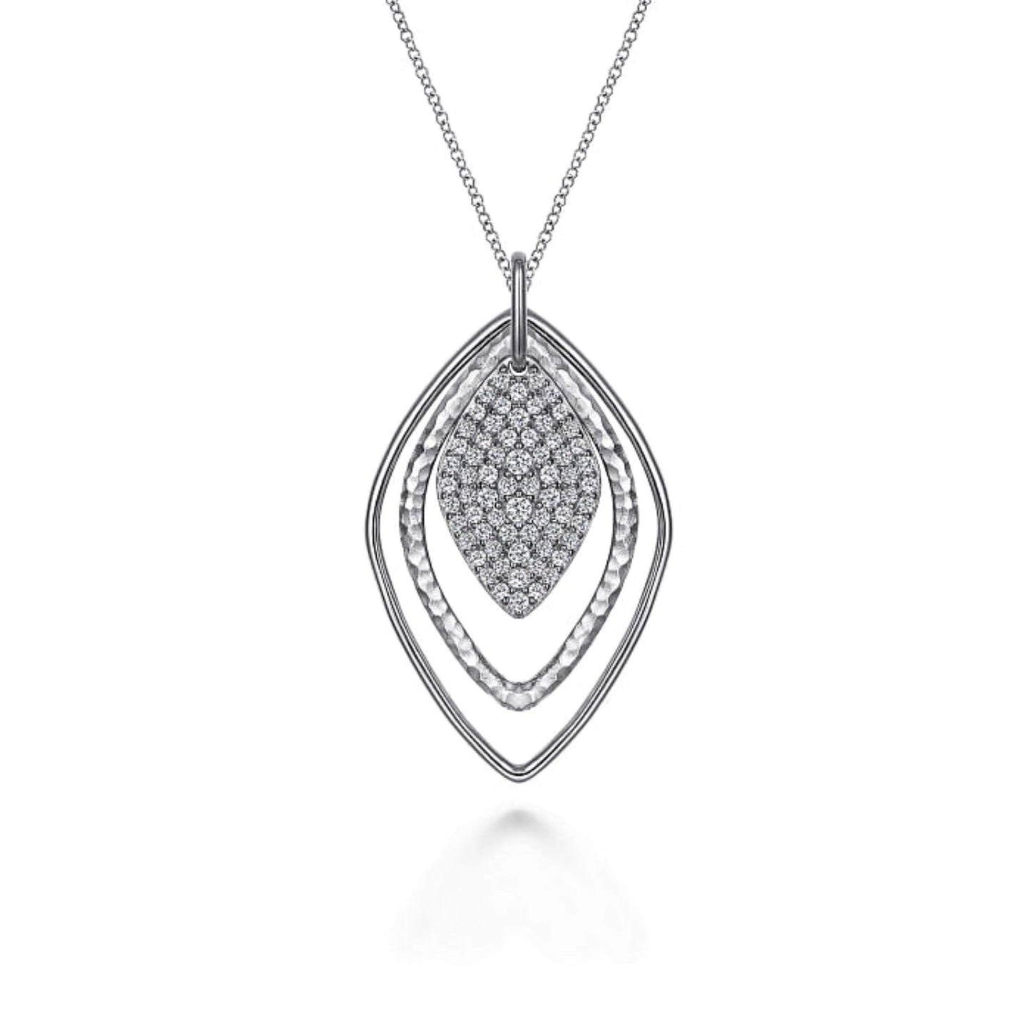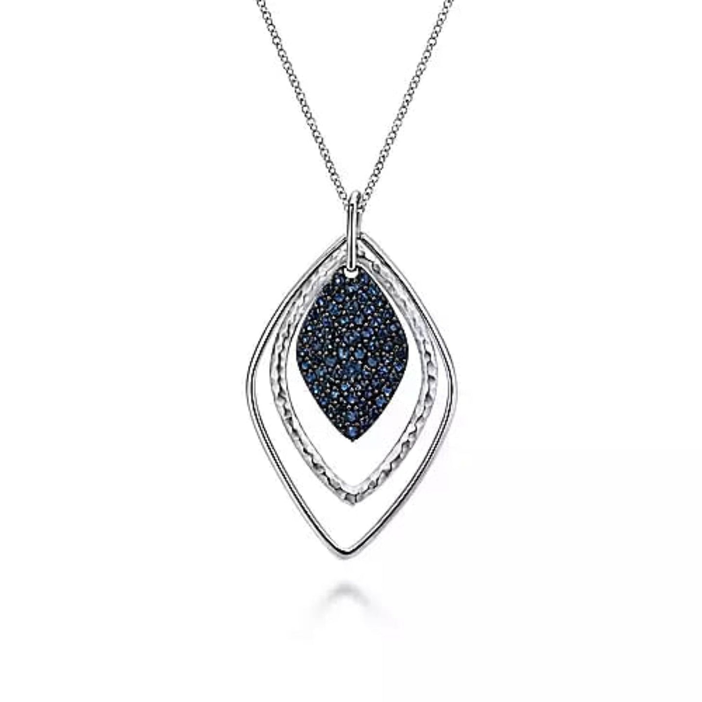 This richly hued necklace provides graphic texture to any look. A marquise shaped cluster of round cut sapphires is suspended from a slim cable chain. Hammered and polished sterling silver silhouettes are draped around the precious stones.