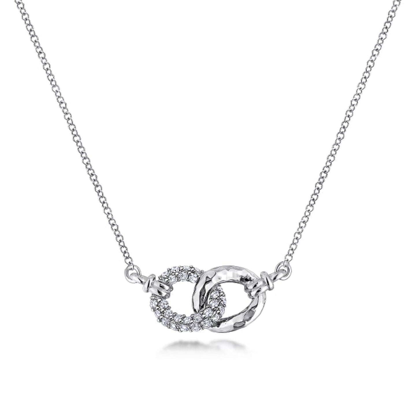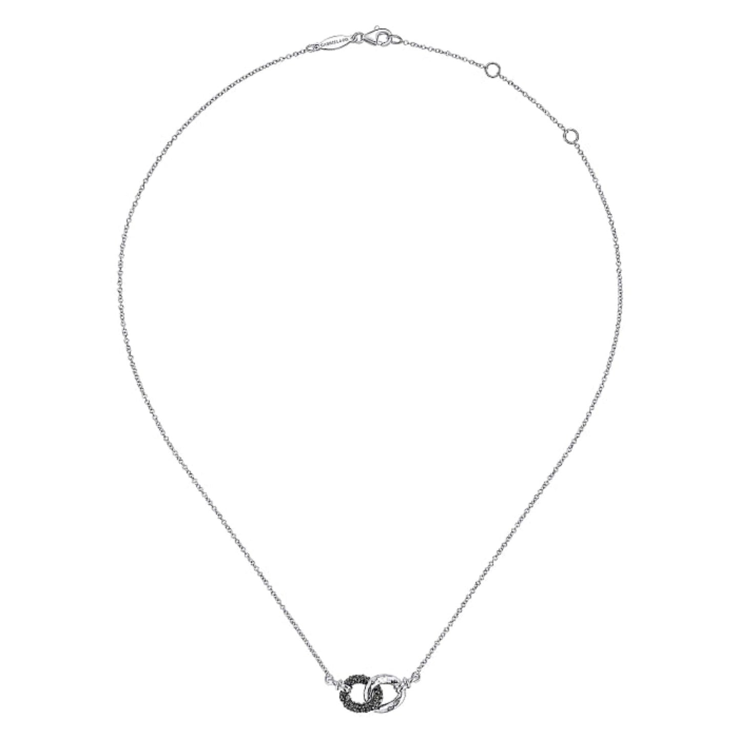 Introducing the stunning Gabriel & Co. Sterling Silver Interlocking Links Pendant, complete with your choice of either black spinel or white sapphires. The sleek interlocking design is expertly connected to a Hammered High Polish Ring, all suspended on a delicate Cable Link Sterling Silver 17.5 Inch Chain. Get ready to elevate your look with this must-have piece.