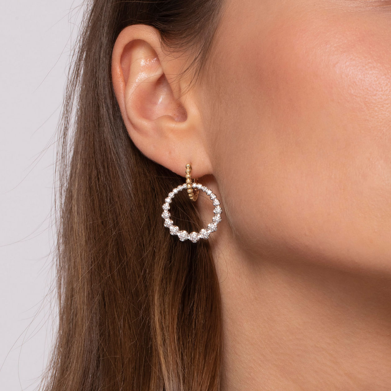Crafted in luxurious yellow and white gold, each earring features a forward-facing graduated circle of round-cut diamonds totaling 1.00 carat—suspended from Bujukan beaded huggies, a signature detail of the iconic collection. The delicate movement of the diamond drop adds just the right touch of sparkle and sophistication.