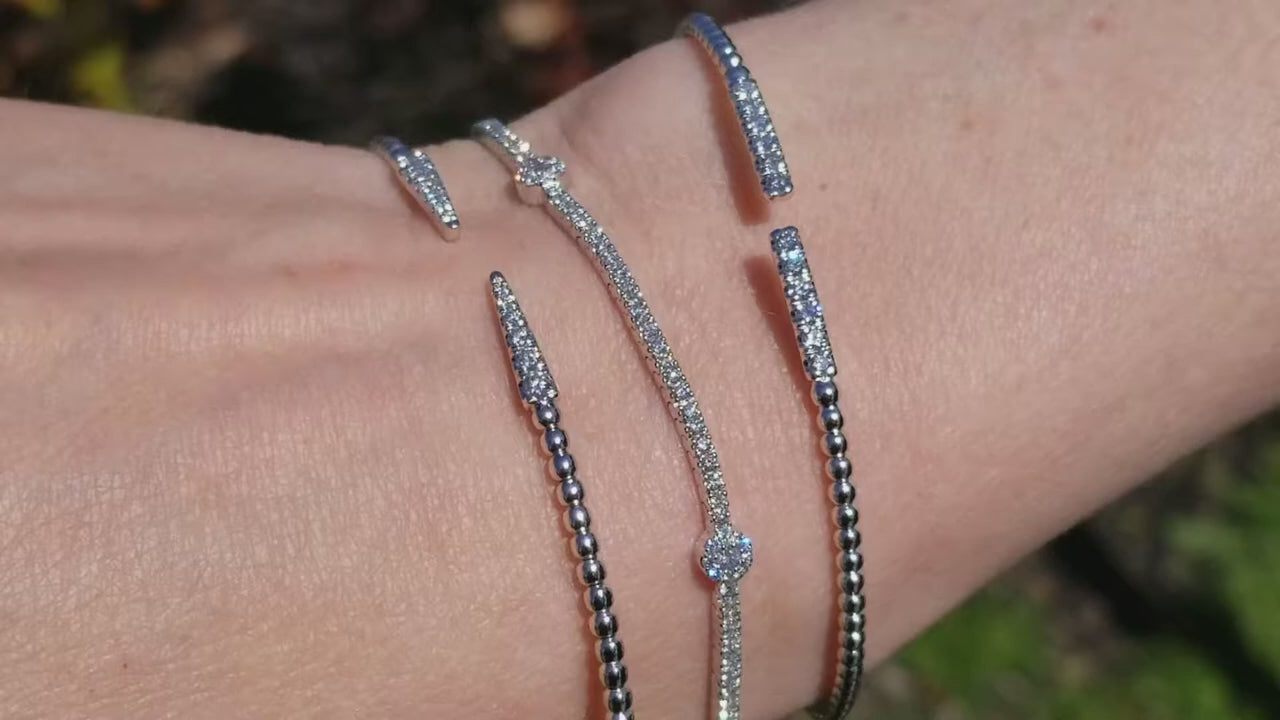 Great for stacking on your wrist, this diamond bangle from the Bujukan collection by designer Gabriel is easy to wear and even easier to get on your wrist! Flexible, with an open design makes this contemporary diamond bangle perfect for everyday wear. One quarter carats of pave set round cut diamonds are set in the tapered tips of this contemporary diamond bangle.