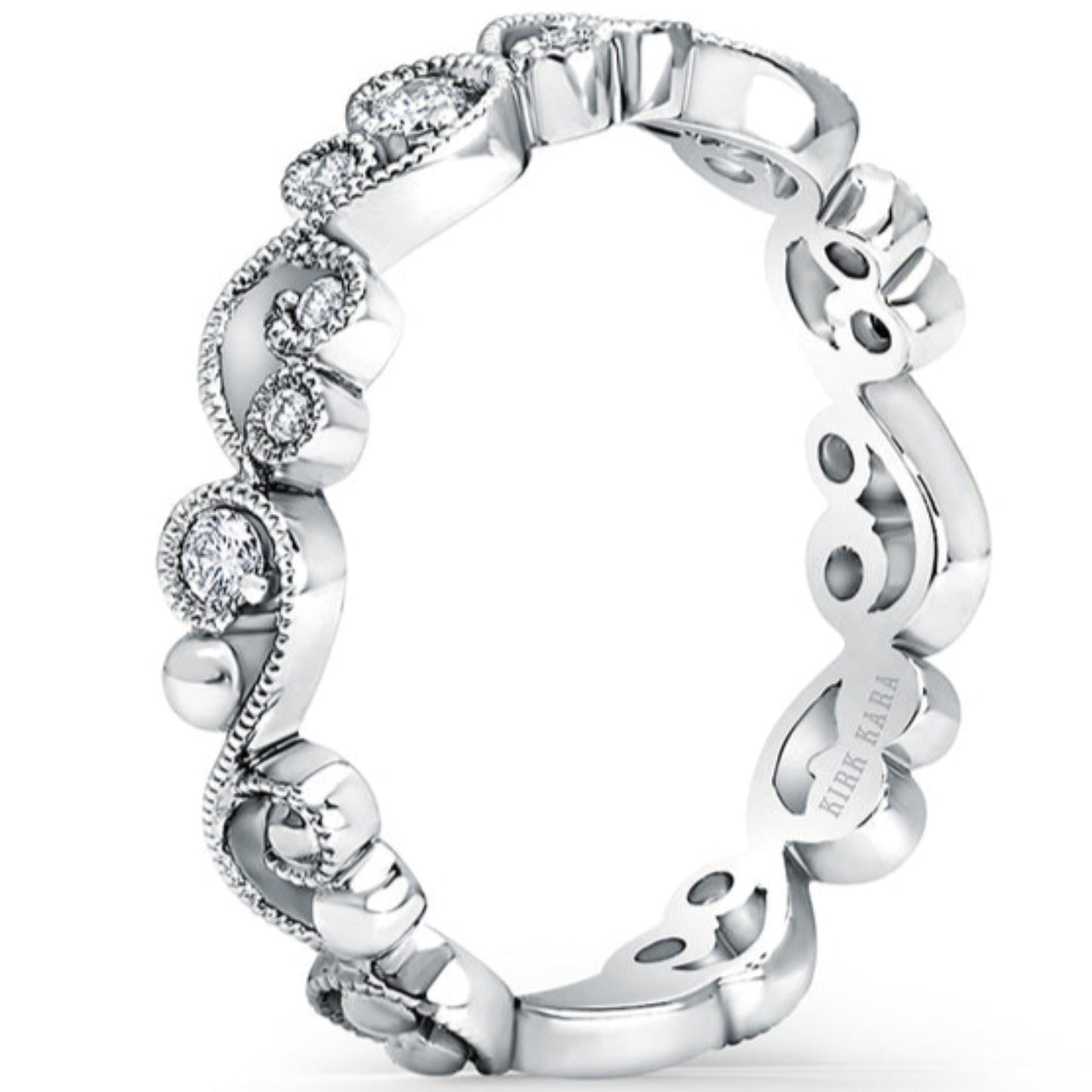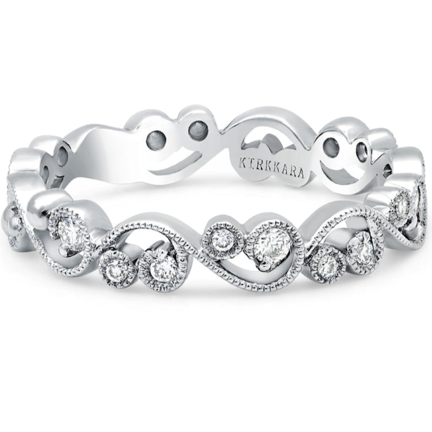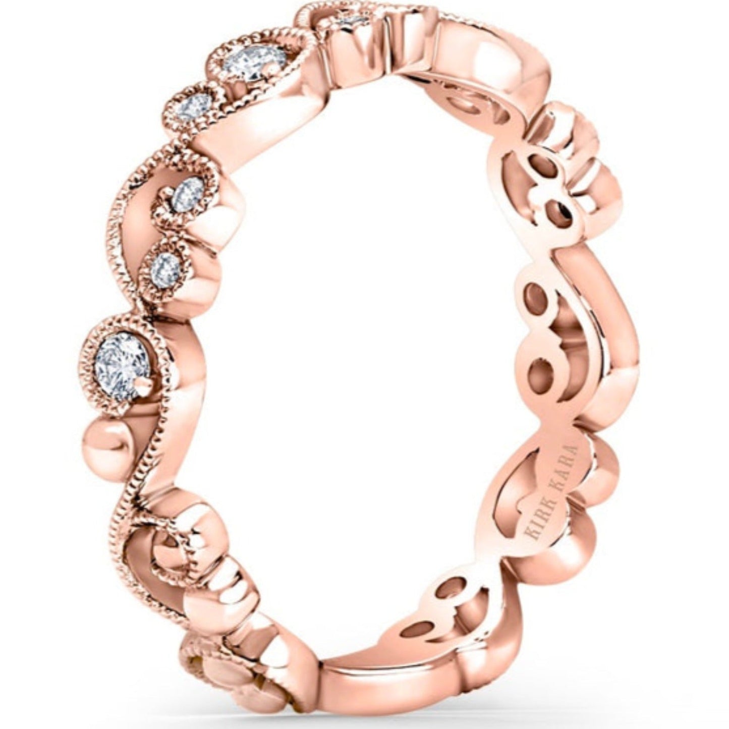 Vintage swirls of twisting and turning with diamonds intertwined in the delicate scrolls make this Kirk Kara wedding band an instant heirloom piece. The ring features 0.18 carats total weight round cut white brilliant diamonds and Kirk Kara's signature milgrain detailing.