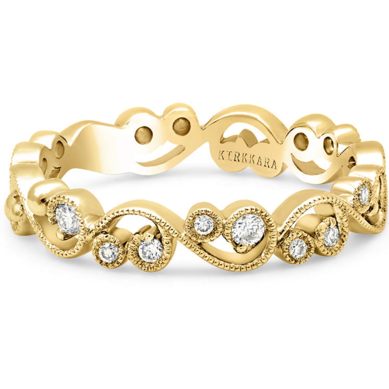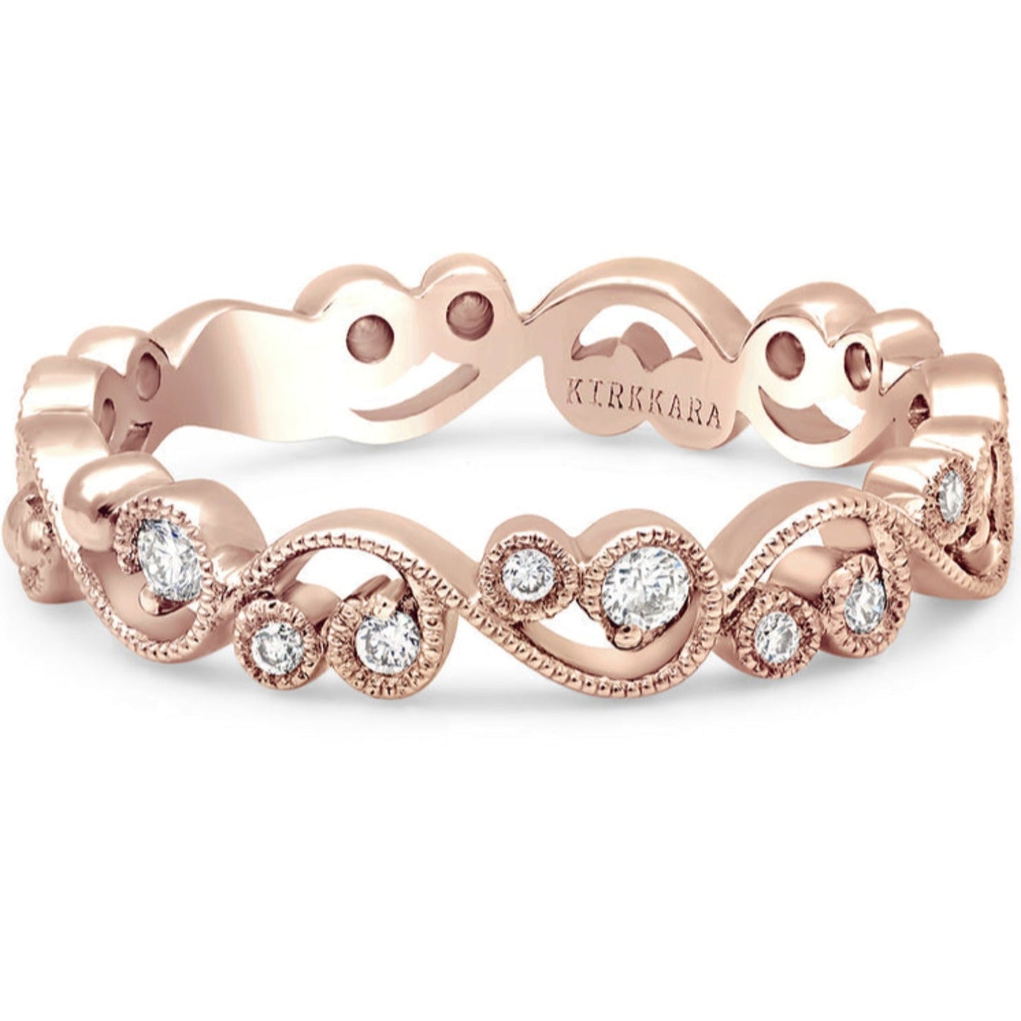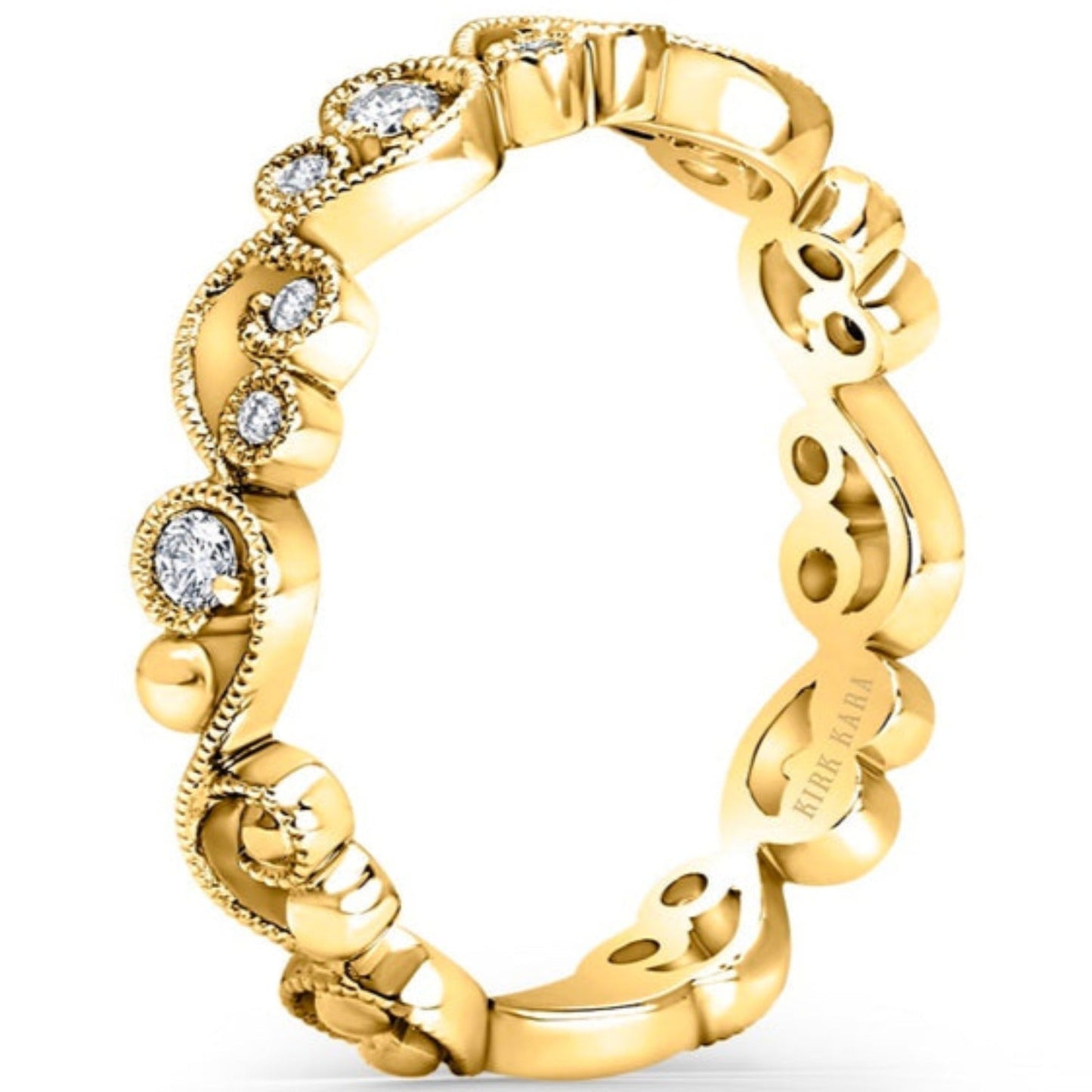 Vintage swirls of twisting and turning with diamonds intertwined in the delicate scrolls make this Kirk Kara wedding band an instant heirloom piece. The ring features 0.18 carats total weight round cut white brilliant diamonds and Kirk Kara's signature milgrain detailing.