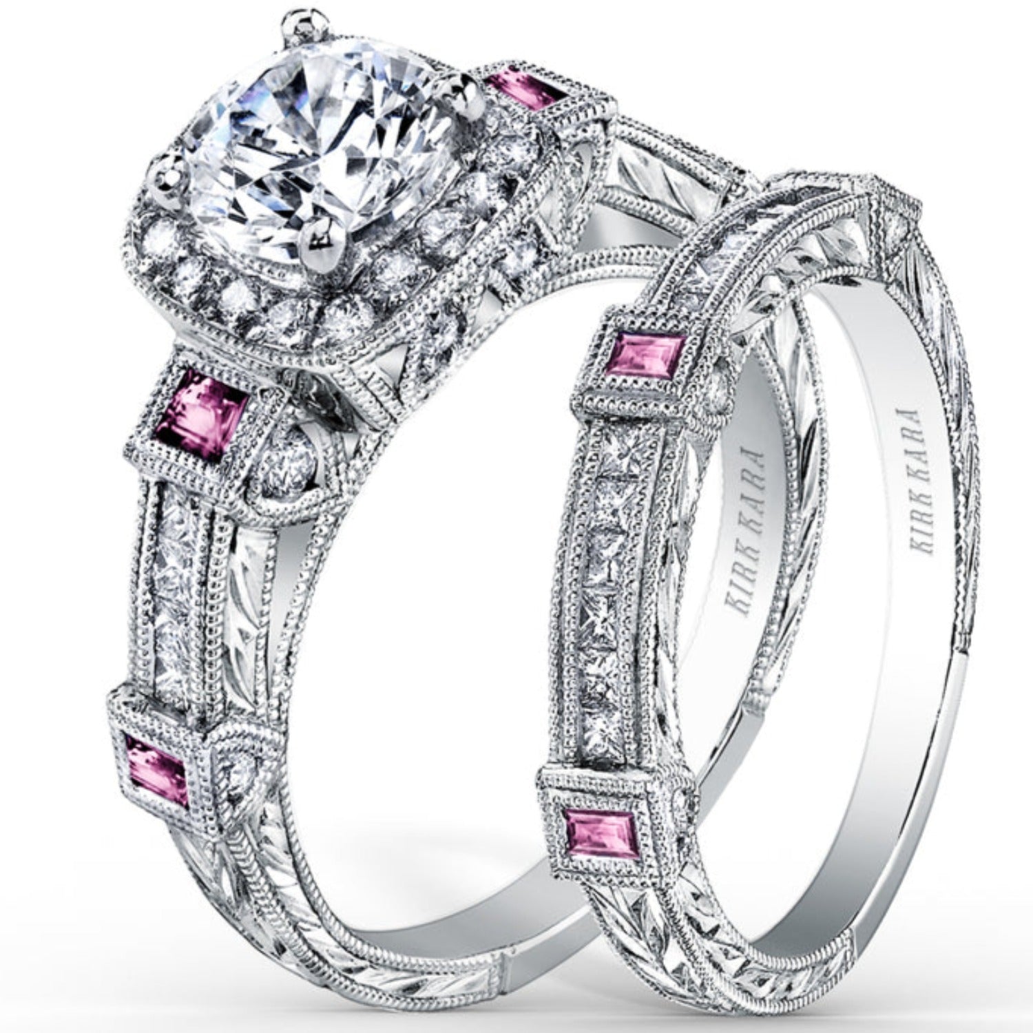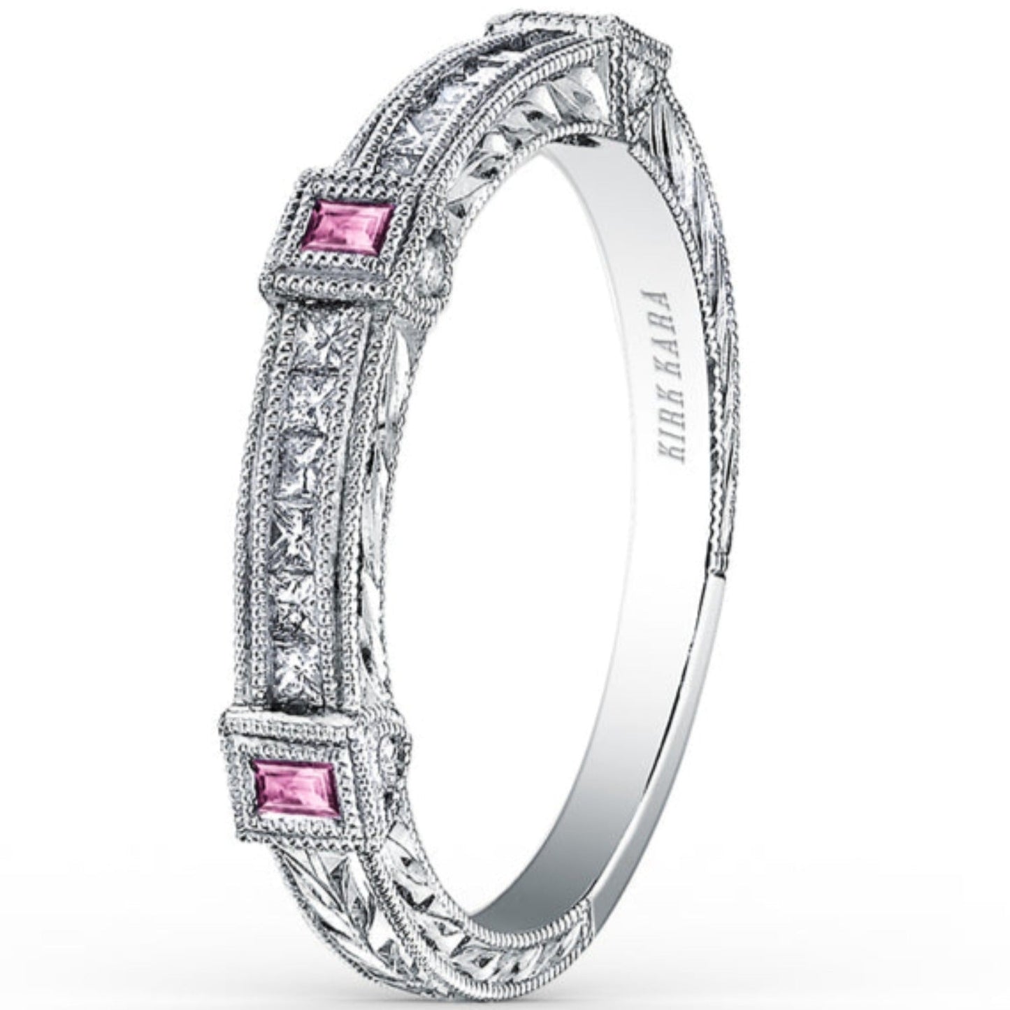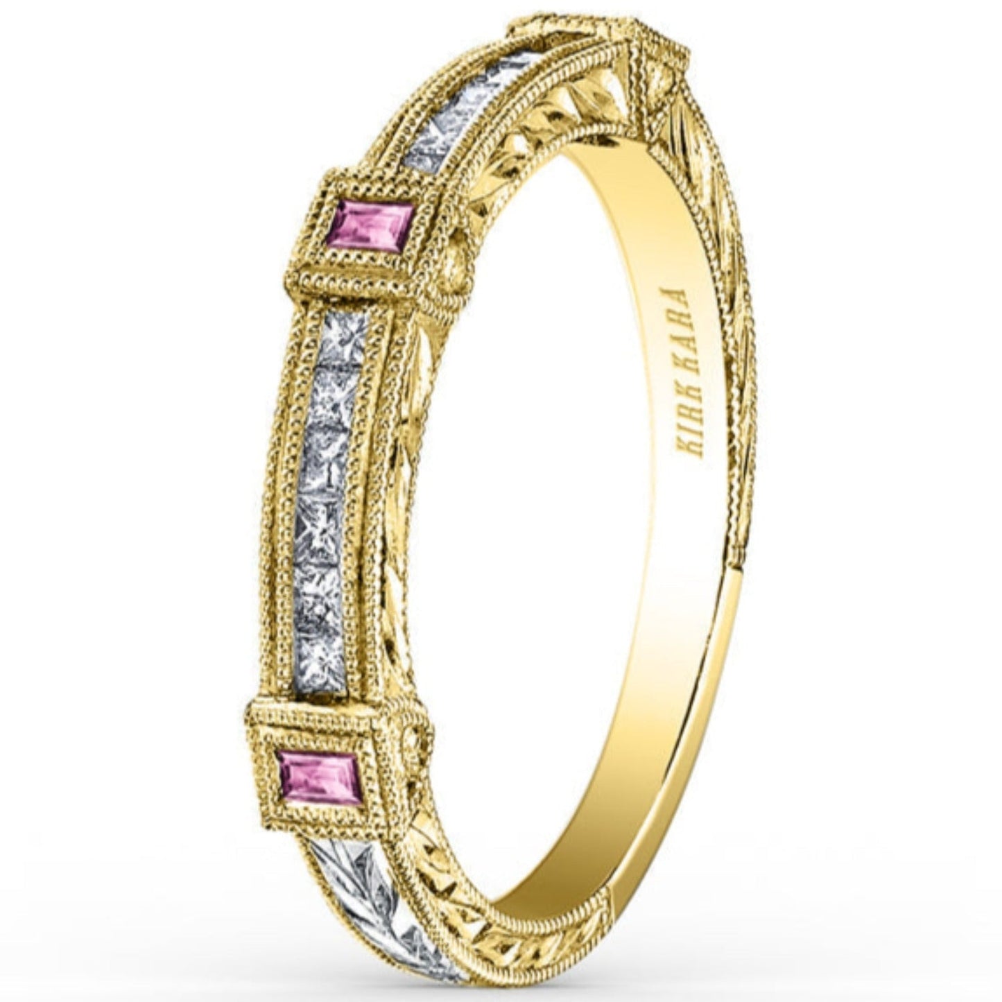 Kirk Kara Hand Engraved Pink Sapphire & Diamond Wedding Ring from the "Carmella" Collection Featuring 0.33 Carats Total Weight Diamonds and 0.25 Carats Total Weight Pink Sapphires