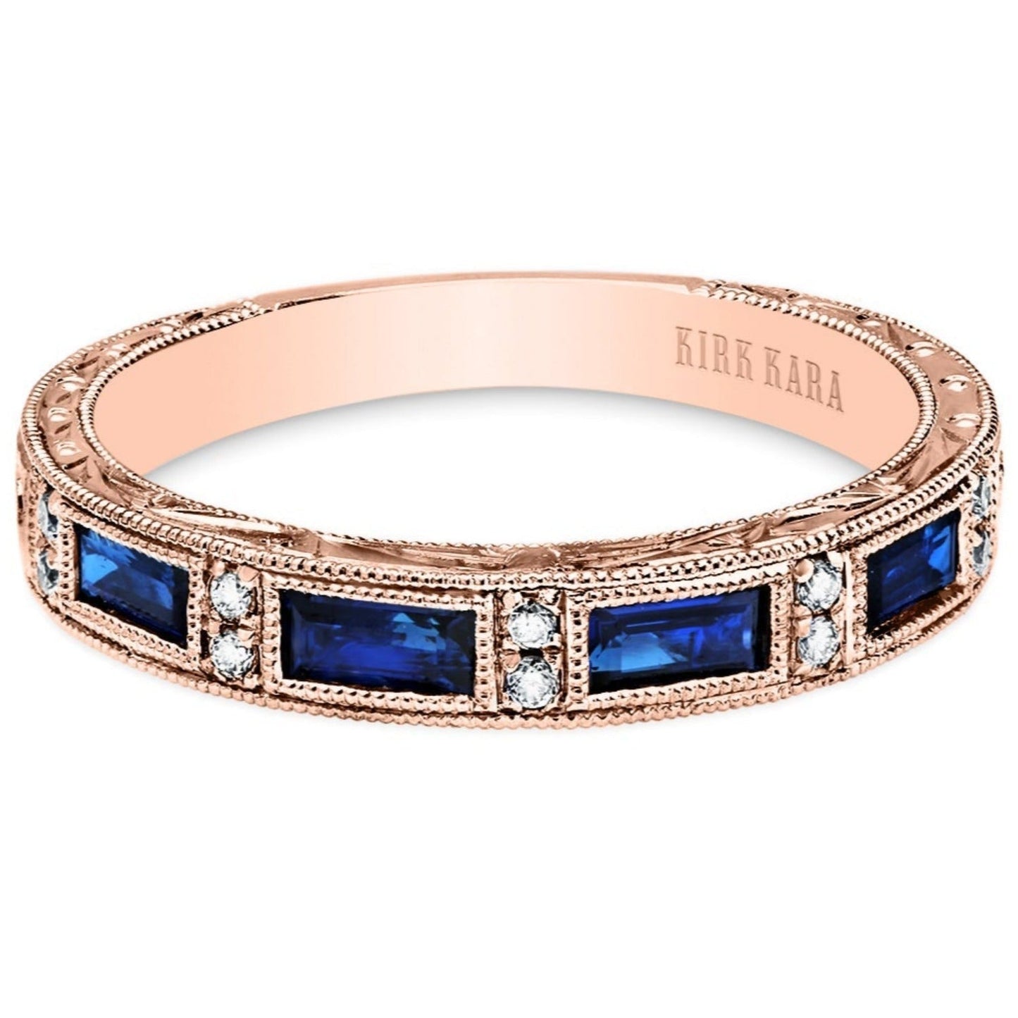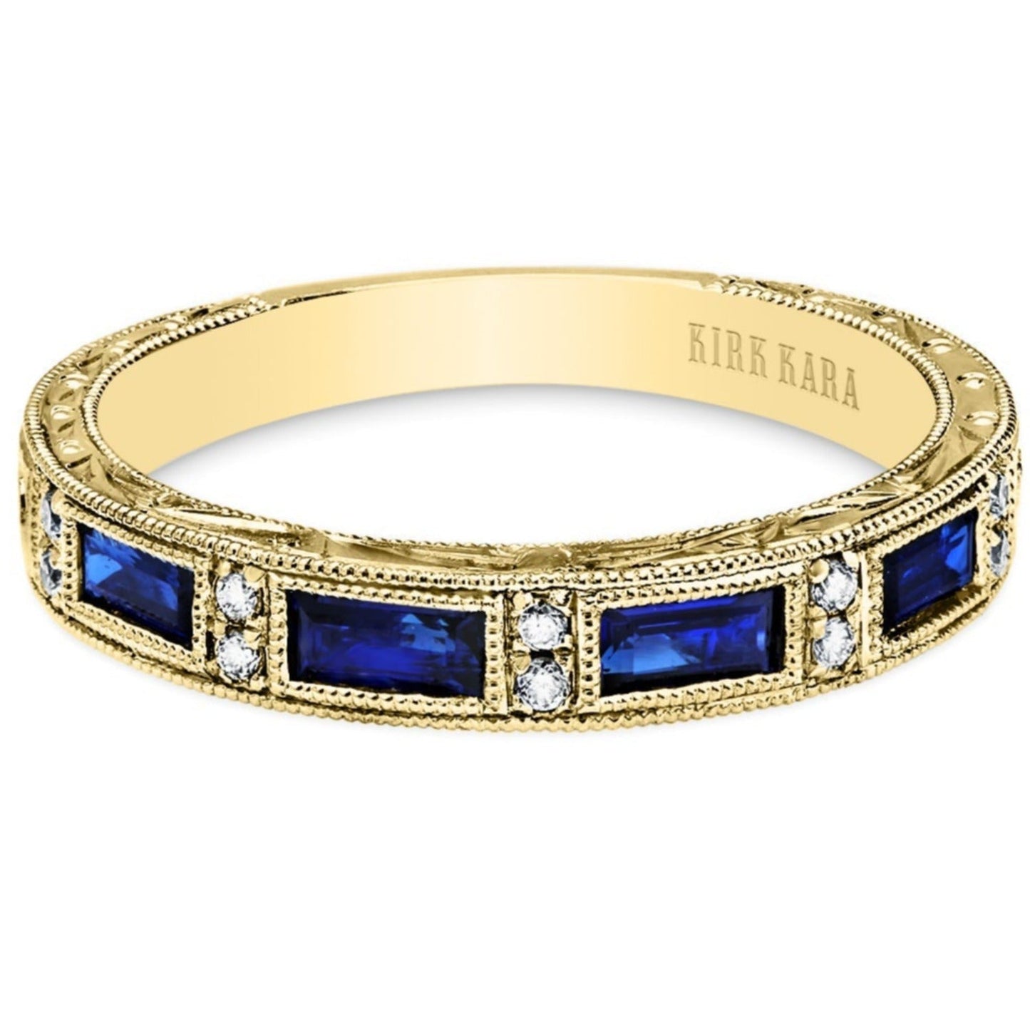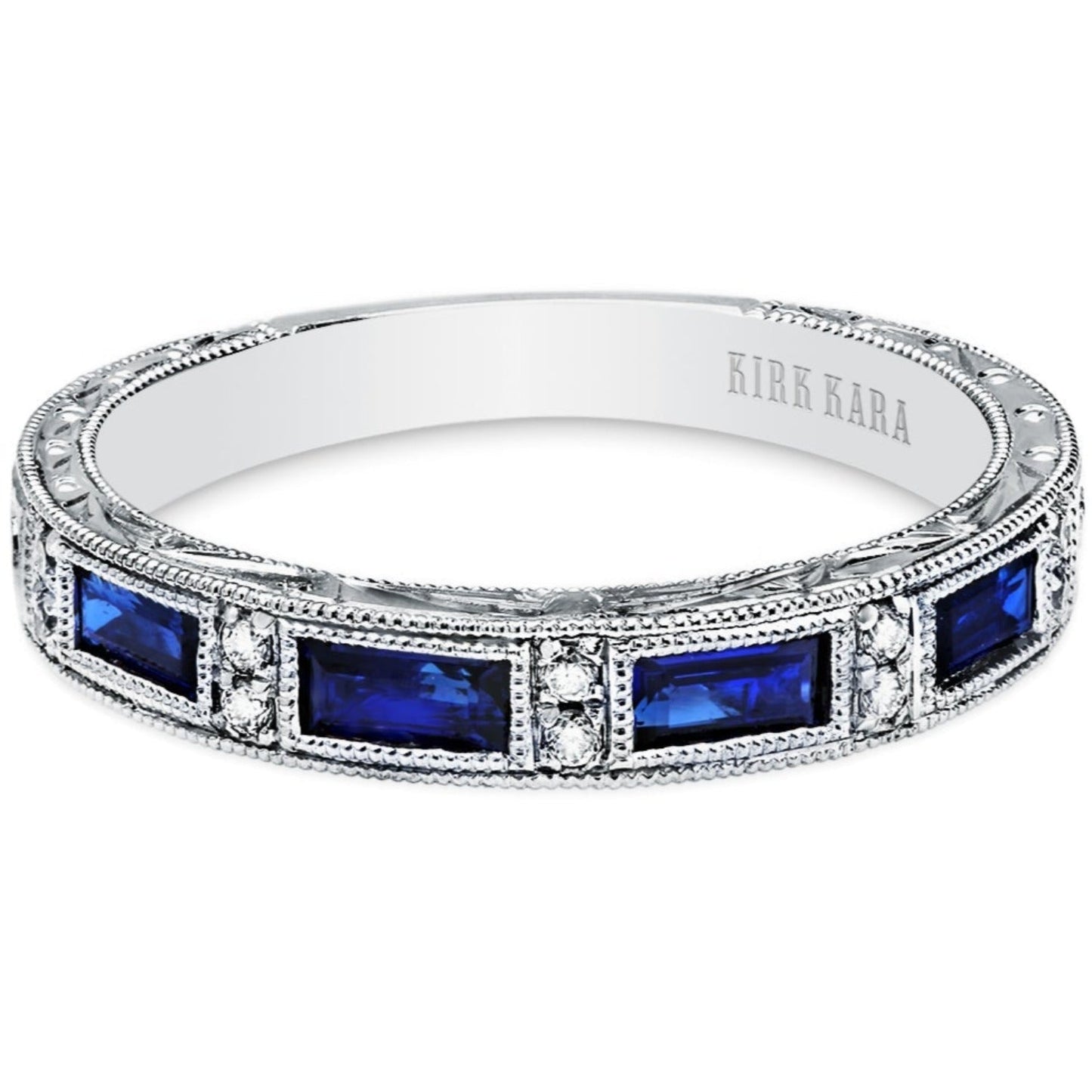 Kirk Kara "Charlotte" Blue Sapphire Baguette Cut Diamond Wedding Band Featuring 0.78 Carats Blue Sapphires and 0.06 Carats Total Weight Round Cut Diamonds with Milgrain Detailing