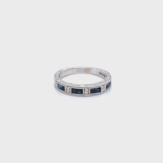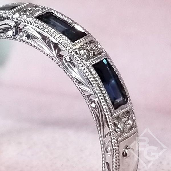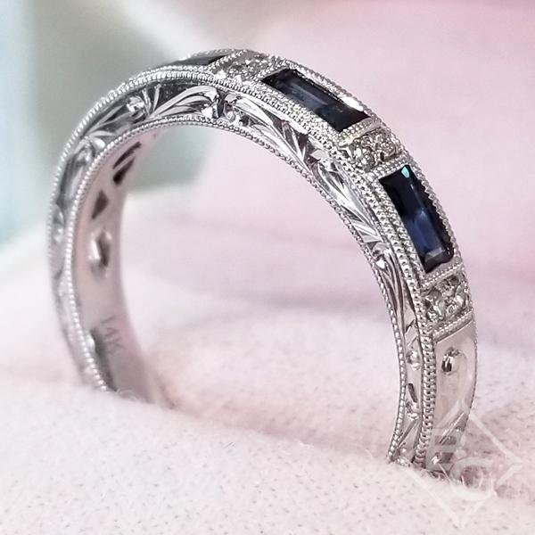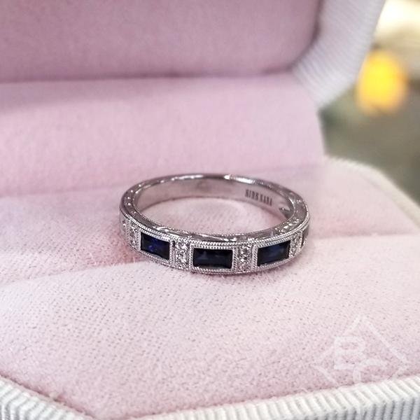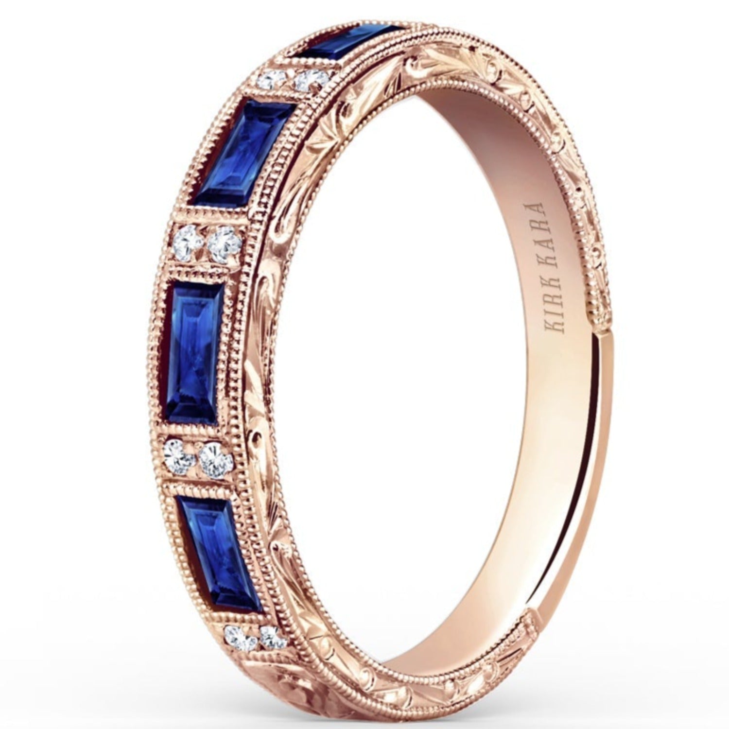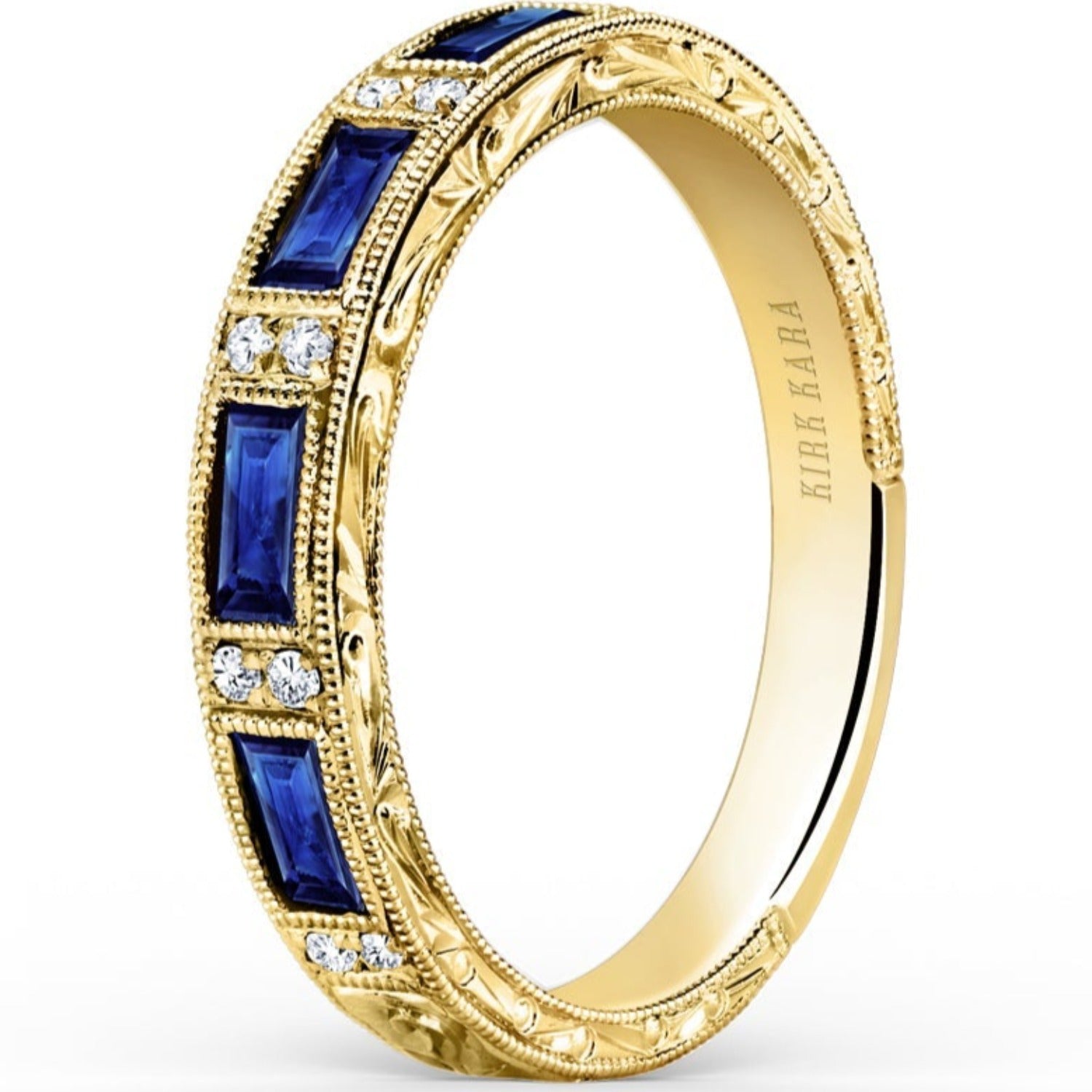 Kirk Kara "Charlotte" Blue Sapphire Baguette Cut Diamond Wedding Band Featuring 0.78 Carats Blue Sapphires and 0.06 Carats Total Weight Round Cut Diamonds with Milgrain Detailing