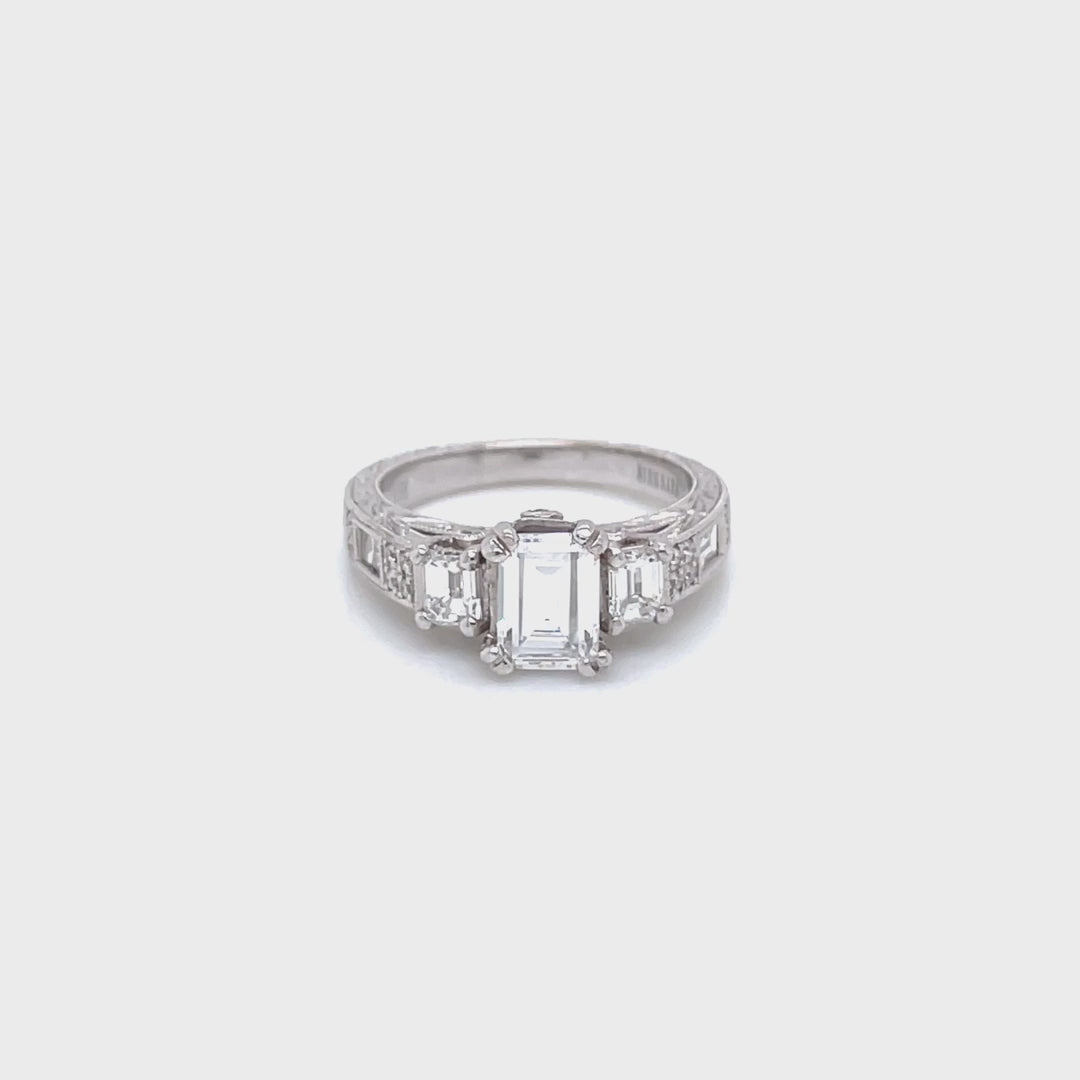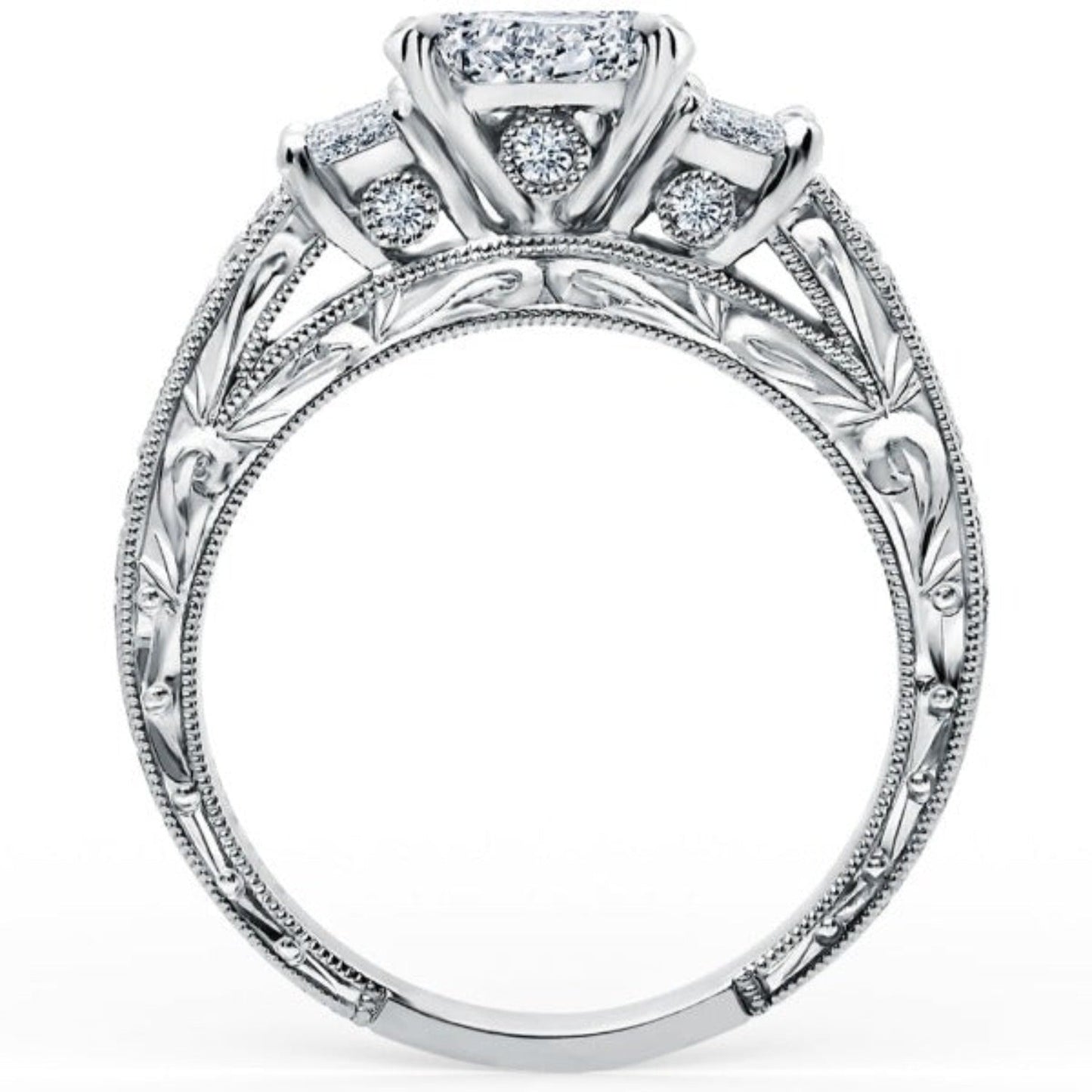 Looking for a diamond engagement ring fit for a queen? Look no further than this emerald-cut, three stone diamond beauty! Hand-engraved scroll details, milgrain edging, peek-a-boo diamonds, and meticulous craftsmanship set this ring apart from the others with 0.80-carats total diamond weight. Diamonds are VS2-S11 clarity and G/H color. It’s one of our most popular designs and it’s no wonder why. It received the 2012 Jewelers Choice Winner for "Best Bridal Design," as voted by the fine jewelry stores across the world. The art-deco inspired design features a center 1.75-carat emerald-cut sparkler (sold separately-measures approx 8 mm x 6 mm) shown here, but you can choose any size or shape diamond from our extensive, hand-picked loose diamond collection. Or consider a sapphire, ruby, moissanite or another gemstone for the center stones. Kirk Kara’s matching Charlotte wedding band (sold separately) can extend the beauty of the milgrain detailing, featuring 0.42-carats total weight baguette-cut diamonds and 0.08-carats total weight round-cut diamonds. Choose the metal color and strength desired - platinum, or 14K & 18K white, yellow or rose gold - and make this ring uniquely yours.