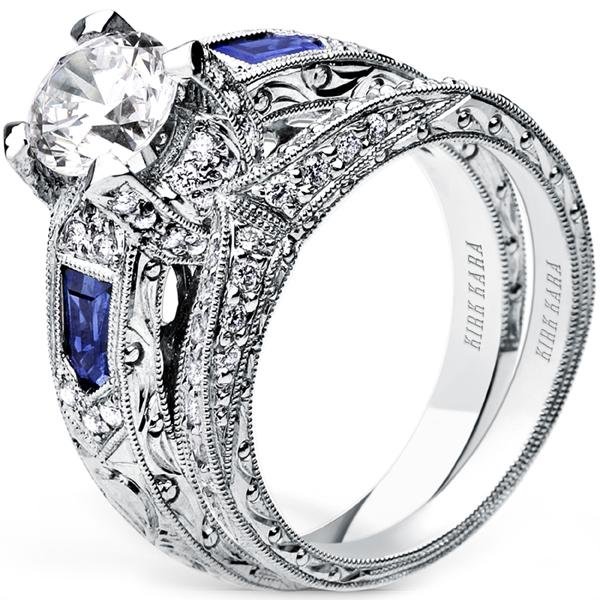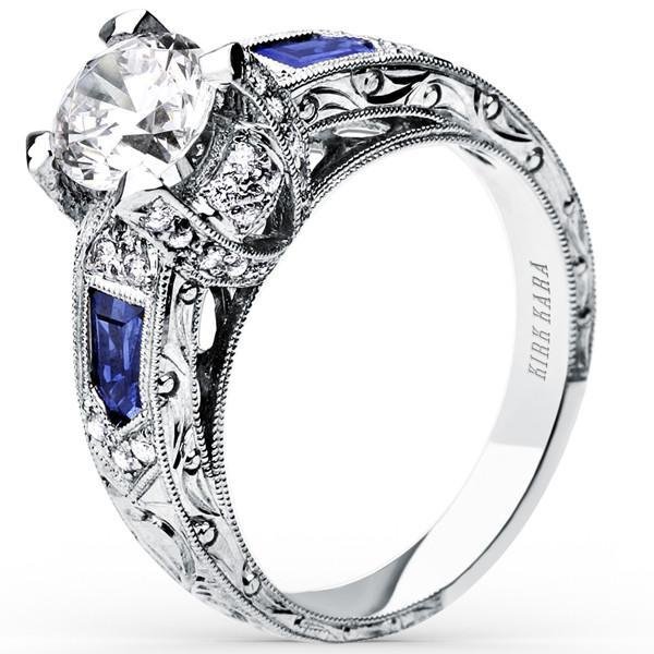 This Deco Inspired Classic is an Artistic Design from the Charlotte Collection. Kirk Kara's "Charlotte" Blue Sapphire Diamond Engagement Ring Features Diamonds and Two Blue Sapphires with Scroll Hand Engravings and Milgrain Edging