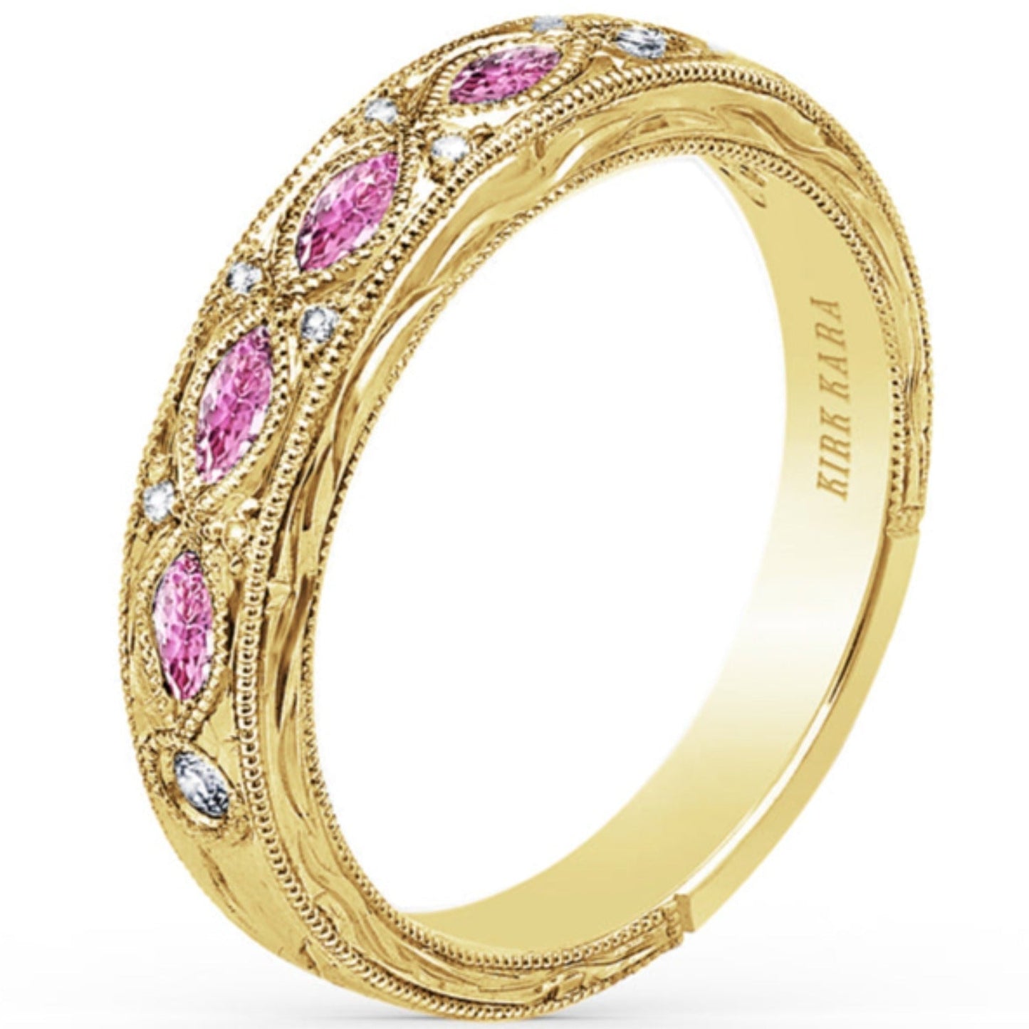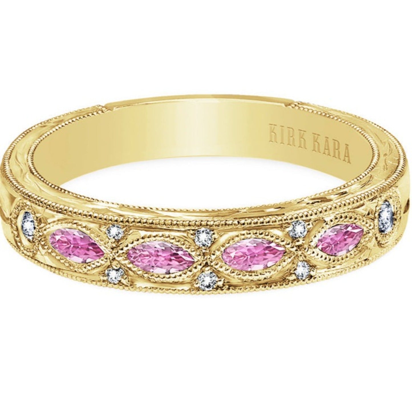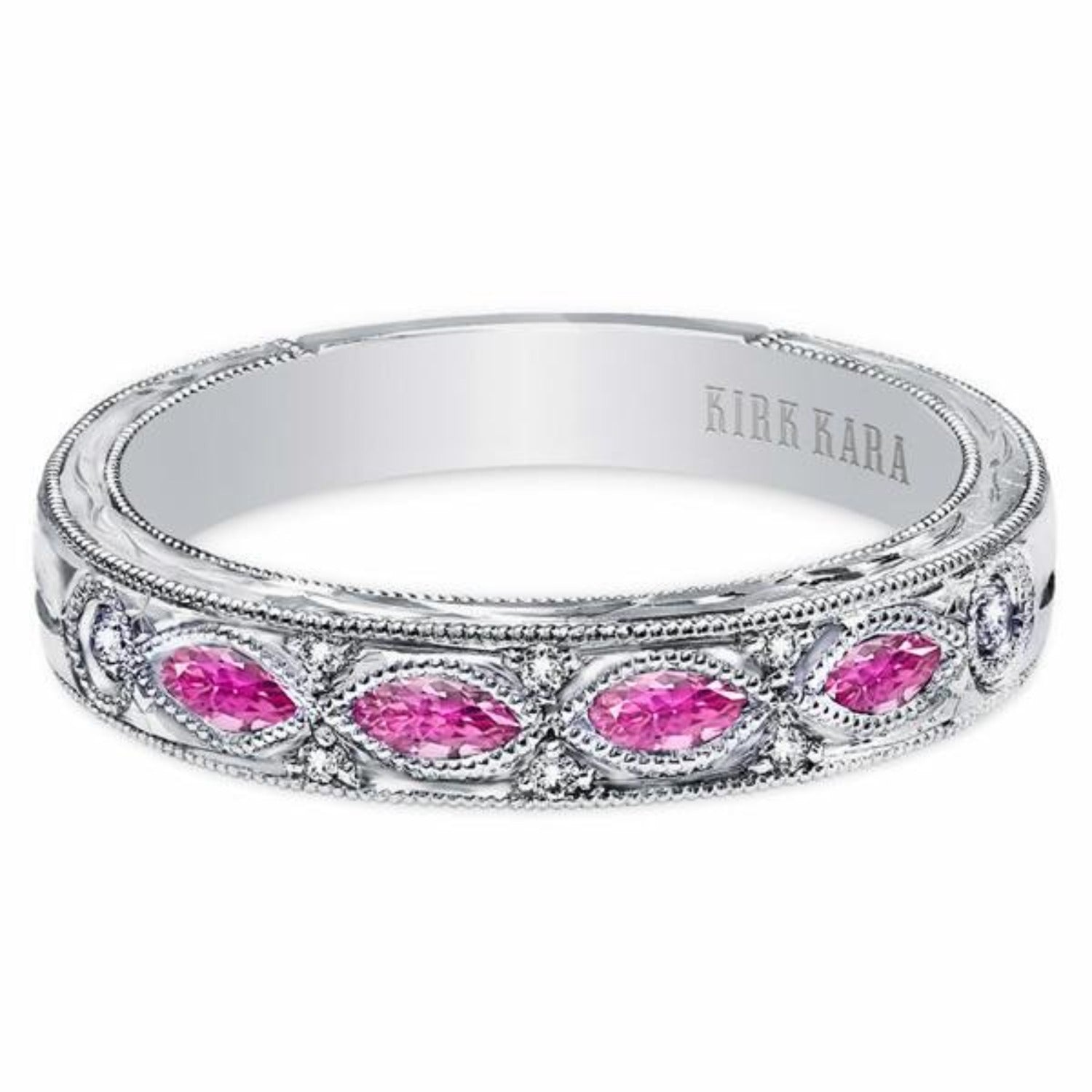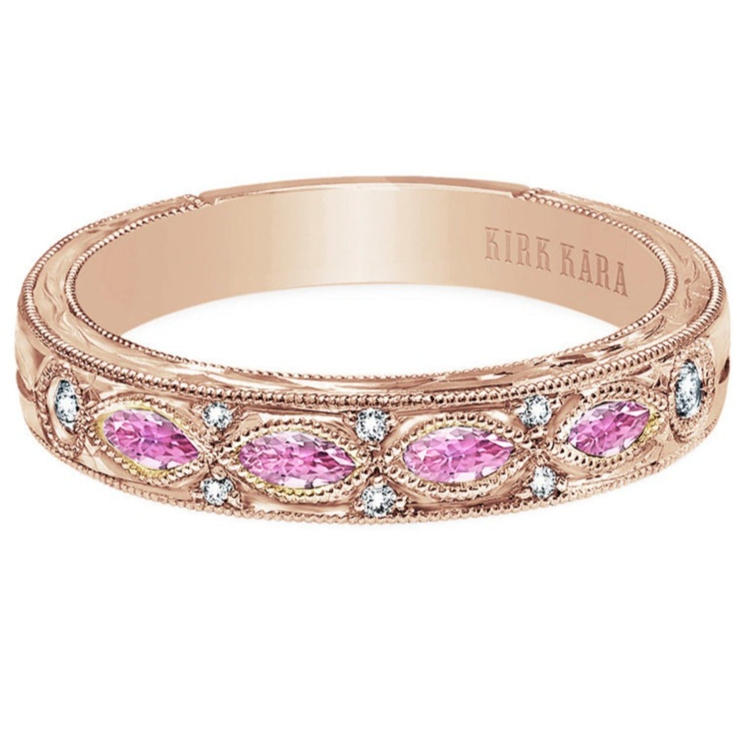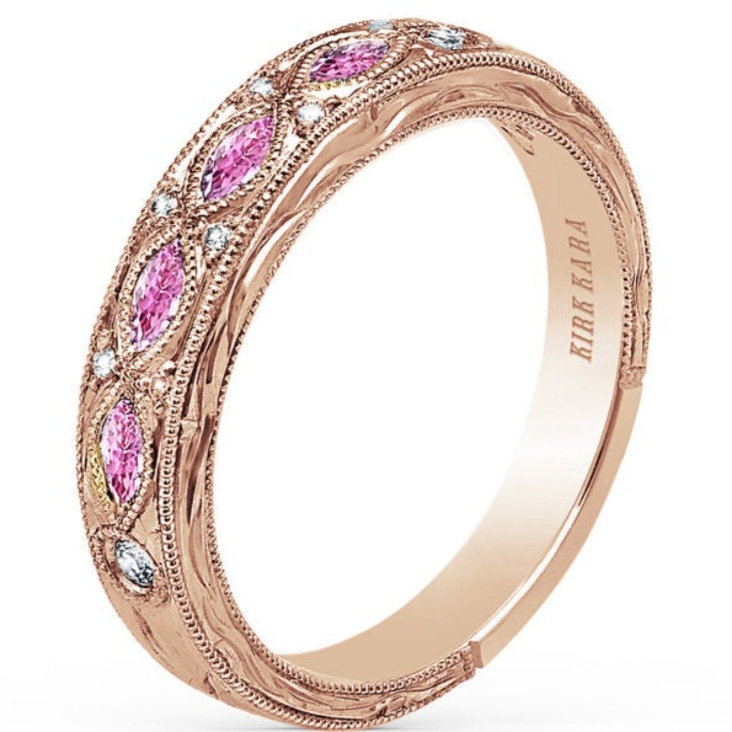 Kirk Kara "Dahlia" Wedding Band Featuring 0.08 Carats Total Weight Diamonds and 0.35 Carats Pink Marquise Sapphires with Milgrain Edging