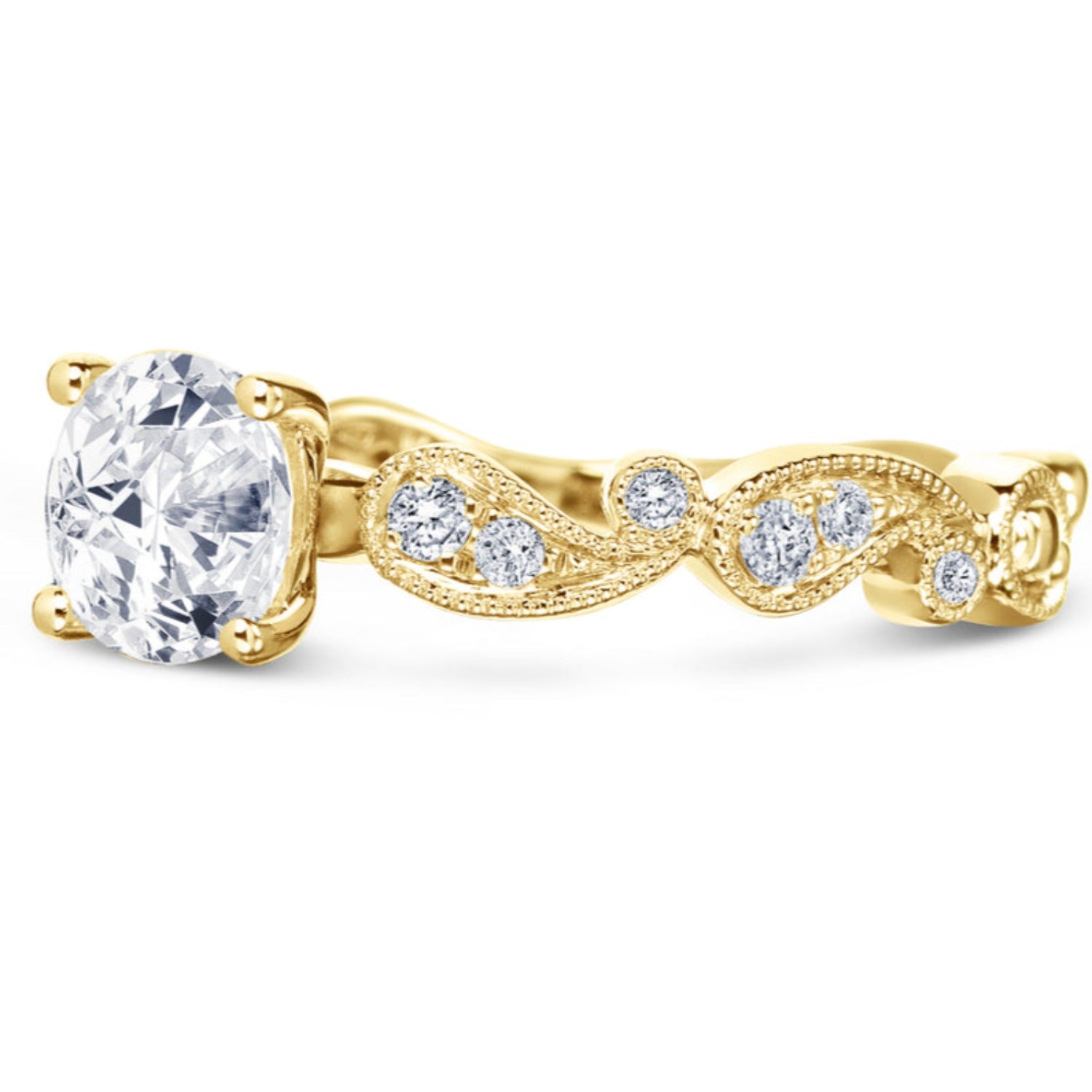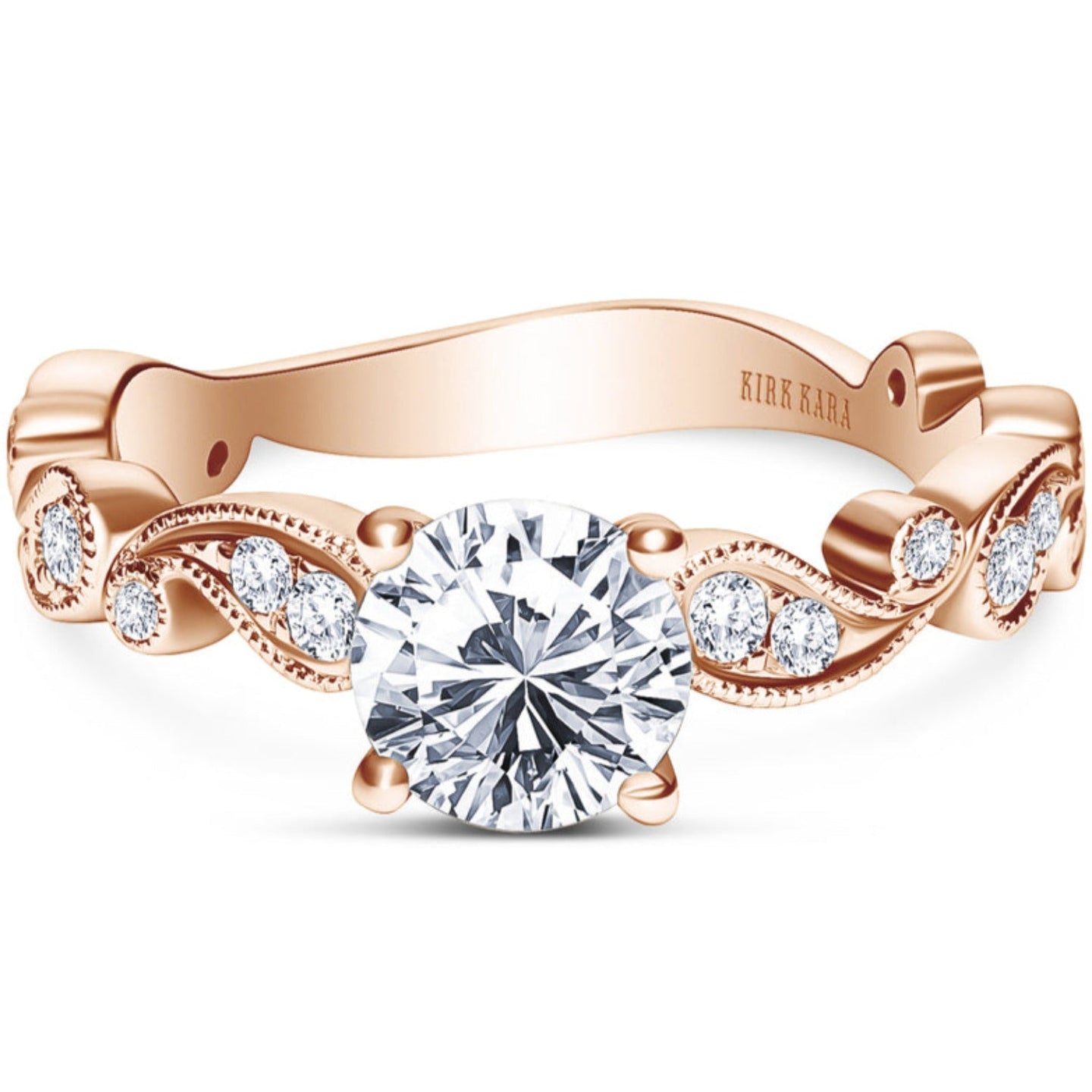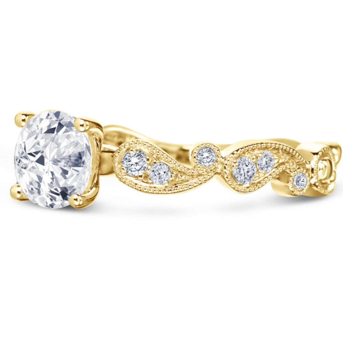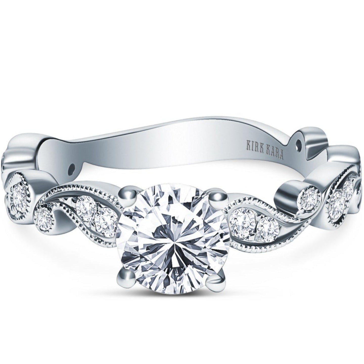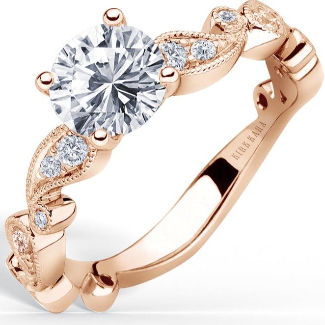 This vintage style diamond engagement ring from the Rayana collection features two fluid paisley swirls, one on each side of the center stone. Set inside the paisley swirls are 1/6 carats total weight of round cut diamonds featuring Kirk Kara's signature handcrafted milgrain detailing around the swirls as well as on the shank of the ring.