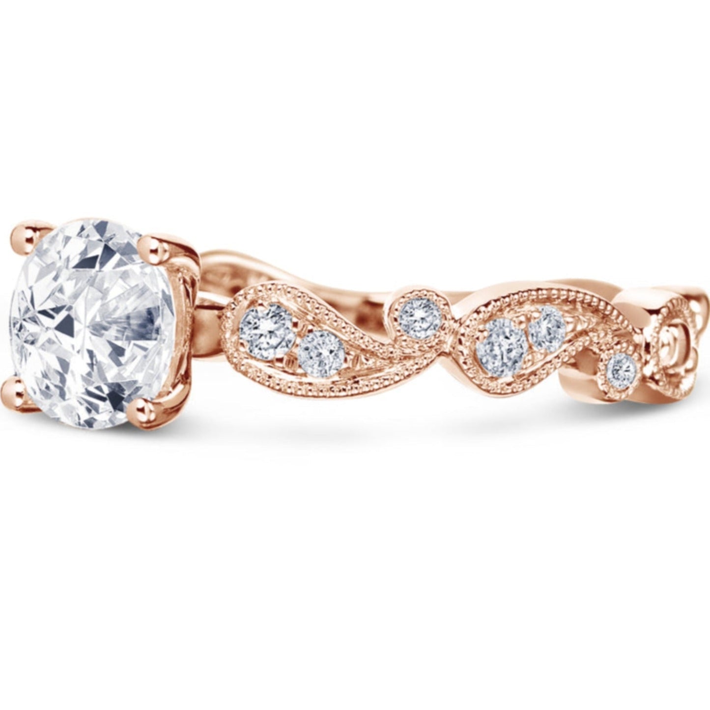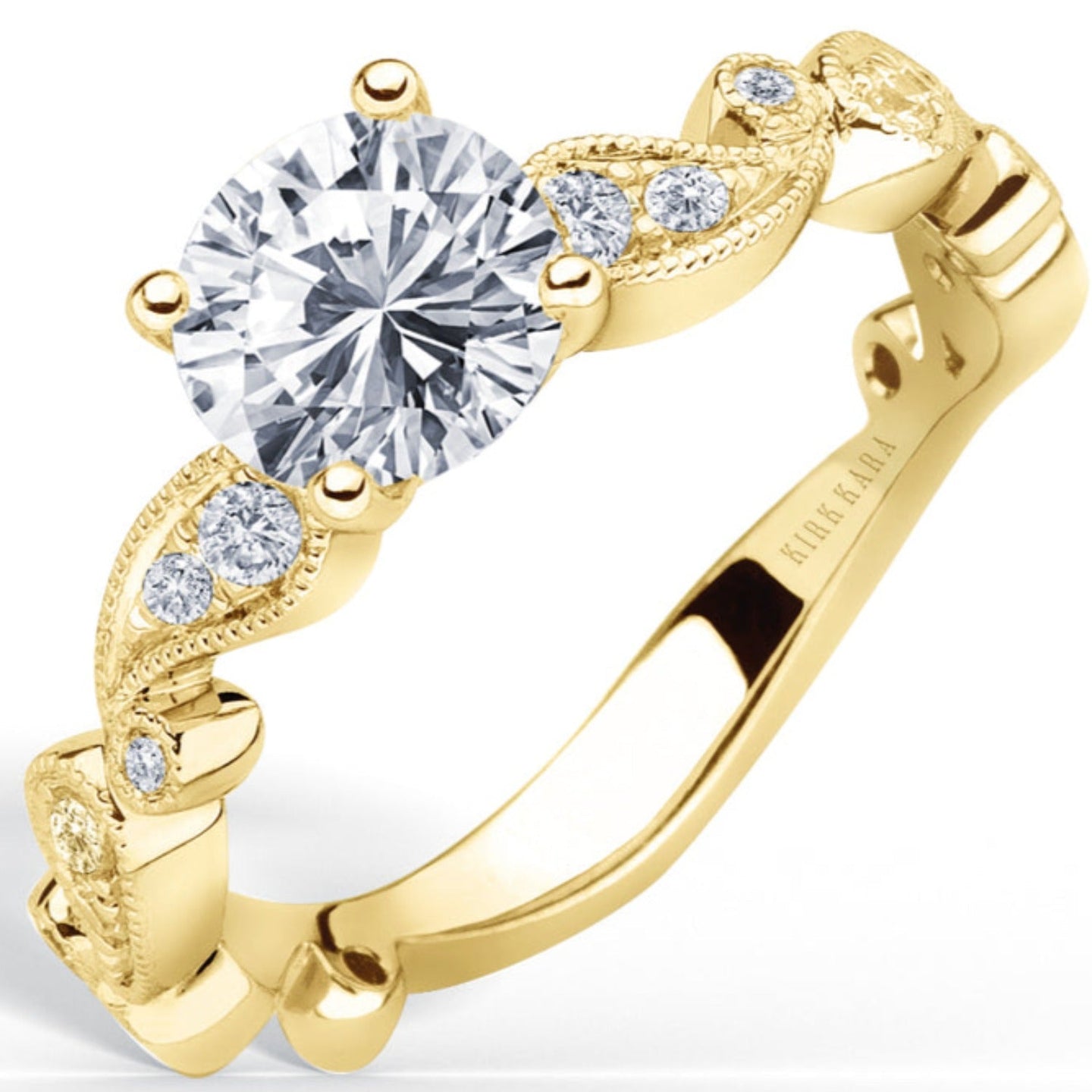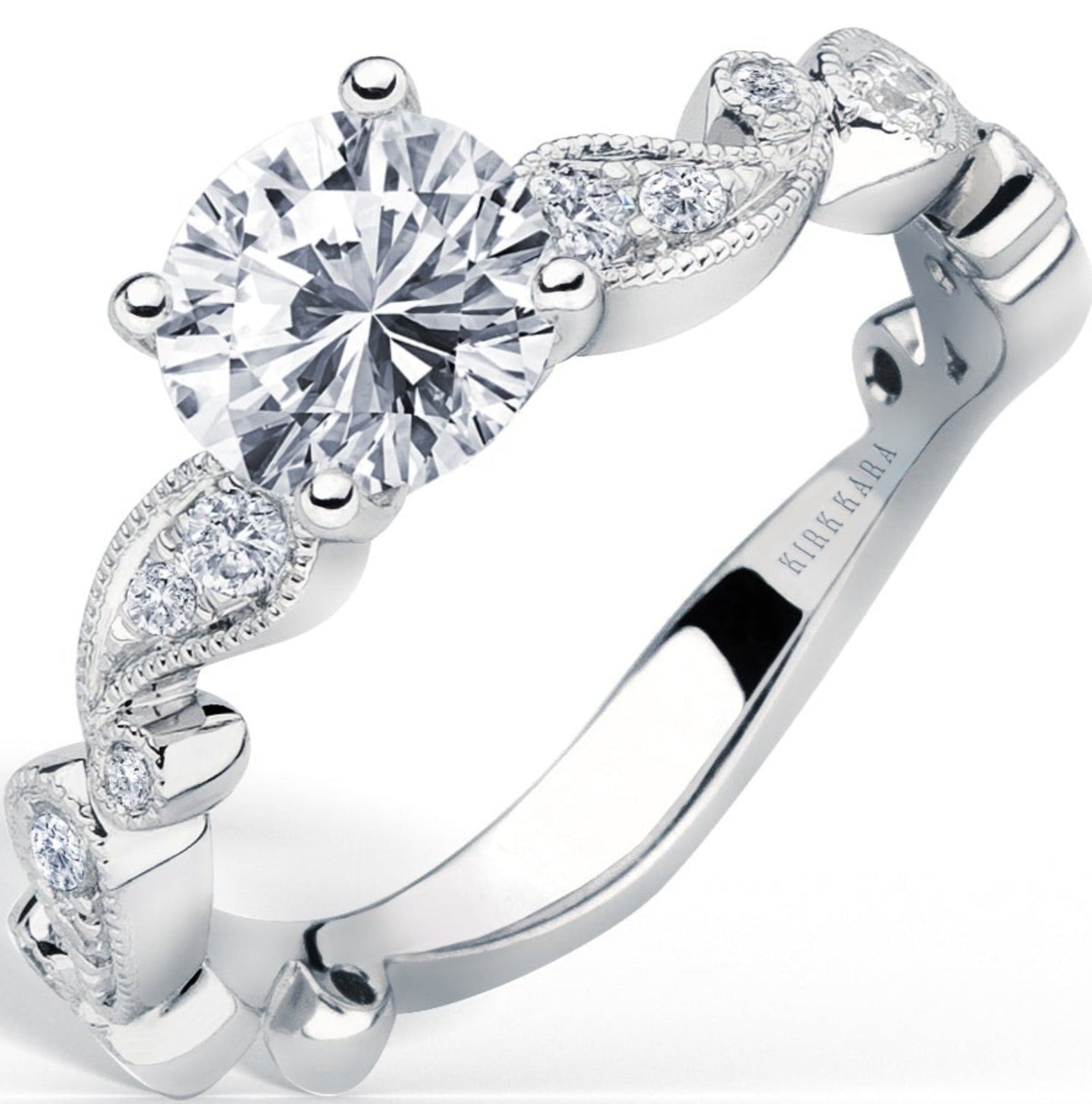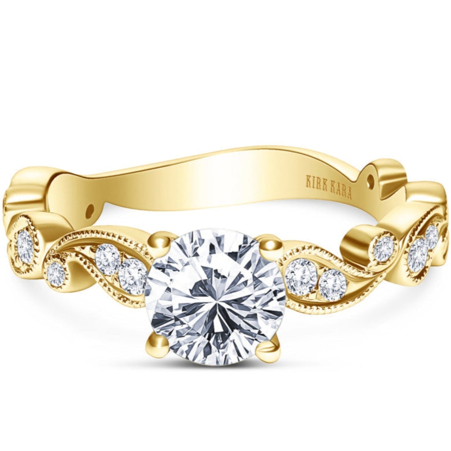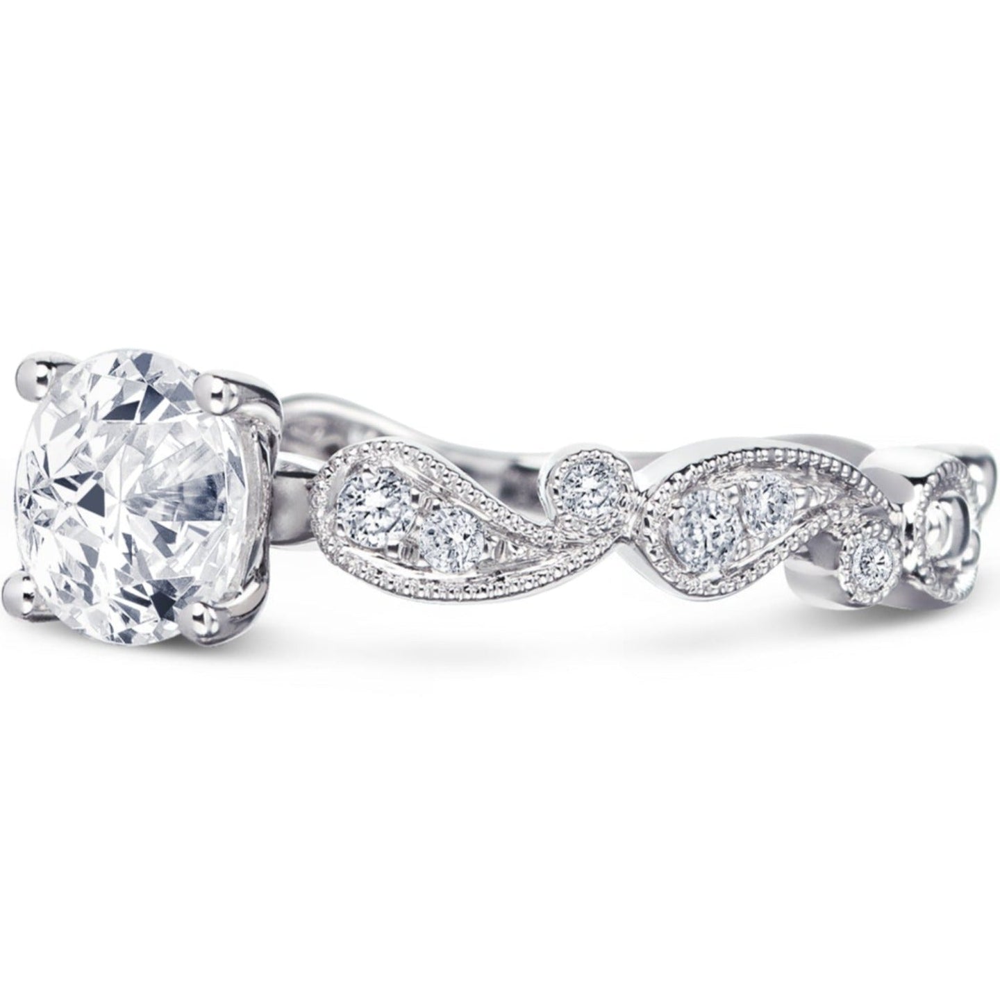 This vintage style diamond engagement ring from the Rayana collection features two fluid paisley swirls, one on each side of the center stone. Set inside the paisley swirls are 1/6 carats total weight of round cut diamonds featuring Kirk Kara's signature handcrafted milgrain detailing around the swirls as well as on the shank of the ring.