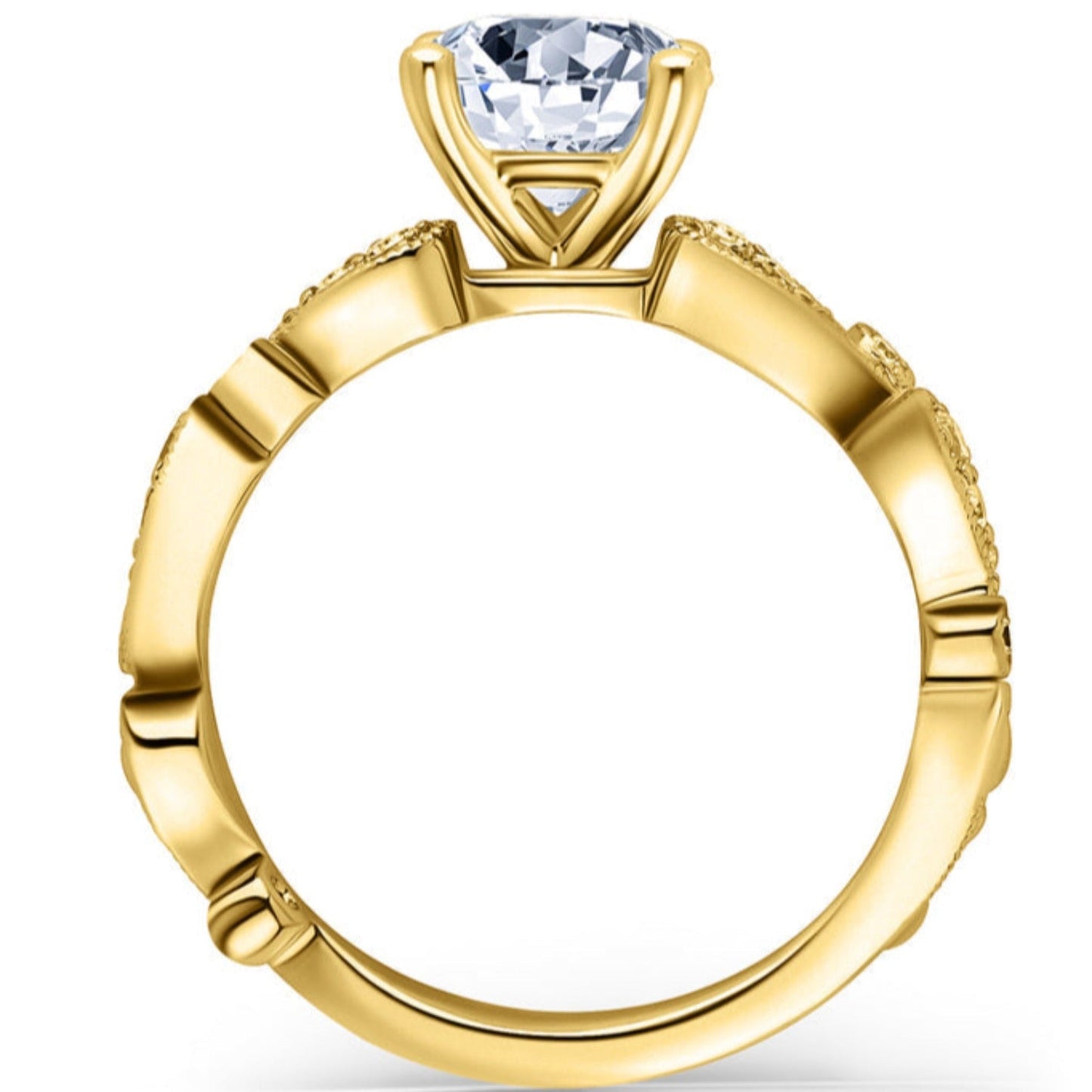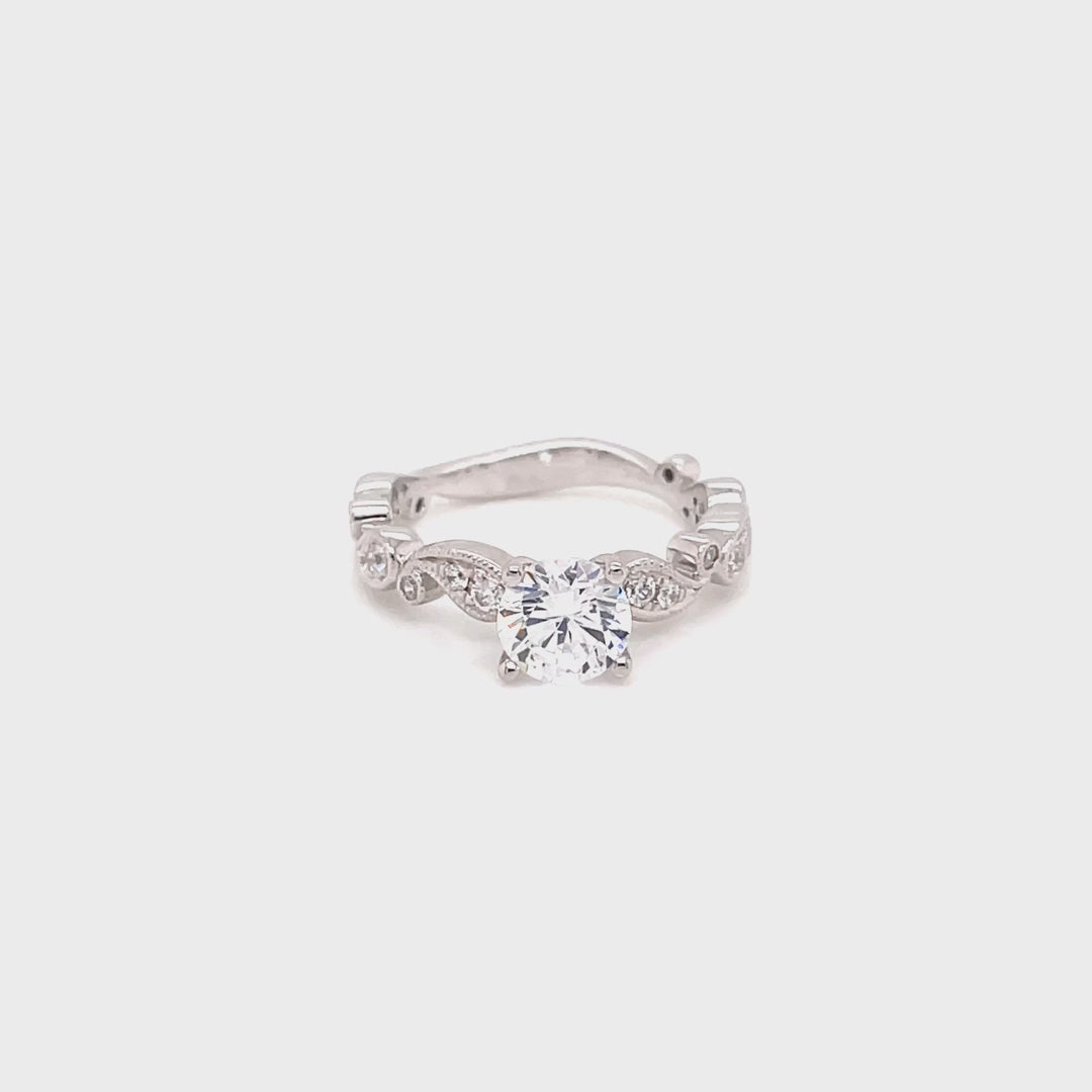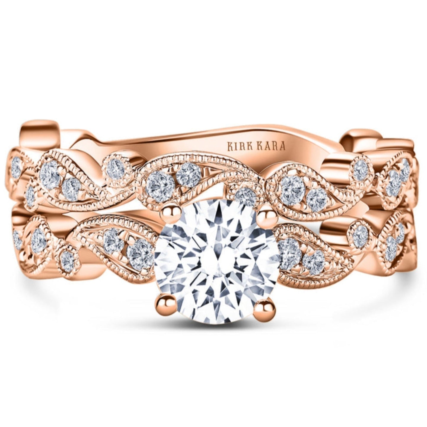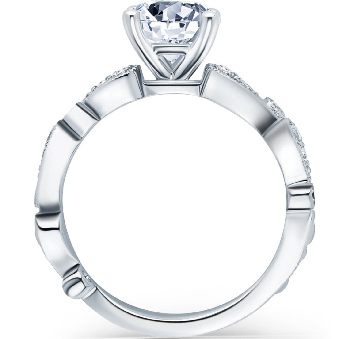 This vintage style diamond engagement ring from the Rayana collection features two fluid paisley swirls, one on each side of the center stone. Set inside the paisley swirls are 1/6 carats total weight of round cut diamonds featuring Kirk Kara's signature handcrafted milgrain detailing around the swirls as well as on the shank of the ring.