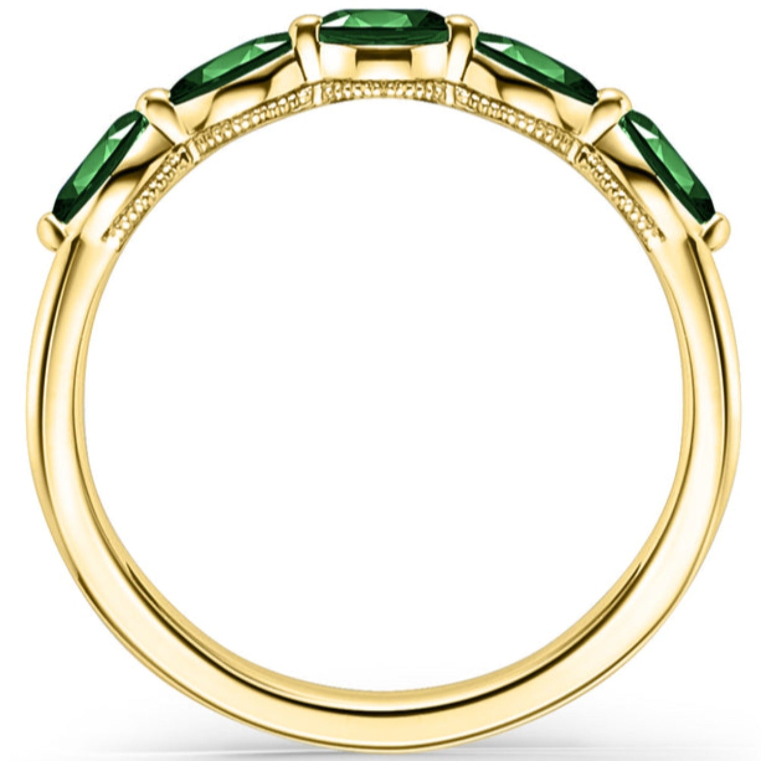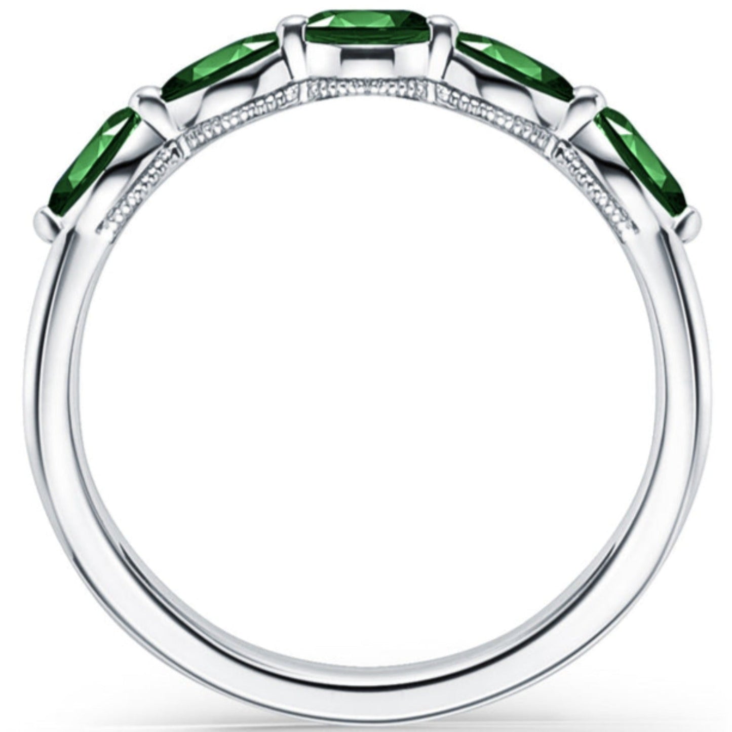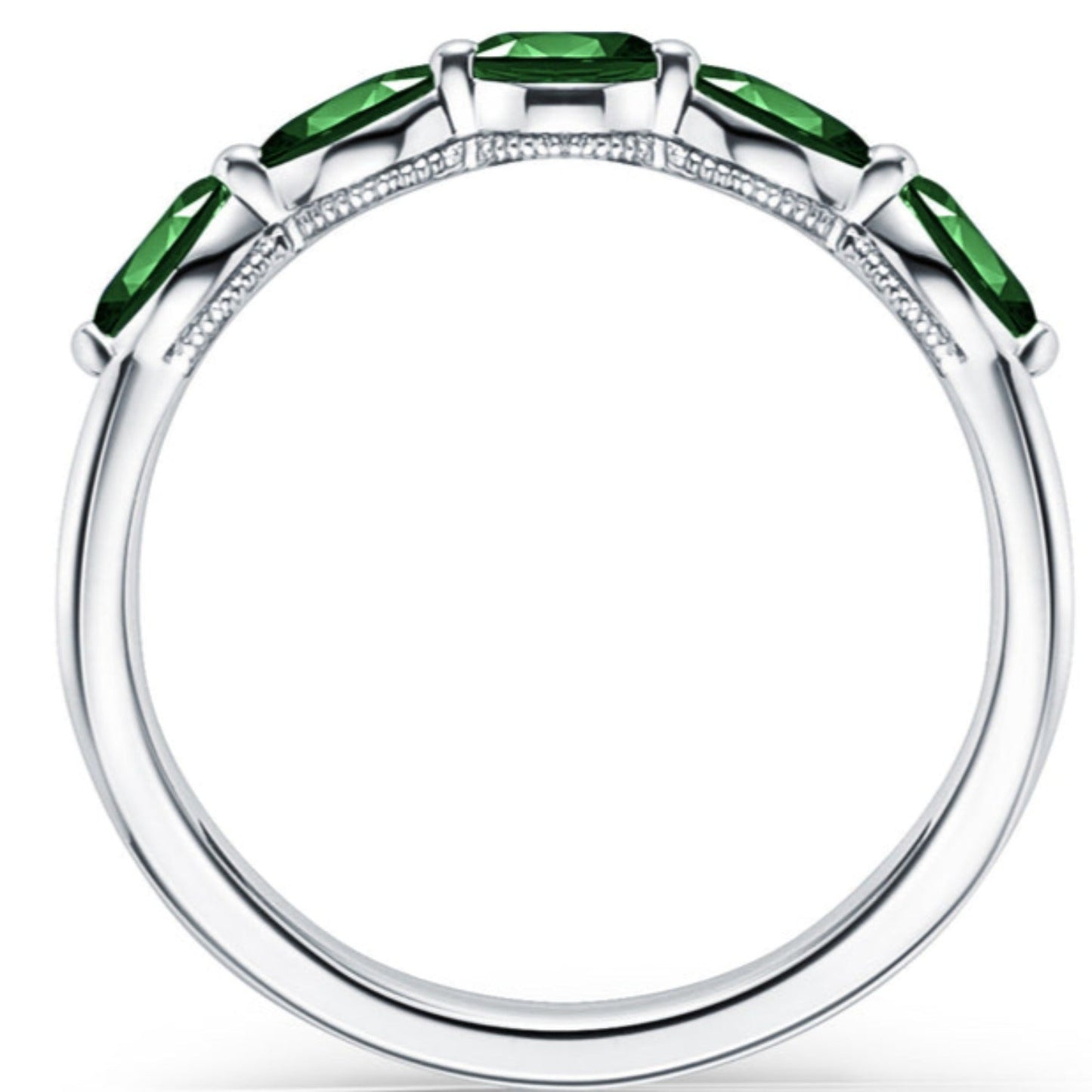 This exquisite east-west set green tsavorite marquise cut gemstone wedding band features five marquise cut tsavorites, creating a harmonious blend of sophistication and vibrancy.