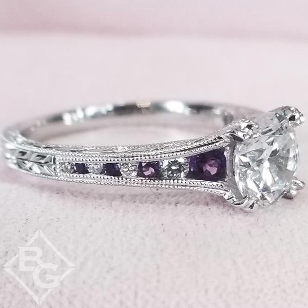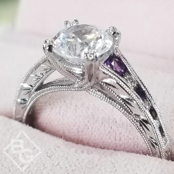 Kirk Kara "Stella" Purple Amethyst Channel Set Tapered Diamond Engagement Ring Featuring 0.08 Carats Total Weight Diamonds and Eight Purple Amethyst Gemstones with Milgrain & Hand Engraved Details