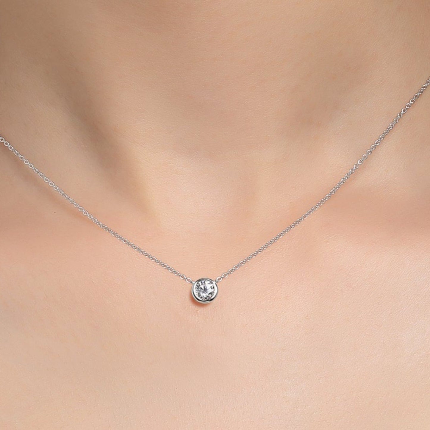 Timeless classics for everyday wear. This necklace is bezel-set with one 0.46 carat round cut Lafonn signature Lassaire simulated diamond in sterling silver bonded with platinum.