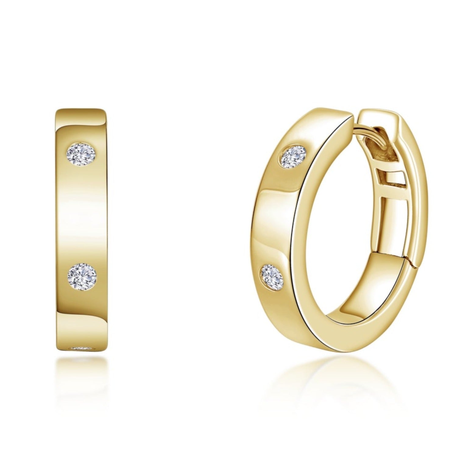 Each of these huggie earrings features evenly spaced Lafonn's signature Lassaire simulated round cut diamonds, invisible set flush into the metal. The earrings are in sterling silver using Lafonn's exclusive TR Yellow Gold, a new and improved plating process that preserves the rich color of gold and enhances the wearability of our gold-plated styles.